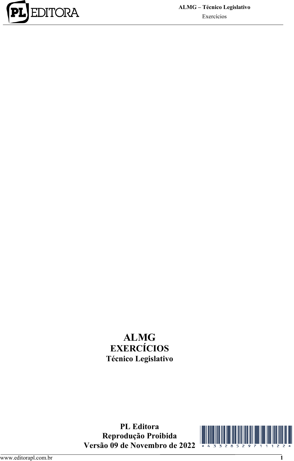 <p>ALMG – Técnico Legislativo</p><p>Exercícios</p><p>www.editorapl.com.br 1</p><p>ALMG</p><p>EXERCÍCIOS</p><p>Técnico Legislativo</p><p>PL Editora</p><p>Reprodução Proibida</p><p>Versão 09 de Novembro de 2022</p><p>CLIVIA NASCIMENTO - 096.194.356-48</p><p>ALMG – Técnico Legislativo</p><p>Exercícios</p><p>www.editorapl.com.br 2</p><p>CLIVIA NASCIMENTO - 096.194.356-48</p><p>ALMG – Técnico Legislativo</p><p>Exercícios</p><p>www.editorapl.com.br 3</p><p>SUMÁRIO</p><p>LÍNGUA PORTUGUESA E INTERPRETAÇÃO DE TEXTOS .................................................................. 5</p><p>REDAÇÃO OFICIAL ...................................................................................................................................... 43</p><p>DIREITO CONSTITUCIONAL .................................................................................................................... 49</p><p>DIREITO ADMINISTRATIVO ..................................................................................................................... 55</p><p>LICITAÇÃO ..................................................................................................................................................... 67</p><p>MATEMÁTICA ............................................................................................................................................... 77</p><p>ESTATÍSTICA ................................................................................................................................................. 87</p><p>REGIMENTO INTERNO ............................................................................................................................... 95</p><p>RACIOCÍNIO LÓGICO ............................................................................................................................... 103</p><p>CLIVIA NASCIMENTO - 096.194.356-48</p><p>ALMG – Técnico Legislativo</p><p>Exercícios</p><p>www.editorapl.com.br 4</p><p>CLIVIA NASCIMENTO - 096.194.356-48</p><p>ALMG – Técnico Legislativo</p><p>Exercícios</p><p>www.editorapl.com.br 5</p><p>LÍNGUA PORTUGUESA E</p><p>INTERPRETAÇÃO DE TEXTOS</p><p>Adriana Guimarães</p><p>ARTICULAÇÃO TEXTUAL: Expressões referenciais, nexos, operadores sequenciais, coerência e</p><p>coesão. Significação contextual de palavras e expressões.</p><p>(FUMARC / 2016 / FUMARC - CBTU - Técnico Industrial - Área Desenhista Projetista – 2016)</p><p>01. Há linguagem oral em:</p><p>a) “Foi-lhe perguntado em quem se inspirava como piloto iniciante.”</p><p>b) “Há mais do que uma coincidência nessa evolução.”</p><p>c) “O ídolo era a genialidade pura do futebol-arte.”</p><p>d) “Só talento, pois esforço é careta.”</p><p>(FUMARC - PRODABEL - Analista de Gestão de Recursos Estratégicos - Área Gerenciamento da</p><p>Informação e Mapeamento Urbano – 2012)</p><p>Texto II</p><p>Tecnologia da Informação</p><p>A Tecnologia da Informação (TI) pode ser definida como o conjunto de todas as atividades e soluções</p><p>providas por recursos de computação que visam permitir o armazenamento, o acesso e o uso das informações.</p><p>Na verdade, as aplicações para TI são tantas - estão ligadas às mais diversas áreas - que há várias definições</p><p>para a expressão e nenhuma delas consegue determiná-la por completo.</p><p>Sendo a informação um patrimônio, um bem que agrega valor e dá sentido às atividades, é necessário fazer</p><p>uso de recursos de TI de maneira apropriada, ou seja, é preciso utilizar ferramentas, sistemas ou outros meios</p><p>que façam das informações um diferencial. Além disso, é necessário buscar soluções que tragam bons</p><p>resultados, isto é, que permitam transformar as informações em algo de maior valor ainda, principalmente se</p><p>isso for feito considerando o menor custo possível.</p><p>(www.infowester.com/ti.php. Escrito por Emerson Alecrim em 24/02/2011.</p><p>Baseado em artigo substituído publicado em 15/08/2004. Texto adaptado).</p><p>No texto II, no primeiro parágrafo, lê-se “A Tecnologia da Informação (TI) pode ser definida como o conjunto</p><p>de todas as atividades e soluções providas por recursos de computação que visam permitir o armazenamento, o</p><p>acesso e o uso das informações”.</p><p>02. A informação sobre (TI) pode ser considerada uma linguagem</p><p>a) denotada, uma vez que se caracteriza por uma informação próxima à função da metalinguagem, ou seja, o</p><p>uso do código pelo código, como uma informação dicionarizada.</p><p>b) conotada, pois há muita aproximação dos usos dos clichês e estereótipos. A linguagem da conotação pode</p><p>ser considerada próxima às questões mais subjetivas.</p><p>c) estereotipada, porque os jargões são utilizados com uma intensidade mais aproximada à característica da</p><p>linguagem técnica.</p><p>d) centrada nas informações tecnológicas, por isso se pode considerá-la de difícil compreensão, uma vez que é</p><p>de uso apenas dos profissionais da área.</p><p>CLIVIA NASCIMENTO - 096.194.356-48</p><p>ALMG – Técnico Legislativo</p><p>Exercícios</p><p>www.editorapl.com.br 6</p><p>Disponível em: <https://brainly.com.br/tarefa/15117452>. Acesso em 6 jan. 2020.</p><p>“Em contato com outras pessoas, na rua, na escola, no trabalho, observamos que nem todos falam como nós.</p><p>Isso ocorre por diferentes razões: nascemos e crescemos em regiões e momentos diferentes; frequentamos a</p><p>escola por menos ou mais tempo; convivemos em determinados grupos ou classes sociais. Essas diferenças no</p><p>uso da língua constituem as variedades linguísticas.”</p><p>(CEREJA & MAGALHÃES, 2013, p. 29)</p><p>03. A esse respeito, no último balão da charge, a fala “AÍ VARÊIA” resulta de uma variação linguística que</p><p>decorre, fundamentalmente, de</p><p>a) faixa etária.</p><p>b) grupo social.</p><p>c) regionalism