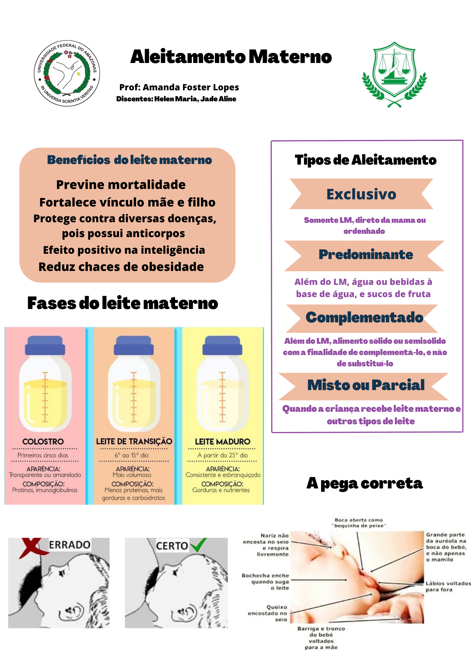 <p>FEDERAL DO Aleitamento Materno SCIENTIA Prof: Amanda Foster Lopes Discentes: Helen Maria, Jade Aline Benefícios do leite materno Tipos de Aleitamento Previne mortalidade Exclusivo Fortalece vínculo mãe e filho Protege contra diversas doenças, Somente LM, direto da mama ou pois possui anticorpos ordenhado Efeito positivo na inteligência Predominante Reduz chaces de obesidade Além do LM, água ou bebidas à base de água, e sucos de fruta Fases do leite materno Complementado Além do LM, alimento sólido ou semisolido com a finalidade de e não de Misto ou Parcial Quando a criança recebe leite materno e I outros tipos de leite COLOSTRO LEITE DE TRANSIÇÃO LEITE MADURO Primeiros cinco dias 6° ao 15° dia A partir do 25° dia APARÊNCIA: APARÊNCIA: APARÊNCIA: Transparente ou amarelado Mais volumoso Consistente e esbranquiçado COMPOSIÇÃO: COMPOSIÇÃO: imunoglobulinas Menos proteínas, mais Gorduras e nutrientes A pega correta gorduras e carboidratos Boca aberta como de peixe" Nariz não Grande parte ERRADO encosta no da auréola na CERTO e respira boca do livremente e não apenas mamilo Bochecha enche quando suga Lábios voltados leite para fora Queixo encostado no Barriga e tronco do bebé voltados para a mãe</p>