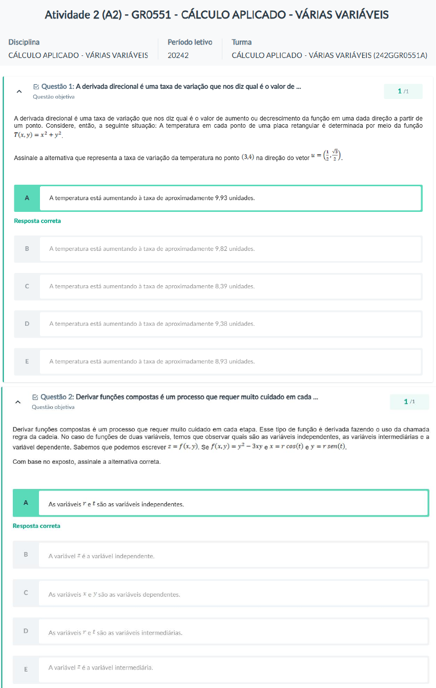 <p>Atividade 2 (A2) - GR0551 - CÁLCULO APLICADO - VÁRIAS VARIÁVEIS Disciplina Período letivo Turma CÁLCULO APLICADO - VÁRIAS VARIÁVEIS 20242 CÁLCULO APLICADO VÁRIAS VARIÁVEIS (242GGR0551A) Questão 1: A derivada direcional é uma taxa de variação que nos diz qual é o valor de 1/1 Questão objetiva A derivada é uma taxa de variação que nos diz qual é o valor de aumento ou decrescimento da função em uma dada direção a partir de um ponto. Considere, então, a seguinte situação: A temperatura em cada ponto de uma placa retangular é determinada por meio da função T(x,y) Assinale a alternativa que representa a taxa de variação da temperatura no ponto (3,4) na direção do vetor u = A A temperatura está aumentando à taxa de aproximadamente 9,93 Resposta correta B A temperatura está aumentando à taxa de aproximadamente 9,82 A temperatura está aumentando à taxa de aproximadamente 8,39 D A temperatura está aumentando à taxa de aproximadamente 9,38 E A temperatura está aumentando à taxa de aproximadamente 8,93 Questão 2: Derivar funções compostas é um processo que requer muito cuidado em cada ... 1 /1 Questão objetiva Derivar funções compostas é um processo que requer muito cuidado em cada etapa. Esse tipo de função é derivada fazendo o uso da chamada regra da cadeia. No caso de funções de duas variáveis, temos que observar quais são as variáveis independentes, as variáveis intermediárias e a variável dependente. Sabemos que podemos escrever Se f(x,y) = y2 Com base no exposto, assinale a alternativa correta. A As variáveis r e t são as variáveis independentes. Resposta correta B A variável é a variável independente. As variáveis e y são as variáveis dependentes. D As variáveis r et são as variáveis E A variável é a variável</p><p>Questão 3: A derivada direcional é uma ferramenta muito útil quando se deseja determinar... 1 /1 Questão objetiva A derivada direcional é uma ferramenta muito útil quando se deseja determinar a direção no plano no qual a função cresce mais rápido. No caso, essa direção de maior crescimento corresponde à direção do vetor gradiente em sua forma Já a direção oposta ao vetor gradiente irá denotar a direção de maior decrescimento da função. Com base nessas informações, determine a direção de maior crescimento da função ponto P(1,2). A Resposta correta B u = C D E Questão 4: o gráfico de uma função de duas variáveis é um conjunto do espaço enquanto ^ 1 /1 Questão objetiva gráfico de uma função de duas variáveis é um conjunto do espaço enquanto que o seu domínio é uma região do plano R2 Para determinar o domínio da função de duas variáveis precisamos verificar se não há restrições para os valores que e y podem assumir. Com relação ao domínio de uma função de duas variáveis, analise as afirmativas a seguir. I. o domínio da função = x-1 corresponde à região seguir. a y 1 -7 -6 -5 -4 -3 -2 -1 0 1 2 3 -1</p><p>II. o domínio da função corresponde à região a seguir. y 3 2 1 -8 -7 -6 -5 -4 -3 -2 -1 0 1 2 B 4 -1 -2 3 III. o domínio da função corresponde à região a seguir. 4 y 2 X -7 -6 -5 -4 -3 -2 -1 0 1 2 3 2 IV. o domínio da função corresponde à região a seguir. y 1 X -7 -6 -5 -4 -3 -2 -1 0 1 2 3 -1 Assinale a alternativa que apresenta a(s) afirmativa(s) correta(s). A I, apenas. Resposta correta B II. IV, apenas. C IV, apenas. D IV. apenas.</p><p>Questão 5: De acordo com Leithold (1994, p. 975), "qualquer derivada direcional de uma ^ 1/1 Questão objetiva De acordo com Leithold (1994, p. 975), "qualquer derivada de uma função diferenciável pode ser obtida se multiplicarmos escalarmente o gradiente pelo vetor unitário na direção e sentido desejados". L. Cálculo com geometria analítica. Vol. 2. 3. ed. São Paulo: Harbra, 1994. De acordo com essa definição e considerando a função f(x,y) = x2 2xy + y e o ponto P(0,1), assinale a alternativa correta. A na direção de u Resposta correta B 2 para C = -1 D E Questão 6: Chamamos de curva de nível da função o conjunto de todos os pares pertencen... ^ 1/1 Questão objetiva Chamamos de curva de nível da função f(x,y) o conjunto de todos os pares (x,y) pertencentes ao domínio de f tais que f(x,y) = onde é uma constante real. Utilizamos as curvas de nível para visualizar geometricamente o comportamento de uma função de duas variáveis. Com relação às curvas de nível, assinale a alternativa correta. A A equação 2x-y-2= = 0 é uma curva de nível para a função f(x,y) Resposta correta B A equação 3x+y=0 é uma curva de nível para a função C A equação x2+y2 = 0 é uma curva de nível para a função D - uma curva de nível para a E A equação uma curva de nível para a função</p><p>Questão 7: Esboçar o gráfico de uma função de duas variáveis sem o auxílio de um 1/1 Questão objetiva Esboçar o gráfico de uma função de duas variáveis sem o auxílio de um software pode ser trabalhoso às vezes. Para contornar esse problema, outro recurso que podemos utilizar para visualizar geometricamente o comportamento da função é o conceito de curva de A respeito das curvas de nível, assinale a alternativa correta. A Uma curva de nível é um subconjunto do espaço R2. Resposta correta B Chama-se curva de nível o conjunto de todas as ternas tais que = As curvas de nível representam cortes verticais feitos no gráfico da função. D Todos os pontos localizados em uma curva de nível possuem alturas diferentes. E Uma curva de nível também pode ser chamada de mapa de contorno. Questão 8: o conceito de derivada direcional pode ser estendido para funções de três 1 /1 Questão objetiva o conceito de derivada direcional pode ser estendido para funções de três variáveis. Nesse caso, a mudança no cálculo se dá pela quantidade de componentes que o vetor gradiente e o vetor que dá a direção apresentam, nesse caso, esses vetores possuem três componentes