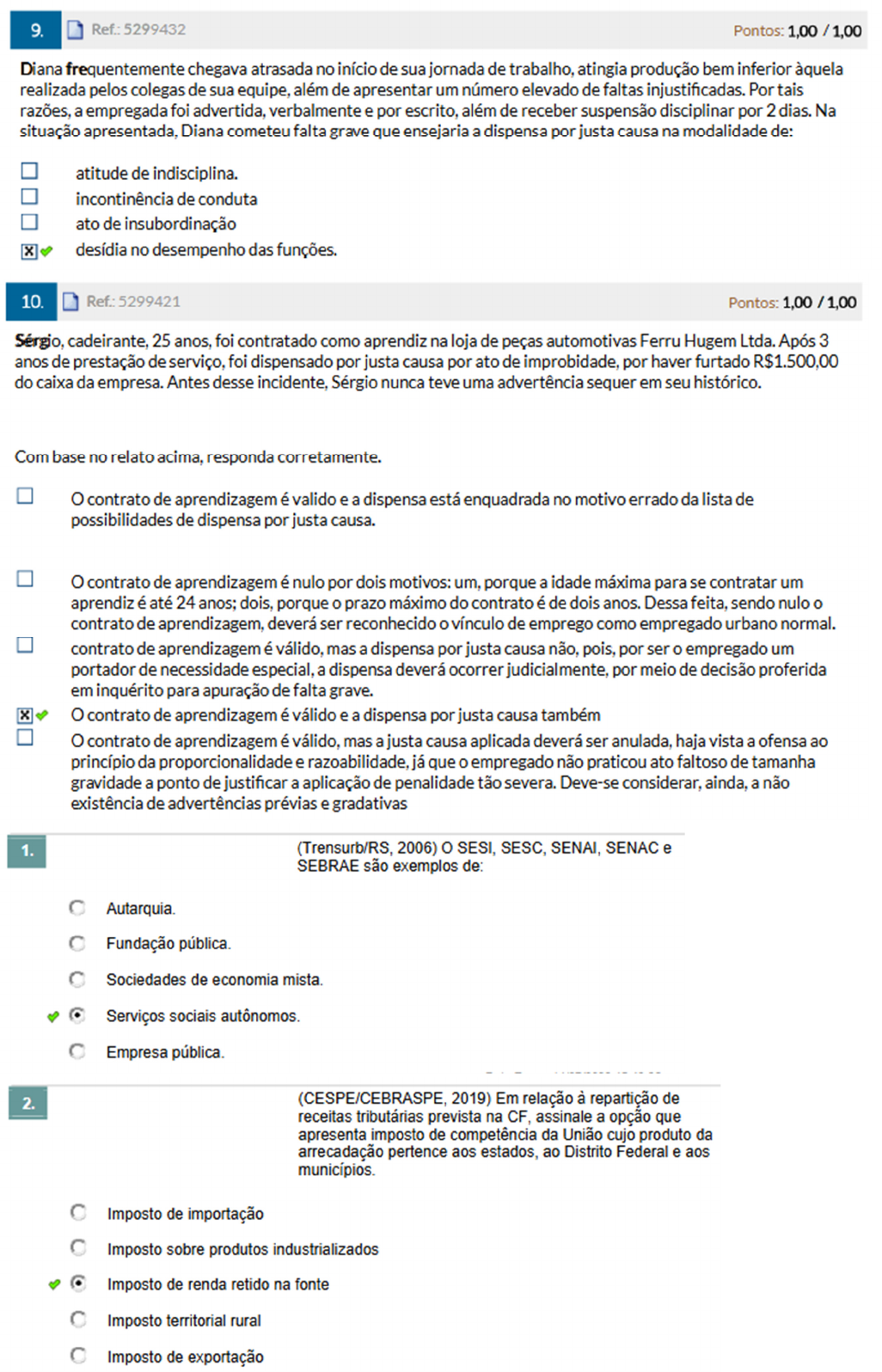 <p>9. Ref.: 5299432 Pontos: 1,00 / 1,00 Diana frequentemente chegava atrasada no início de sua jornada de trabalho, atingia produção bem inferior àquela realizada pelos colegas de sua além de apresentar um número elevado de faltas injustificadas. Por tais razões, a empregada foi advertida, verbalmente e por escrito, além de receber suspensão disciplinar por 2 dias. Na situação apresentada, Diana cometeu falta grave que ensejaria a dispensa por justa causa na modalidade de: atitude de indisciplina. incontinência de conduta ato de insubordinação no desempenho das funções. 10. Ref.: 5299421 Pontos: 1,00 / 1,00 Sérgio, cadeirante, 25 anos, foi contratado como aprendiz na loja de peças automotivas Ferru Hugem Ltda. Após 3 anos de prestação de serviço, foi dispensado por justa causa por ato de improbidade, por haver furtado R$1.500,00 do caixa da empresa. Antes desse incidente, Sérgio nunca teve uma advertência sequer em seu histórico. Com base no relato acima, responda corretamente. contrato de aprendizagem é valido e a dispensa está enquadrada no motivo errado da lista de possibilidades de dispensa por justa causa. contrato de aprendizagem é nulo por dois motivos: um, porque a idade máxima para se contratar um aprendiz é até 24 anos; dois, porque prazo máximo do contrato é de dois anos. Dessa feita, sendo nulo contrato de aprendizagem, deverá ser reconhecido vínculo de emprego como empregado urbano normal. contrato de aprendizagem é válido, mas a dispensa por justa causa não, pois, por ser empregado um portador de necessidade especial, a dispensa deverá ocorrer judicialmente, por meio de decisão proferida em inquérito para apuração de falta grave. contrato de aprendizagem é válido e a dispensa por justa causa também contrato de aprendizagem é válido, mas a justa causa aplicada deverá ser anulada, haja vista a ofensa ao princípio da proporcionalidade e razoabilidade, já que empregado não praticou ato faltoso de tamanha gravidade a ponto de justificar a aplicação de penalidade tão severa. Deve-se considerar, ainda, a não existência de advertências prévias e gradativas 1. 2006) SESI, SESC, SENAI, SENAC e SEBRAE são exemplos de: Autarquia. Fundação pública. Sociedades de economia mista. Serviços sociais autônomos. Empresa pública. 2. 2019) Em relação à repartição de receitas tributárias prevista na CF, assinale a opção que apresenta imposto de competência da União cujo produto da arrecadação pertence aos estados, ao Distrito Federal e aos municípios. Imposto de importação Imposto sobre produtos industrializados Imposto de renda retido na fonte Imposto territorial rural Imposto de exportação</p><p>3. (FGV, 2017) Um aprendiz de marcenaria procura um advogado para se sobre FGTS que vem sendo depositado mensalmente pelo empregador na sua conta vinculada junto à CEF, na razão de 2% do salário, e cujo valor é descontado juntamente com 0 INSS. Com relação ao desconto do FGTS, assinale a afirmativa correta. A empresa não deveria ter descontado do empregado, mas poderia ter repassado apenas percentual de 10% para a conta vinculada do o FGTS deveria ser depositado na ordem de 8% e não poderia ser descontado. A empresa, por se tratar de aprendiz, somente poderia descontar metade do FGTS depositado. A conduta da empresa é regular, tanto em relação ao percentual quanto ao desconto. A empresa está equivocada em relação ao desconto, pois 0 FGTS é obrigação do empregador. 4. (Prefeitura de Nova Friburgo, 2015 adaptado) No Programa de Alimentação do Trabalhador (PAT) nutricionista pode ser responsável técnico por quantas empresas? É permitido que 0 nutricionista seja responsável técnico por até três empresa. Não é permitido que nutricionista seja responsável técnico no Programa de Alimentação do Trabalhador (PAT). É permitido que 0 nutricionista seja responsável técnico por até duas É permitido que 0 nutricionista seja responsável técnico por uma única empresa. No PAT não há limites para a responsabilidade técnica. 5. 2019) Considere a seguinte situação hipotética: No mês de fevereiro de 2019, uma empresa distribuidora de energia elétrica (não enquadrada no Simples Nacional) contratou por R$ 5.000 0 Silva Brasil, pessoa física, engenheiro e segurado pela previdência social como contribuinte individual, para realizar um serviço técnico e emitir laudo de impacto o pagamento foi realizado em fevereiro de 2019 e nesse mês 0 sr. Silva Brasil não realizou outros serviços ou manteve relação de emprego. Nesse caso, de acordo com 0 Decreto Federal n° 3.048/99, a empresa contratante deverá: Acrescer 11% aos R$ 5.000 devidos ao sr. Silva Brasil e reter 20% sobre valor de R$ 5.000 a título de contribuição da empresa à seguridade social. Não realizar qualquer tipo de retenção ou contribuição à seguridade social, já que é de responsabilidade do contribuinte individual pagamento mensal dos valores devidos. Reter 11% dos R$ 5.000 devidos ao sr. Silva Brasil e recolher 20% sobre 0 valor de R$ 5.000 a título de contribuição da empresa à seguridade social. Acrescer 20% aos R$ 5.000 devidos ao sr. Silva Brasil e reter 11% sobre valor de R$ 5.000 a título de contribuição da empresa à seguridade Reter 20% dos R$ 5.000 devidos ao sr. Silva Brasil e recolher 11% sobre 0 valor de R$ 5.000 a título de contribuição da empresa à seguridade</p><p>6. (NUCLEP, 2014) Criado pela Lei n° 6.321 de 14 de abril de 1976 (regulamentada em 1991), 0 Programa de Alimentação do Trabalhador (PAT) é um programa de complementação alimentar no qual governo, empresa e trabalhadores partilham responsabilidades. Os parâmetros nutricionais, relativos a nutrientes e valores diários para a alimentação do trabalhador, constantes na Portaria de 28 de agosto de 2006 deste Programa, são: Valor energético total em torno de 2.000 (duas mil) quilocalorias, com recomendação para a inclusão de 