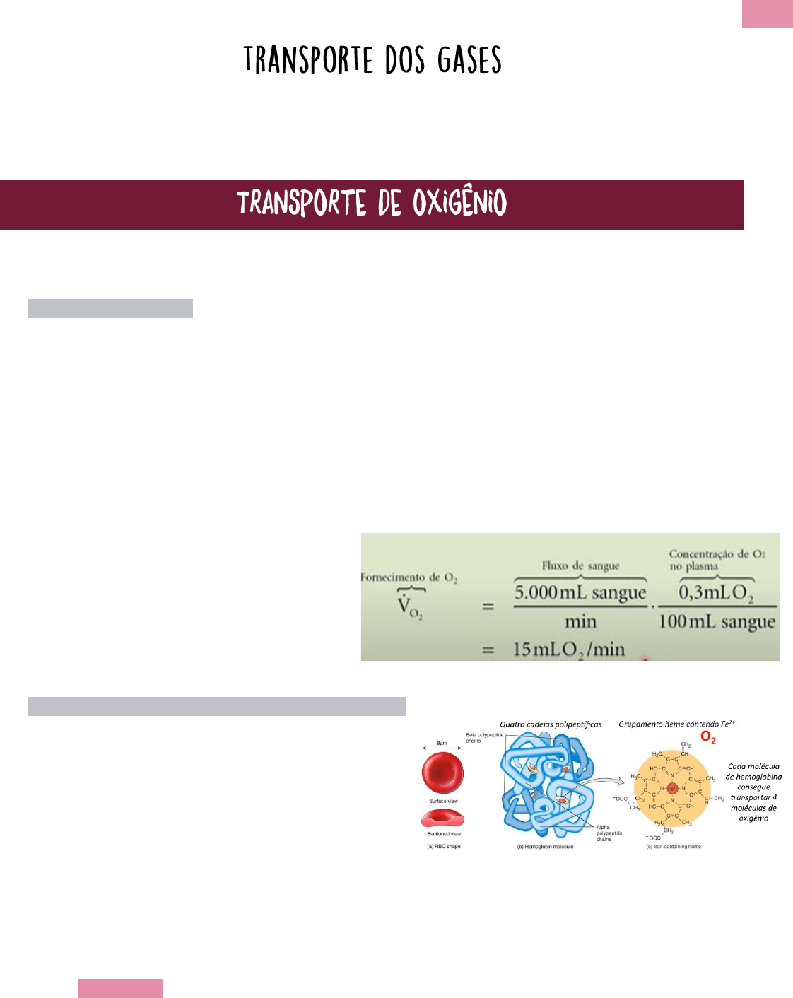 <p>1 GABRIELA NOVAES OLIVEIRA – 258 – FISIOLOGIA DOS ÓRGÃOS E SISTEMAS</p><p>• Pode acontecer de três formas:</p><p>o Gás dissolvido + gás ligado a proteína + gás quimicamente modificado.</p><p>• Pode ser transportado no sangue sob duas formas: ligado a hemoglobina (principal forma) ou dissolvido (sob</p><p>sua forma livre – determina a pressão parcial de O2 na circulação).</p><p>• OXIGÊNIO DISSOLVIDO</p><p>o Contabiliza com 2% do conteúdo total de O2.</p><p>o Para uma PO2 de 100mmHg, a concentração de O2 dissolvido é (LEI DE HENRY):</p><p>▪ Concentração de O2 = PO2 x SOLUBILIDADE DO O2</p><p>▪ Concentração de O2 = 100mmHg x 0,003 mL O2 para cada 100ml de sangue/mmHg → 0,3%vol ou 0,3 mL</p><p>de O2 para 100 ml de sangue.</p><p>o Em termos de suporte energético, o O2 dissolvido é insuficiente para atender as demandas metabólicas dos</p><p>tecidos – a quantidade entregue aos tecidos a cada minuto (DC x O2 dissolvido) seria de 15mL de O2/min.</p><p>▪ Um homem de 70kg em repouso consome</p><p>250ml de O2/min – demanda x oferta é</p><p>discrepante.</p><p>▪ Necessidade de uma forma de transporte</p><p>adicional que atenda a essas</p><p>necessidades.</p><p>• LIGADO A HEMOGOBINA (HB) DE FORMA REVERSÍVEL</p><p>o Principal forma de transporte de O2 – oxiemoglobina;</p><p>são 280 milhões de moléculas de HB adulta por</p><p>hemácia (corresponde a cerca de 1/3 da composição da</p><p>hemácia.</p><p>o Proteína constituída por quatro cadeias polipeptídicas –</p><p>duas cadeias do tipo alfa e duas do tipo beta – grupamento heme ligado a cada uma dessas íons.</p><p>▪ HEME: porfirina que contém em seu centro o íon ferro (Fe2+) – onde o O2 se ligada de modo reversível.</p><p>▪ Cada molécula de hemoglobina consegue transportar 4 moléculas de oxigênio.</p><p>o VARIANTES DA HEMOGLOBINA</p><p>▪ FETAL – α2γ2</p><p> Variante fisiológica normal da Hb adulto com 2 cadeias alfa e 2 cadeias gama.</p><p> Alta afinidade pelo oxigênio – facilita a entrega do oxigênio da mãe para o feto.</p><p> HbF é substituída pela HbA no primeiro ano de vida.</p><p>2 GABRIELA NOVAES OLIVEIRA – 258 – FISIOLOGIA DOS ÓRGÃOS E SISTEMAS</p><p>▪ ANEMIA FALCIFORME (Hb S)</p><p> Subunidade alfa normal e substituição de aa na subunidade B.</p><p> Menor afinidade pelo oxigênio – redução da solubilidade quando desoxigenada.</p><p> Cristaliza quando desoxigenada (ambientes de baixa oxigenação) + hemácia em formato de foice +</p><p>menos flexível (formação de trombos – oclusão vascular, que reduz o fluxo sanguíneo para o tecido).</p><p>▪ METEMOGLOBINA (Fe3+)</p><p> Ferro (Fe3+) no estado oxidado – estado férrico.</p><p> Hb que se combina a numerosos ânions, mas não com o O2 – incapaz de carreá-lo.</p><p> Associado a intoxicação com nitritos ou a deficiência da enzima metemoglobina redutase</p><p>(responsável pela redução de Fe3+ a Fe2+ - doença genética).</p><p>• CONTEÚDO DE O2 NO SANGUE</p><p>o O somatório destas formas de transporte de O2 corresponde ao conteúdo de oxigênio no sangue:</p><p>▪ Conteúdo de O2 = HbO2 (20,1 mL / 100 mL de sangue) + O2 dissolvido (0,3 mL/100ml de sangue).</p><p>o Hb está no sangue em concentração de 15g/100 ml de sangue;</p><p>▪ Se totalmente saturada, pode carrear 1,34ml de O2/g Hb.</p><p>▪ Quantidade máxima de O2 ligada a Hb → [Hb] x quantidade de O2/g de Hb.</p><p>o Em caso de anemia com redução de eritrócito, há comprometimento no transporte de oxigênio e oferta de</p><p>energia para as células.</p><p>o TRÊS DIFERENTES SITUAÇÕES</p><p>▪ 1ª – O2 TRANSPORTADO SEM Hb</p><p> PO2 alveolar = PO2 arterial – em equilíbrio.</p><p> Transportado em sua forma livre (dissolvido).</p><p> Quantidade oxigênio carreado na ausência da hemoglobina é de 3ml de O2 /L de sangue.</p><p>▪ 2ª – O2 TRANSPORTADO A UMA PO2 NORMAL COM Hb</p><p> Parte do transporte na forma dissolvida e a maior parte na forma ligada – somatório das duas formas</p><p>de transporte – condição de normalidade (carreio ideal).</p><p> Ambos compartimentos (alveolar e intravascular) com pressão de 100mmHg.</p><p>▪ 3ª – O2 TRANSPORTADO A UMA PO2 REDUZIDA COM Hb</p><p> O problema reside no SR – PO2 está abaixo da normalidade (doenças restritivas, obstrutiva ou</p><p>indivíduo que está em uma região</p><p>de altitudes elevadas).</p><p> Menor saturação de oxigênio com a</p><p>hemoglobina – 2 sítios ocupados</p><p>dos 4.</p><p>3 GABRIELA NOVAES OLIVEIRA – 258 – FISIOLOGIA DOS ÓRGÃOS E SISTEMAS</p><p>• CURVA DE SATURAÇÃO DA HEMOGLOBINA (SIGMOIDE)</p><p>o A associação da Hb com o oxigênio depende da pressão</p><p>parcial desse gás → quanto ↑ PO2, ↑ porcentagem de sítios</p><p>na molécula de Hb que estão ocupados pelo oxigênio</p><p>(saturação).</p><p>o Não é linear – variação da afinidade, formando uma curva</p><p>sigmoide.</p><p>▪ É mais ou menos linear até 60mmHg.</p><p>o Aumenta de forma acentuada até 50mmHg – oxigênio se liga</p><p>e aumenta a afinidade (cooperatividade positiva).</p><p>o Horizontalizando a partir de 50-60mmHg – caminho para a</p><p>saturação.</p><p>o SANGUE VENOSO MISTO → hemoglobina com 75% de saturação.</p><p>o SANGUE ARTERIAL → hemoglobina com 100% de saturação</p><p>o Se um indivíduo normal começa a hiperventilar, não muda muita coisa pois a hemoglobina já está saturada.</p><p>OBSERVAÇÃO:</p><p>Para determinada variação na pressão parcial de oxigênio, entre 70 e</p><p>100mmHg, tem-se uma discreta variação na saturação de Hb (entre 90 e</p><p>100%) – nessa faixa, para uma grande variação de PO2 há uma discreta</p><p>variação na saturação de Hb (reserva de oxigênio saturando a proteína, e o</p><p>transporte não é comprometido quando o sangue já está arterializado.</p><p>Faixa de descarga do oxigênio → para faixas de pressões parciais de oxigênio</p><p>menores
