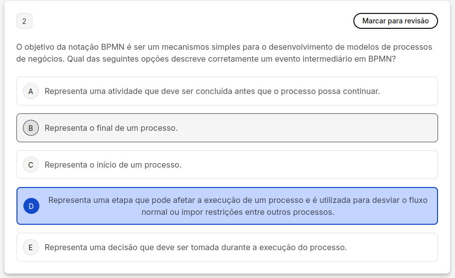 <p>2 Marcar para revisão o objetivo da notação BPMN é ser um mecanismos simples para desenvolvimento de modelos de processos de negócios. Qual das seguintes opções descreve corretamente um evento intermediário em BPMN? A Representa uma atividade que deve ser concluída antes que processo possa continuar. B Representa final de um processo. C Representa início de um processo. Representa uma etapa que pode afetar a execução de um processo e é utilizada para desviar fluxo D normal ou impor restrições entre outros processos. E Representa uma decisão que deve ser tomada durante a execução do processo.</p>