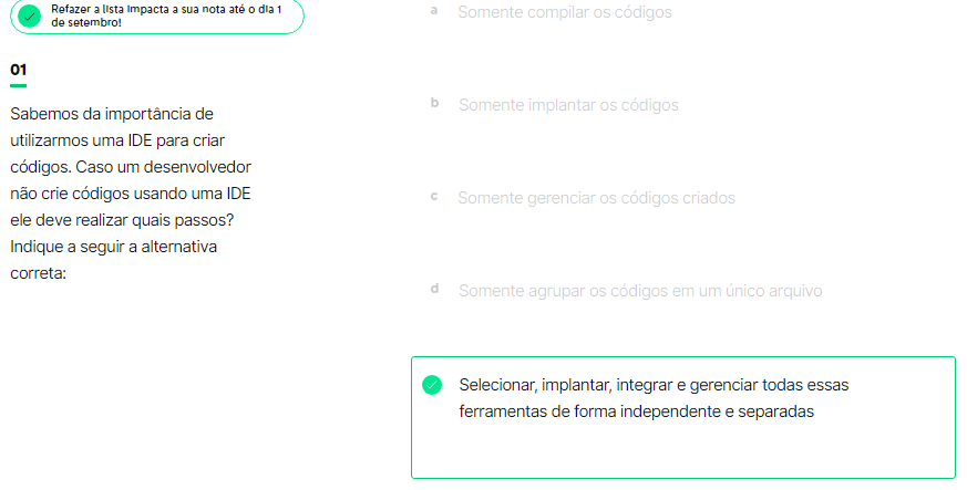 <p>Refazer a Impacta a sua nota até dia 1 a Somente compilar os códigos de setembro! 01 b Sabemos da importância de Somente implantar os códigos utilizarmos uma IDE para criar códigos. Caso um desenvolvedor não crie códigos usando uma IDE Somente gerenciar os códigos criados ele deve realizar quais passos? Indique a seguir a alternativa correta: Somente agrupar os códigos em um único arquivo Selecionar, implantar, integrar e gerenciar todas essas ferramentas de forma independente e separadas</p>
