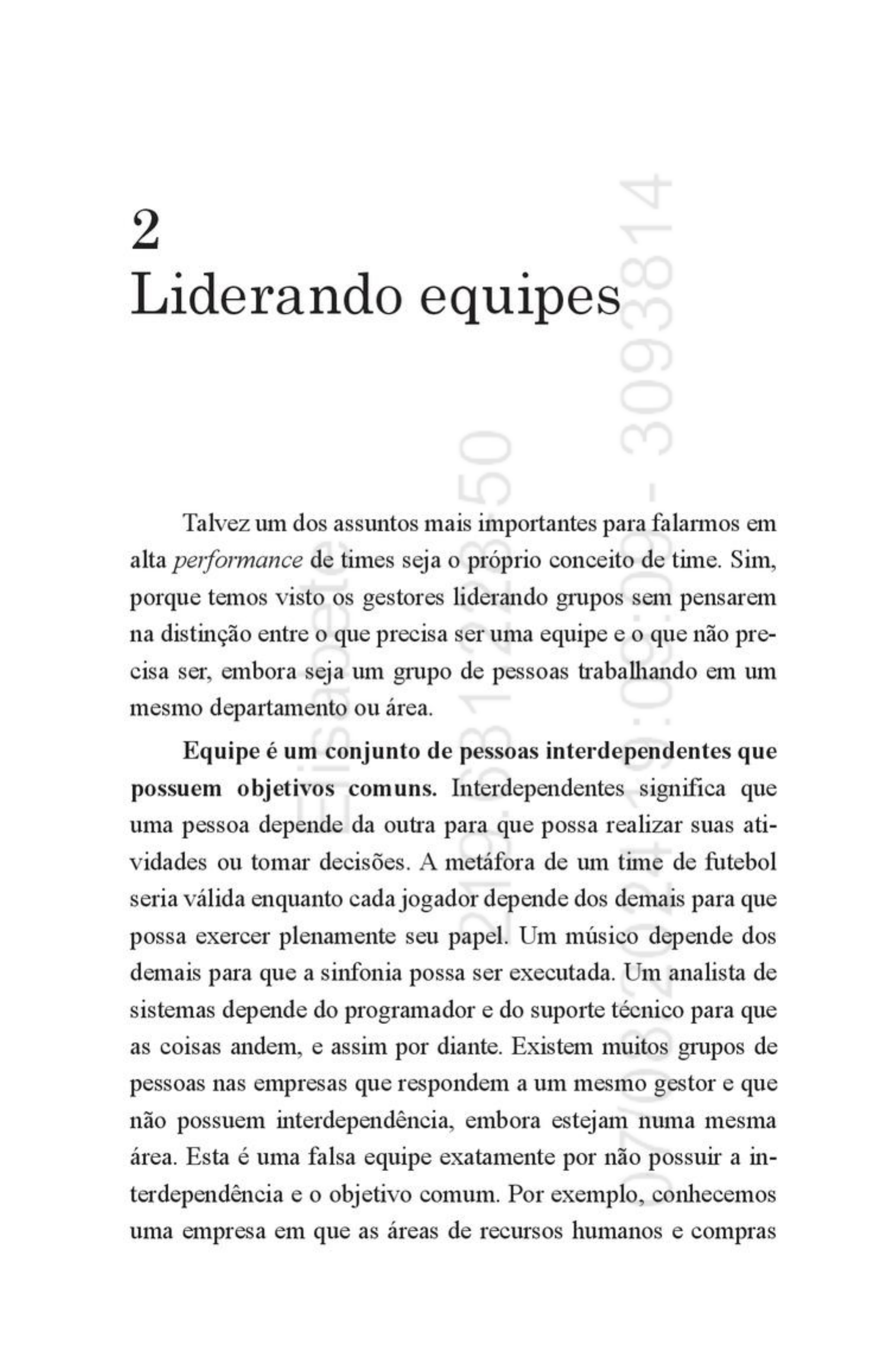 <p>2 Liderando equipes Talvez um dos assuntos mais importantes para falarmos em alta performance de times seja o próprio conceito de time. Sim, porque temos visto os gestores liderando grupos sem pensarem na distinção entre o que precisa ser uma equipe e o que não pre- cisa ser, embora seja um grupo de pessoas trabalhando em um mesmo departamento ou área. Equipe é um conjunto de pessoas interdependentes que possuem objetivos comuns. Interdependentes significa que uma pessoa depende da outra para que possa realizar suas ati- vidades ou tomar decisões. A metáfora de um time de futebol seria válida enquanto cada jogador depende dos demais para que possa exercer plenamente seu papel. Um músico depende dos demais para que a sinfonia possa ser executada. Um analista de sistemas depende do programador e do suporte técnico para que as coisas andem, e assim por diante. Existem muitos grupos de pessoas nas empresas que respondem a um mesmo gestor e que não possuem interdependência, embora estejam numa mesma área. Esta é uma falsa equipe exatamente por não possuir a in- terdependência e o objetivo comum. Por exemplo, conhecemos uma empresa em que as áreas de recursos humanos e compras</p><p>são gerenciadas pelo mesmo gestor. Tentar juntar esses dois ti- mes e tratá-los como uma única equipe seria forçar uma situação de interdependência que não existe (muito embora possa existir uma relação de cliente fornecedor entre eles). Portanto, antes de entrarmos nas ferramentas a serem utili- zadas, precisamos mapear e, eventualmente, redefinir qual é ou quais são as equipes que estaremos analisando e, se for preciso, tratar de forma diferente as diferentes equipes. Caso da equipe do Alberto Alberto é gerente de uma grande empresa nacional, que atua no ramo de produtos para o mercado de construção civil. Ele cuida de uma área que faz parte de uma unidade de negócio in- dustrial que fabrica todos os produtos dessa As demais unidades de negócio são voltadas à comercialização e desenvol- vimento de novos produtos. Como unidade de negócio ela possui certa autonomia que a levou a criar uma área de TI que desen- volve e faz a manutenção de todos os sistemas que sustentam a produção desta unidade. Alberto é justamente o responsável por esta área de TI. Sua formação é em Engenharia e fez especialização em Sistemas de Apesar de sua formação técnica, Al- berto consegue ter uma boa visão da empresa e das necessida- des organizacionais, sem estar contagiado pelo tecnicismo que usualmente impera neste tipo de área. Alberto tem 30 anos e não fez sua carreira na área de TI, como é comum vermos em ou- tras empresas. Sua carreira passou por engenharia, planejamento da produção, produção e finalmente TI. Esse trajeto o ajudou a balancear a questão técnica com as demais necessidades do negócio. Ansioso por acertar, Alberto vem trabalhando com sua equipe na busca por um desempenho excelente, mas tem enfren- tado muitas dificuldades e obtido resultados que, sob a sua ótica, estão muito abaixo do que seria 122</p><p>As demandas da área dizem respeito a processos de su- porte. Por exemplo, entre os sistemas mais importantes está o sistema de materiais, que auxilia na gestão de compras e arma- zenagem de materiais da indústria, que tem muita importân- cia, por lidar com valores de matérias-primas e estoques muito altos, principalmente quando se fala em matérias-primas que, em geral, são muito caras, representando grande parte do valor do produto final e que, muitas vezes, precisam ser importadas, trazendo complicações de gestão mais do que o normal, prin- cipalmente no que tange a estoques e tempo. Outro exemplo de sistema importante é o sistema de administração da produ- ção que suporta todo o planejamento da produção e que gera a documentação que sincroniza e coordena o fluxo. Esse siste- ma acaba sendo muito complexo, pois automatiza grande parte das funções técnicas que exigem conhecimentos específicos de processo produtivo, garantindo que as informações necessárias cheguem ao chão de fábrica. Existe uma grande demanda reprimida por desenvolvimen- tos de sistemas menores, voltados para aspectos menos impor- tantes e administrativos que a área nunca consegue dar vazão por dar maior prioridade a esses sistemas considerados mais im- portantes. Entretanto, a não realização de tais demandas provoca certo barulho dos usuários não atendidos que criam preocupa- ções para a credibilidade de Alberto. Alberto conta com um time que, em parte, foi construído por ele e, em parte, recebido de herança de seu predecessor. Está neste cargo há 6 meses e se sente seguro para avaliar claramente todos os membros de sua equipe. Realiza semanalmente uma reunião com o time inteiro, re- servando 2 horas para isso. A dinâmica da reunião é passar as informações recebidas da hierarquia, discutir o andamento dos projetos e outros assuntos considerados importantes. O clima da reunião ultimamente não tem sido muito calmo. Isso o tem deixado apreensivo e ansioso. Existe uma tensão no 123</p><p>ar, respostas defensivas sobre eventuais atrasos, algumas pessoas culpando as outras. Alberto tem percebido certa agressividade entre alguns grupos, o que provoca grande irritação de sua parte, chegando a exigir certa imposição em relação à condução do gru- po. Essa imposição é de ser feita, pois os mais antigos, que detêm muito conhecimento dos sistemas existentes, manipulam as informações e tentam conduzir para seus próprios objetivos, nem sempre os melhores para a empresa como um todo. Muitas vezes Alberto sente seu discurso meio vazio e sem eco. Sua visão de empresa não é plenamente compartilhada pelos mais antigos e mais poderosos do grupo que colocam a técnica na frente. Mas, sempre com muito trabalho de conversa e persuasão, ele acaba conseguindo a adesão do grupo para suas O grupo é muito heterogêneo, tanto em idade, cr