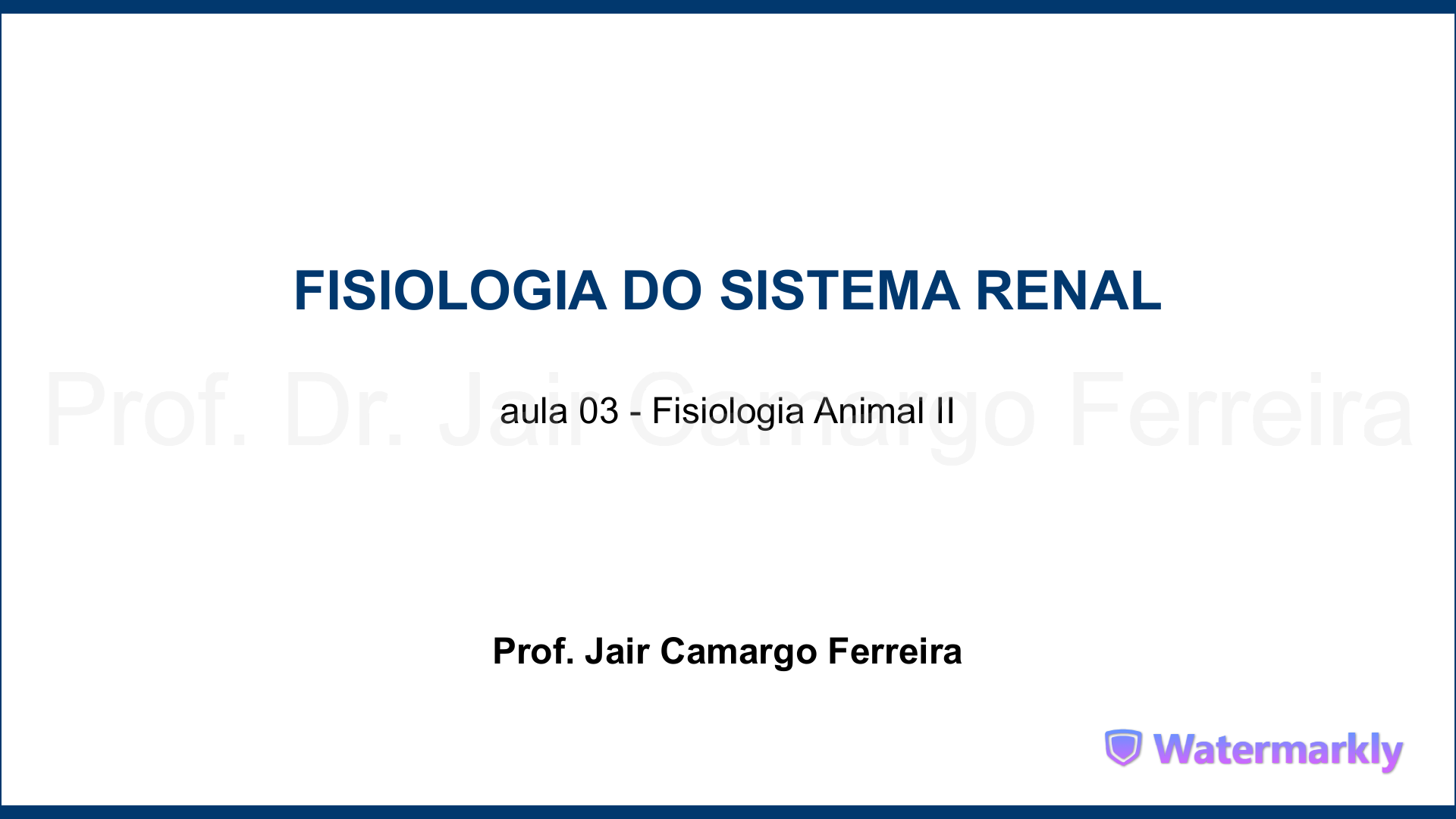 <p>FISIOLOGIA DO SISTEMA RENAL</p><p>aula 03 - Fisiologia Animal II</p><p>Prof. Jair Camargo Ferreira</p><p>Sistema urinário</p><p>o Conjunto de órgãos que filtram o sangue, produzem e excretam a urina</p><p>o URINA</p><p>• Principal líquido de excreção do organismo</p><p>o COMPONENTES</p><p>• Rins • Bexiga</p><p>• Ureteres • Uretra</p><p>Sistema urinário</p><p>Sistema urinário</p><p>Funções do sistema renal</p><p>1. Filtração sanguínea</p><p>• Produção /eliminação de urina</p><p>• Excreção de resíduos metabólicos (compostos</p><p>nitrogenados)</p><p>• Absorção de substâncias filtradas</p><p>2. Regulação do volume e composição do</p><p>líquido extracelular</p><p>• regula a água corporal (osmose)</p><p>3. Participa a eritropoiese</p><p>• síntese de eritropoietina</p><p>4. Regulação da pressão arterial</p><p>• Sistema RAA</p><p>5. Produção de hormônios</p><p>6. Regula o equilíbrio ácido-base e</p><p>controle do balanço eletrolítico</p><p>7. Manutenção do metabolismo ósseo</p><p>• reabsorção de cálcio e fósforo</p><p>Função endócrina do sistema renal</p><p>1. Controle da produção de eritrócitos</p><p>• Eritropoetina estimula a eritropoiese</p><p>2. Síntese de Renina</p><p>3. Ativação da vitamina D</p><p>4. Local de ação de</p><p>• Paratormônio (regulação do metabolismo de cálcio e fósforo)</p><p>• ADH</p><p>• Aldosterona</p><p>• Angiotensina II</p><p>Tipos de rins</p><p>1. Rins unilobulares ou unipiramidais</p><p>• Caninos felinos, equinos e pequenos ruminantes</p><p>Tipos de rins</p><p>2. Rins multilobulares ou multipiramidais</p><p>• Bovinos e suínos</p><p>Componentes renais</p><p>Componentes renais</p><p>Néfron</p><p>o Funções</p><p>1. Filtração</p><p>2. Reabsorção</p><p>3. Secreção</p><p>o Unidade funcional dos rins</p><p>• Quantidade varia de acordo com a espécie</p><p>Irrigação sanguínea do néfron</p><p>Tipos de néfron</p><p>o Cortical</p><p>• Glomérulos no córtex externo e médio</p><p>• alça de Henle até a junção corticomedular</p><p>e medula externa</p><p>• 80% dos néfrons</p><p>o Justamedular</p><p>• glomérulos no córtex próximo à medula</p><p>• alça de Henle mais profunda e dentro da</p><p>medula</p><p>• vasos retos circulam as alças de Henle</p><p>Tipos de néfron</p><p>Porções do néfron</p><p>o Porção tubular</p><p>a. Capsula de Bowman</p><p>b. Túbulo contorcido proximal</p><p>c. Alça de Henle</p><p>d. Túbulo contorcido distal</p><p>e. Ducto coletor</p><p>o Porção vascular</p><p>a. Arteríolas aferentes</p><p>b. Glomérulo</p><p>c. Arteríolas eferentes</p><p>d. Capilares peritubulares</p><p>Porções do néfron</p><p>PORÇÃO CORTICAL</p><p>o parte mais externa do rim</p><p>o localizado abaixo da cápsula renal</p><p>o estruturas localizadas no córtex</p><p>1. Cápsula Bowman</p><p>2. Túbulos proximais e distais</p><p>3. Porções superiores dos ductos coletores</p><p>Porções do néfron</p><p>PORÇÃO MEDULAR</p><p>o dividida em pirâmides renais</p><p>o base da pirâmide em direção ao córtex</p><p>o estruturas localizadas na medula/pirâmides</p><p>1. Ança de Henle</p><p>2. Ductos coletores</p><p>Porções do néfron</p><p>Corpúsculo renal (Glomérulo + Cápsula de Bowman)</p><p>Cápsula glomerular (Bowman)</p><p>o Estrutura em forma de bola em torno de uma teia de capilares arteriais</p><p>o Camada parietal externa composta por células epiteliais escamosas simples</p><p>o Camada visceral interna</p><p>• Circunda diretamente os capilares glomerulares</p><p>• Composta por células epiteliais especializadas conhecidas como podócitos</p><p>o Espaço Bowman</p><p>• O espaço entre as camadas parietal e visceral da cápsula de Bowman</p><p>• Recolhe o filtrado (urina)</p><p>• Drena para o túbulo contornado proximal (TCP)</p><p>Corpúsculo renal</p><p>Vasos sanguíneos do corpúsculo renal</p><p>o Estrutura em forma de bola em torno de uma teia de capilares arteriais</p><p>o Camada parietal externa composta por células epiteliais escamosas simples</p><p>o Camada visceral interna</p><p>• Circunda diretamente os capilares glomerulares</p><p>• Composta por células epiteliais especializadas conhecidas como podócitos</p><p>o Espaço Bowman</p><p>• O espaço entre as camadas parietal e visceral da cápsula de Bowman</p><p>• Recolhe o filtrado (urina)</p><p>• Drena para o túbulo contornado proximal (TCP)</p><p>Vasos sanguíneos associados ao corpúsculo renal</p><p>1. Arteríola aferente</p><p>• Transporta sangue para o glomérulo</p><p>• Diâmetro relativamente grande</p><p>2. Capilares glomerulares</p><p>• teia de capilares entre as arteríolas aferentes e eferentes</p><p>• local da filtração renal</p><p>3. Arteríola eferente</p><p>• Transporta o sangue filtrado para fora do glomérulo</p><p>• Pequeno diâmetro (em comparação com a arteríola aferente)</p><p>Membrana de filtração renal</p><p>Membrana de filtração renal</p><p>o Barreira glomerular: principal filtro sanguíneo entre os capilares glomerulares e o espaço de Bowman</p><p>o Três camadas</p><p>1. Endotélio fenestrado que reveste os capilares glomerulares</p><p>2. Membrana basal glomerular (MBG):</p><p>3. Podócitos</p><p>• camada visceral da cápsula de Bowman</p><p>• envolvem os vasos, criando fendas de filtração</p><p>Barreira e filtração glomerular</p><p>Barreira e filtração glomerular</p><p>Barreira e filtração glomerular</p><p>Aparelho justaglomerular</p><p>Aparelho justaglomerular</p><p>o Pequena estrutura endócrina</p><p>o Função</p><p>• Síntese de Renina</p><p>a. Regulação do fluxo sanguíneo</p><p>b. Regulação do filtração glomerular</p><p>o Componentes</p><p>1. Mácula densa</p><p>2. Células mesangiais extraglomerulares</p><p>3. Células justaglomerulares</p><p>Aparelho justaglomerular</p><p>Aparelho justaglomerular</p><p>Aparelho justaglomerular</p><p>1. Mácula densa</p><p>• c