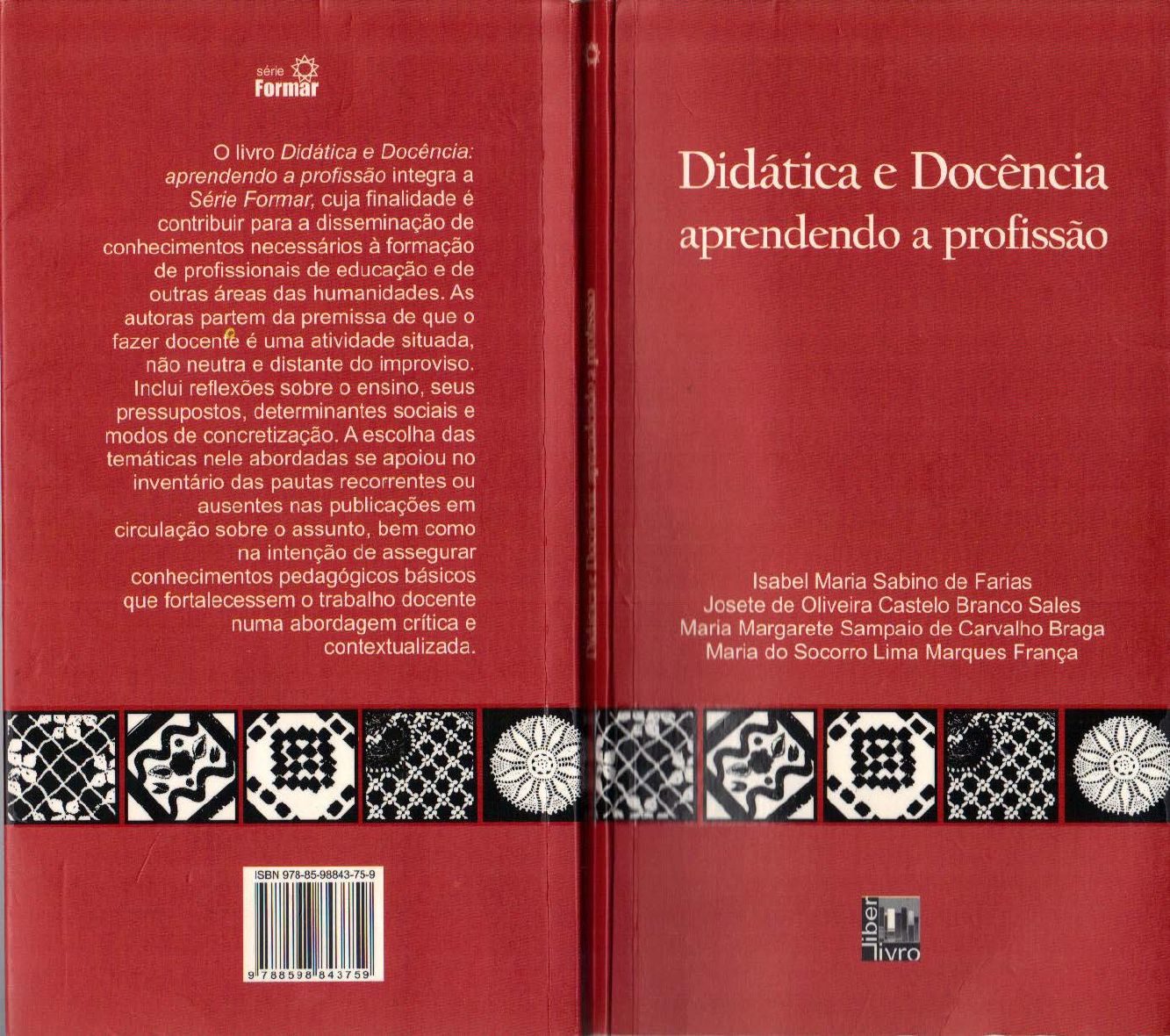 <p>Didática e Docência</p><p>aprendendo a profissão</p><p>Isabel Maria Sabino de Farias</p><p>Josete de Oliveira Castelo Branco Sales</p><p>Maria Margarete Sampaio de Carvalho Braga</p><p>Maria do Socorro Lima Marques França</p><p>Brasíia, DF</p><p>2009</p><p>Copyright©2008 by Liber Livro Editora Lida.</p><p>Conselho Editorial</p><p>Bernardete A. Gatti, Iria Brzezinski, Maria Celia de</p><p>Abreu, Osmar Favero, Pedro Demo, Rogério de</p><p>Andrade Córdova, Sofia Lerche Vieira.</p><p>Coordenação Série Formar</p><p>Eloisa Maia Vidal, Sofia Lerche Vieira</p><p>Capa</p><p>Roberto Santos, Sofia Lerche Vieira</p><p>Projeto Gráfico</p><p>Roberto Santos</p><p>Editoração Eletrônica</p><p>Felipe Araújo</p><p>Revisão</p><p>Edisio Fernandes</p><p>Ficha Catalográfica</p><p>Camiem Araújo</p><p>1 • Edição - Setembro de 2008</p><p>2• Edição - Fevereiro de 2009</p><p>0666 Dídática e docência: aprendendo a profissão / Isabel</p><p>Maria Sabino de Farias ... [et ai.). - Brasília : liber</p><p>livro, 2009.</p><p>180 p. - (Série formar)</p><p>Inclui bibliografia comentada.</p><p>ISBN 978-85-98843-75-9</p><p>1. Didática 2. Educação 3. Docência 4. Ensino</p><p>1. Farias, Isabel Maria Sabino de li. Sales. Josete de</p><p>Oliveira Castelo Branco Ili. Braga, Maria Margarete</p><p>Sampaio de Carvalho IV. França, Maria do Socorro</p><p>Uma Marques</p><p>CDU: 37.02</p><p>Llber Livro Editora Lida</p><p>CLN • Quadra 315 • Bloco B</p><p>Sala 15 •Asa Norte</p><p>CEP.: 70.774-520 • Brasília - DF</p><p>Fone: (61)3965.9667 • Fax: (61) 3965.9668</p><p>E-mail: editora@liberllvro.com.br</p><p>www.llber11vro.com.br</p><p>Aos que teceram e continuam a tecer conosco a</p><p>nossa profissionalidade:</p><p>nossos farrúliares, arrúgos de infância e companheiros</p><p>de escola, com quem aprendemos a sonhar;</p><p>os nossos professores, que foram exemplo e fonte de</p><p>entusiasmo;</p><p>os nossos alunos, que nos desafiam cotidianamente.</p><p>Sumário</p><p>Prefácio ........................................................................................... 11</p><p>Introdução - Didática? Didáticas? Qual Didática?</p><p>Uma conversa sobre nossa opção teórica ............................ 13</p><p>Os precursores da Didática .................................................... 16</p><p>A constituição da Didática como disciplina ...................... .17</p><p>Por uma Didática critica e contextualizada ..................... 20</p><p>Das relações entre Educação, Pedagogia e Didática ....... 22</p><p>Síntese da Introdução ............................................................. 26</p><p>Atividades ................................................................................... 26</p><p>Bibliografia Comentada ........................................................... 27</p><p>Parte 1 - Para compreender as bases</p><p>do fazer docente ........................................................................ 29</p><p>Capitulo l - Fundamentos da prática docente:</p><p>elementos quase invisíveis ....................................................... 31</p><p>ll. Teorias que dão sustentação às práticas educativas .............. 33</p><p>1.2. Caracterização metodológica das tendências</p><p>pedagógicas reformistas e transformadoras ............... 41</p><p>Síntese do Capitulo ............................................................ 51</p><p>Atívidades ............................................................................. 52</p><p>Bibliografia Comentada ................................................... .53</p><p>Capítulo 2 - Identidade e fazer docente:</p><p>aprendendo a ser e estar na profissão ................................. .55</p><p>2.l. Educação, humanização e construção</p><p>de identidades ........................................................................... .56</p><p>2.2. Uma pessoa que se faz professor</p><p>- a identidade profissional... .................................................. .58</p><p>Danilo</p><p>Realce</p><p>2.3. Elementos identitários da docência</p><p>- história de vida, formação e prática pedagógica .. 60 5.2. As estratégias de ensino em aula</p><p>2.4. Docência - trabalho que requer - dos critérios às formas ................................................ 132</p><p>saberes especializados ...................... .. ..... .. ....................... 72 5.3. Estratégias de ensino e professores em</p><p>Síntese do Capitulo ............................................................ 77 formação - algumas lições da prática ....................... .14 5</p><p>Atividades ............................................................................. 77 Síntese do Capltulo ......................................................... .149</p><p>Bibliografia Comentada .................................................... 78 Atividades ........................................................................... 150</p><p>Capítulo 3 - Docência: notas sobre</p><p>Bibliografia Comentada ................................................... 151</p><p>a dimensão ética da profissão ................................................. 81 Capítulo 6 - A aula como espaço-tempo</p><p>3.1. Ética, educação e docência ............................................... 82 coletivo de construção de saberes ....................................... 153</p><p>3.2. Exigências éticas inerentes ao ato de ensinar ............ 86 6.1. Aula - mais que tempo, um espaço</p><p>3.3. Construir diretrizes ético-profissionais coletivo de construção de saberes .............................. .154</p><p>- desafio ã profissionalização docente ....................... 92 6.2. A aula nossa de cada dia ................................................ 157</p><p>Síntese do Capítulo ............................................................ 98 Síntese do Capítulo ....................................................