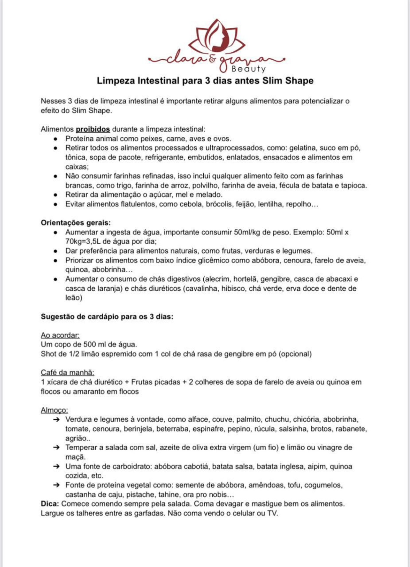<p>& Beauty Limpeza Intestinal para 3 dias antes Slim Shape Nesses 3 dias de limpeza intestinal é importante retirar alguns alimentos para potencializar o efeito do Slim Shape. Alimentos proibidos durante a limpeza intestinal: Proteína animal como peixes, carne, aves e ovos. Retirar todos os alimentos processados e ultraprocessados, como: gelatina, suco em pó, tônica, sopa de pacote, refrigerante, embutidos, enlatados, ensacados e alimentos em caixas; Não consumir farinhas refinadas, isso inclui qualquer alimento feito com as farinhas brancas, como trigo, farinha de arroz, polvilho, farinha de aveia, fécula de batata e tapioca. Retirar da alimentação o açúcar, mel e melado. Evitar alimentos flatulentos, como cebola, feijão, lentilha, repolho... Orientações gerais: Aumentar a ingesta de água, importante consumir 50ml/kg de peso. Exemplo: 50ml 70kg=3,5L de água por dia; Dar preferência para alimentos naturais, como frutas, verduras e legumes. Priorizar os alimentos com baixo índice glicêmico como abóbora, cenoura, farelo de aveia, quinoa, abobrinha. Aumentar o consumo de chás digestivos (alecrim, gengibre, casca de abacaxi e casca de laranja) e chás diuréticos (cavalinha, hibisco, chá verde, erva doce e dente de leão) Sugestão de cardápio para os 3 dias: Ao Um copo de 500 ml de água. Shot de 1/2 limão espremido com 1 col de chá rasa de gengibre em pó (opcional) Café da manhã: 1 de chá diurético + Frutas picadas + 2 colheres de sopa de farelo de aveia ou quinoa em flocos ou amaranto em flocos Almoço: Verdura e legumes à vontade, como alface, couve, palmito, chuchu, chicória, abobrinha, tomate, cenoura, berinjela, beterraba, espinafre, pepino, rúcula, salsinha, brotos, rabanete, agrião.. Temperar a salada com sal, azeite de oliva extra virgem (um fio) e limão ou vinagre de maçã. Uma fonte de carboidrato: abóbora cabotiá, batata salsa, batata inglesa, aipim, quinoa cozida, etc. Fonte de proteína vegetal como: semente de abóbora, amêndoas, tofu, cogumelos, castanha de caju, pistache, tahine, ora pro nobis... Dica: Comece comendo sempre pela salada. Coma devagar e mastigue bem os alimentos. Largue os talheres entre as garfadas. Não coma vendo o celular ou TV.</p><p>30 minutos antes ou após o almoço, ingerir 1 de chá digestivo Lanche da tarde: Se sentir necessidade, o lanche da tarde pode ser uma fruta com um mix de oleaginosas, no máximo 60g. Caso não tenha fome, priorize seu jejum. 30 minutos antes ou após o jantar, ingerir 1 xícara de chá digestivo Jantar: Sopa de legumes (a sua escolha) com muita variedade de temperos como orégano, páprica, açafrão salsinha, gengibre, noz moscada, pimenta... Pode acrescentar um fio de azeite de oliva Ao deitar: Pode servir-se de uma xícara de chá para auxiliar o sono como camomila, valeriana, mulungu e melissa. Importante: Essa dieta deve ser feita por 3 dias seguidos. No final do último dia, preparar um detox intestinal, fazendo da seguinte maneira: Suco limpeza intestinal Leite de magnésia - 120 ml Água do coco verde - 1 copo Raspas do maduro (polpa, se tiver) Óleo de rícino - 1 colher chá Modo de preparo: Bater tudo no liquidificador e tomar em um gole só (de uma só vez) Aguardar evacuação. No quarto dia será realizado o SLIM SHAPE na clínica. Após realizar o procedimento, vamos começar a repor a flora intestinal, então nos próximos 3 dias tomar 1 envelope por dia de pool de lactobacillus antes de dormir. Beauty</p>