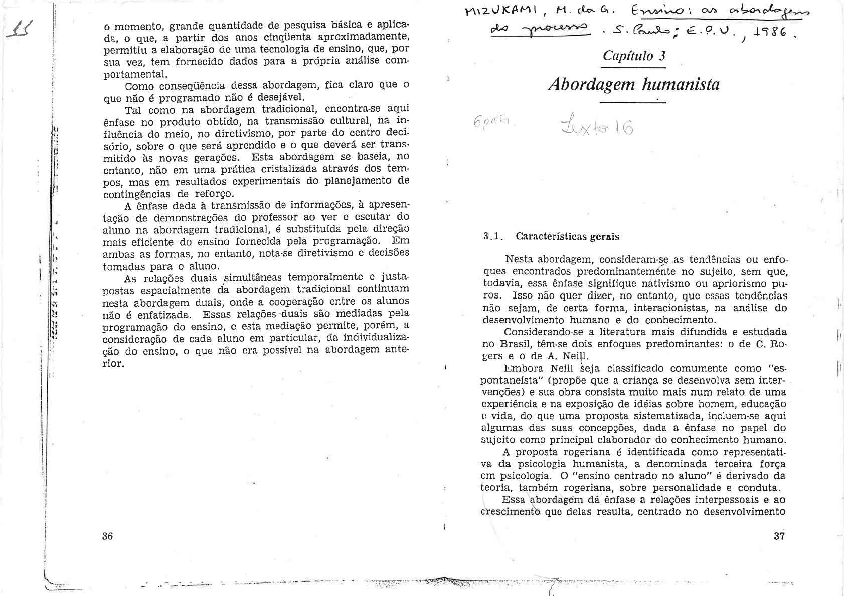 <p>M. da G. Ensino as momento, grande quantidade de pesquisa básica e aplica- da, o que, a partir dos anos aproximadamente, S. E.P.U 1986 permitiu a elaboração de uma tecnologia de ensino, que, por sua vez, tem fornecido dados para a própria análise com- Capítulo 3 portamental. Como dessa abordagem, fica claro que Abordagem humanista que não é programado não é desejável. Tal como na abordagem tradicional, encontra-se aqui ênfase no produto obtido, na transmissão cultural, na in- fluência do meio, no diretivismo, por parte do centro deci- 16 sório, sobre o que será aprendido e que deverá ser trans- mitido às novas gerações. Esta abordagem se baseia, no entanto, não em uma prática cristalizada através dos tem- pos, mas em resultados experimentais do planejamento de contingências de reforço. A ênfase dada à transmissão de informações, à apresen- tação de demonstrações do professor ao ver e escutar do aluno na abordagem tradicional, é substituída pela direção mais eficiente do ensino fornecida pela programação. Em 3.1. Características gerais ambas as formas, no entanto, nota-se diretivismo e decisões Nesta abordagem, consideram-se as tendências ou enfo- tomadas para o aluno. As relações duais simultâneas temporalmente e justa- ques encontrados no sujeito, sem que, postas espacialmente da abordagem tradicional continuam todavia, essa ênfase signifique nativismo ou apriorismo pu- nesta abordagem onde a cooperação entre os alunos ros. Isso não quer dizer, no entanto, que essas tendências não é enfatizada. Essas relações duais são mediadas pela não sejam, de certa forma, interacionistas, na análise do desenvolvimento humano e do conhecimento. programação do ensino, e esta mediação permite, porém, a Considerando-se a literatura mais difundida e estudada consideração de cada aluno em particular, da individualiza- no Brasil, têm-se dois enfoques predominantes: o de C. Ro- ção do ensino, o que não era possível na abordagem ante- gers e o de A. Neill. rior. Embora Neill seja classificado comumente como "es- (propõe que a criança se desenvolva sem inter- venções) e sua obra consista muito mais num relato de uma experiência e na exposição de idéias sobre homem, educação e vida, do que uma proposta sistematizada, incluem-se aqui algumas das suas concepções, dada a ênfase no papel do sujeito como principal elaborador do conhecimento humano. A proposta rogeriana é identificada como representati- va da psicologia humanista, a denominada terceira força em psicologia. O "ensino centrado no aluno" é derivado da teoria, também rogeriana, sobre personalidade e conduta. Essa abordagem dá ênfase a relações interpessoais e ao crescimento que delas resulta, centrado no desenvolvimento 36 37</p><p>da personalidade do indivíduo, em seus processos de cons- 2. Ser uma pessoa na qual os sentimentos e as expe- trução e organização pessoal da realidade, e em sua capaci- riências exerçam um papel muito importante, como fator dade de atuar, como uma pessoa integrada. Dá-se igualmen- de crescimento. te ênfase à vida psicológica e emocional do indivíduo e à 3. Ser uma pessoa que possui uma capacidade, uma preocupação com a sua orientação interna, com o autocon- tendência a desenvolver-se, a autodirigir-se, a reajustar-se, ceito, com o desenvolvimento de uma visão autêntica de si tendência e capacidade estas que devem ser liberadas não mesmo, orientada para a realidade individual e grupal. diretivamente, O professor em si não transmite conteúdo, dá assistên- 4. Ser uma pessoa considerada num presente imedia- cia, sendo um facilitador da aprendizagem. O conteúdo advém to, aqui e agora. das próprias experiências dos alunos. A atividade é consi- 5. Ser uma pessoa interagindo com outras pessoas, com- derada um processo natural que se realiza através da inte- preendida e aceita como tal, por parte de quem a ajuda. ração com o meio. O conteúdo da educação deveria consis- A crença na fé e a confiança (termos de Rogers) na capa- tir em experiências que o aluno reconstrói. O professor não cidade da pessoa, em seu próprio crescimento, constituem o ensina: apenas cria condições para que os alunos aprendam. pressuposto básico da teoria rogeriana. Em Terapia Centrada no Paciente (p. 467-506), Rogers 3.2. Homem coloca suas proposições acerca do homem e das possibili- dades que esse homem tem de tratar de forma construtiva a sua situação vital: O homem é considerado como uma pessoa situada no mundo. É único, quer em sua vida interior, quer em suas 1. Todo o indivíduo existe num mundo de experiência do percepçes e avaliações do mundo, A pessoa é considerada qual é o centro e que está em permanente mudança. em processo contínuo de descoberta de seu próprio ser, li- 2. O organismo reage ao campo perceptivo tal como este é gando-se a outras pessoas e grupos. experimentado e Este campo é, para o Quanto à epistemologia subjacente a essa posição, a experiência pessoal e subjetiva é o fundamento sobre o qual 3. organismo reage ao seu campo fenomenal como um todo organizado. o conhecimento abstrato é construído. Não existem, portan- 4. organismo tem uma tendência de base: realizar, man- to, modelos prontos nem regras a seguir, mas um processo ter e realçar a experiência de vir-a-ser. O objetivo último do ser humano é a auto-rea- 5. A conduta é fundamentalmente o esforço dirigido a um lização ou o uso pleno de suas potencialidades e capacida- fim do organismo para satisfazer as suas necessidades des. as experimentadas no campo apreendido. O homem não nasce com um fim determinado, mas go- 6. A emoção acompanha, e de modo geral facilita, a con- za de liberdade plena e se apresenta como um projeto per- duta dirigida para um fim. manente e inacabado. Não é um resultado, cria-se a si pró- 7. melhor ângulo para a compreensão da conduta é a prio. É, portanto, possuidor de uma