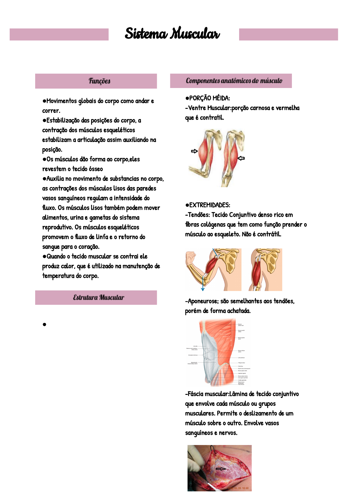 <p>Sistema Muscular</p><p>●Movimentos globais do corpo como andar e</p><p>correr.</p><p>●Estabilização das posições do corpo, a</p><p>contração dos músculos esqueléticos</p><p>estabilizam a articulação assim auxiliando na</p><p>posição.</p><p>●Os músculos dão forma ao corpo,eles</p><p>revestem o tecido ósseo</p><p>●Auxilia no movimento de substancias no corpo,</p><p>as contrações dos músculos lisos das paredes</p><p>vasos sanguíneos regulam a intensidade do</p><p>�uxo. Os músculos lisos também podem mover</p><p>alimentos, urina e gametas do sistema</p><p>reprodutivo. Os músculos esqueléticos</p><p>promovem o �uxo de linfa e o retorno do</p><p>sangue para o coração.</p><p>●Quando o tecido muscular se contrai ele</p><p>produz calor, que é utilizado na manutenção de</p><p>temperatura do corpo.</p><p>●</p><p>●PORÇÃO MÉIDA:</p><p>-Ventre Muscular:porção carnosa e vermelha</p><p>que é contratil.</p><p>●EXTREMIDADES:</p><p>-Tendões: Tecido Conjuntivo denso rico em</p><p>�bras colágenas que tem como função prender o</p><p>músculo ao esqueleto. Não é contrátil.</p><p>-Aponeurose; são semelhantes aos tendões,</p><p>porém de forma achatada.</p><p>-Fáscia muscular:Lâmina de tecido conjuntivo</p><p>que envolve cada músculo ou grupos</p><p>musculares. Permite o deslizamento de um</p><p>músculo sobre o outro. Envolve vasos</p><p>sanguíneos e nervos.</p><p>-</p>