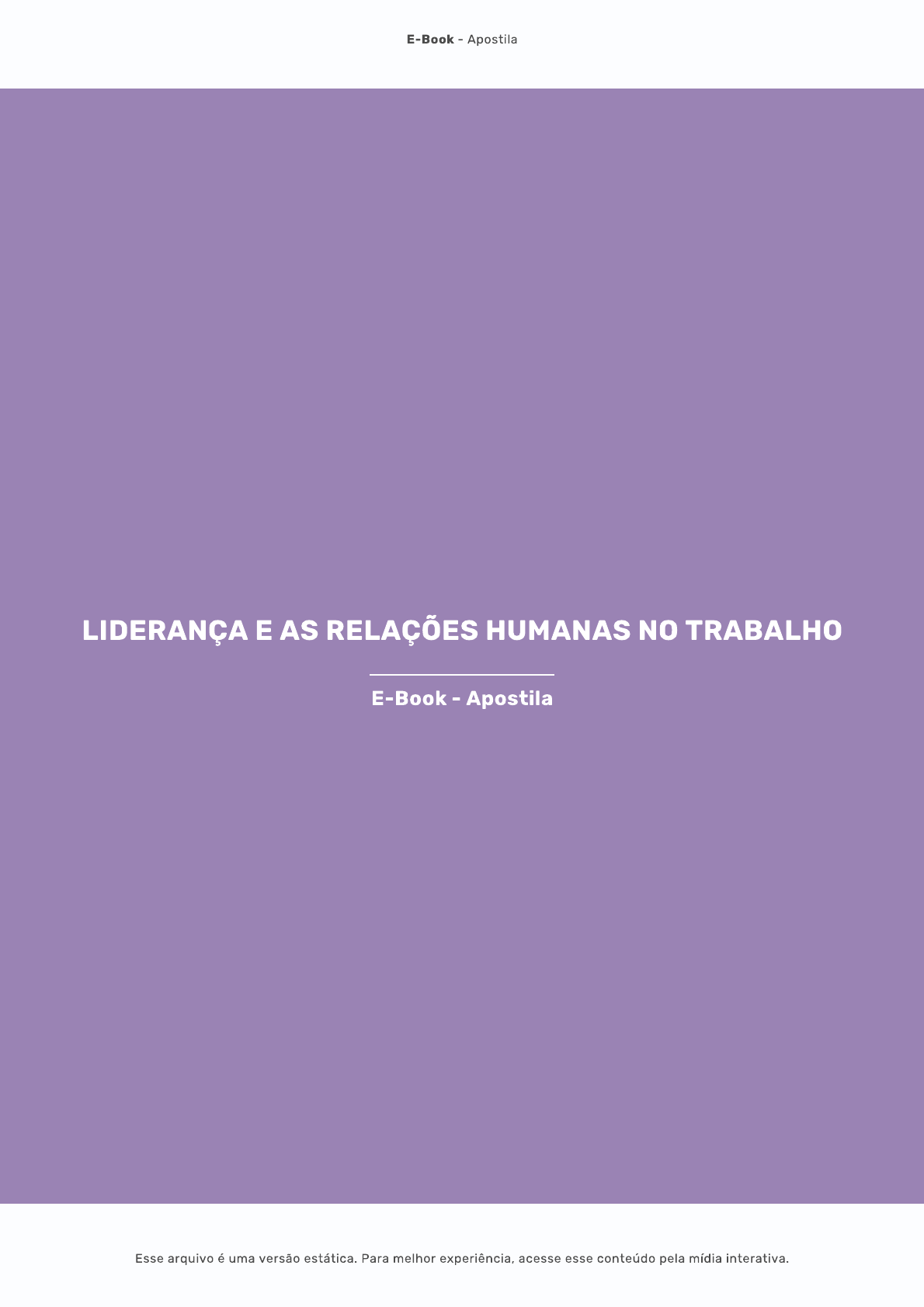<p>E-Book Apostila LIDERANÇA E AS RELAÇÕES HUMANAS NO TRABALHO E-Book - Apostila Esse arquivo é uma versão estática. Para melhor experiência, acesse esse conteúdo pela mídia interativa.</p><p>E-Book Apostila Conceitos Sobre Liderança, Perfil e Estilos de Liderança MINHAS METAS Proporcionar o conhecimento sobre os conceitos de gestão de liderança. Estimular a aprendizagem de "O que esperar de um líder". Identificar o perfil do líder. Proporcionar o conhecimento dos estilos de liderança. Inicie sua Jornada Neste encontro, você poderá ter acesso aos aspectos relevantes em relação à Liderança (palavra de origem inglesa existente desde os tempos das cavernas), e compreenderá que a palavra "Líder" não era muito utilizada ou valorizada na época, mas o fato é que sempre existiu alguém que direcionava ou "mandava" no grupo. Nesse período, o líder tinha como função o poder de "Mando", ou seja, a ordem dada deveria ser imediatamente acatada indiferente do resultado obtido. Este estilo de liderança gerava claramente desmotivação, insatisfação, improdutividade e imperfeição nos produtos acabados. Verificará que o homem, analisando a dificuldade das empresas em conseguirem atingir uma produção baseada na quantidade e qualidade dos seus produtos, resolveu estudar para compreender o que poderia ser feito para mudar este cenário. Este estudo perdurou por longos anos de pesquisas voltadas diretamente ao comportamento do ser humano. Sendo assim, algumas organizações começaram a colocar em prática, por meio de treinamentos, a postura ideal de um líder para com os seus liderados, obtendo, assim, ambiente saudável e produtivo. Dessa forma, o ambiente de trabalho e os resultados produtivos começaram a melhorar, compreenderam, então, que a liderança é um dos principais pilares de uma organização. Você, aluno(a), irá estudar que a melhor maneira de liderar é na qual o líder orienta, motiva, treina, agradece e inspira pessoas para eficácia e qualidade. 2 - 143</p><p>E-Book Apostila Diante do apresentado, verifica-se que as organizações começaram a ser mais criteriosas na seleção de seus líderes, buscando estilos diferentes dos padrões anteriores e se depararam com muitas pessoas de ótima capacidade técnica para administrar um grupo de pessoas, porém, com rara competência comportamental, tornando-se inviável apostar na liderança deste perfil. Devido a esta situação, o que começou a predominar na seleção de um líder é a boa desenvoltura no qual o aprimoramento técnico pode ser treinado. Agora é com você, aluno(a). Vamos nessa aventura? Desenvolva seu Potencial Conceitos de liderança A Liderança, oriunda da língua inglesa, tornou-se uma palavra corrente na linguagem industrial moderna. Muitos a desejam, principalmente os dirigentes que as veem como ferramenta fundamental para o desenvolvimento, treinamento e manutenção de uma capacitada equipe de trabalho; no espaço de tempo, tornou-se um instrumento poderoso para inspirar pessoas a atingirem ótimos resultados. A atração pela liderança decorre basicamente de dois perfis: liderar está associado à ideia de grandes personalidades da história, como Steve Jobs e Martin Luther King e, ainda, possui uma dimensão mágica, ou seja, a utilização hábil de algumas qualidades inatas. É capaz de transformar pessoas, dirigentes, em grandes e respeitáveis líderes. A ideia de liderar é também mais simpática e atraente do que a de administrar, comandar, dirigir ou gerenciar. Há anos, falar em equipe era raro, elas existiam (aliás, equipe sempre existiu)! Contudo, a importância dada era mínima a este papel, as que existiam eram convencionais, compostas de pessoas orientadas para exercer a função de mando. Todas as organizações têm equipes, e existem em muitos formatos, e cada uma possui seu próprio potencial que se desmorona com a incapacidade de gestão. As pessoas têm sido unidade importante de realidade organizacional desde que existem as organizações, iniciada no século XVIII, na Revolução Industrial. Começou-se, então, a analisar se as organizações eram compostas por grupo de trabalho ou equipes, no qual ambos eram pessoas fazendo algo juntas. Este "algo" que uma equipe faz não é o que a torna uma equipe, é o "juntos" que interessa. EM FOCO 3 143</p><p>E-Book Apostila Desafiando Gigantes (Vídeo Motivacional) Neste vídeo, podemos ver que quando motivado da forma correta por um líder experiente que sabe além de partilhar, delegar e premiar, podemos ir muito além do que imaginamos e, assim, também podemos despertar espírito de liderança que há em nós. Trecho do vídeo que representa as vezes em que não damos devido valor ao que somos e ao que podemos ser, e que também, muitas vezes, precisamos nos motivar e/ou ser motivado. Vídeo Clique aqui para abrir vídeo Um conceito muito expressivo de liderança foi o Japão que, após a 2a Guerra, estava sem infraestrutura, mas haviam pessoas determinadas, com disposição social para trabalharem juntas e com visão e discernimento para traçar estratégias e praticá-las. Atualmente, o Japão é considerado o país da melhoria contínua nos processos devido ao engajamento das pessoas com suas atribuições. Todas as ideias, por mais simples que se apresentassem, tinha relevância de análise. Todos participavam. Nos países com foco no desenvolvimento, as organizações estão mudando de grupos para equipes, e direcionando suas diretrizes para: -143</p><p>E-Book Apostila Aumentar a produtividade. Melhorar a comunicação. Melhorar o uso dos recursos. Mais criatividade e eficiência na resolução de problemas. Decisões de alta qualidade por meio do princípio do conhecimento compartilhado. Melhores produtos e serviços. Processos melhorados. As organizações que elencam a formação de equipes com a orientação de indicadores (potencial de uma empresa para crescimento) tem a consciência do resultad