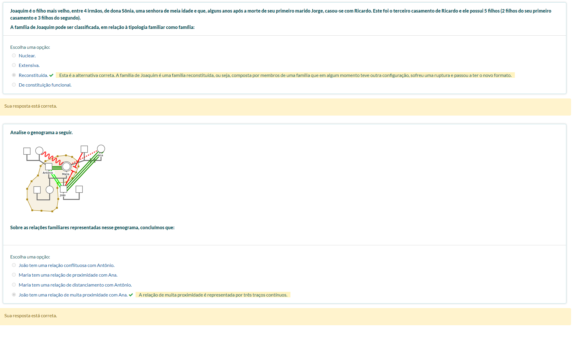 <p>Joaquim é o filho mais velho, entre 4 irmãos, de dona Sônia, uma senhora de meia idade e que, alguns anos após a morte de filhos (2 filhos do seu primeiro casamento e 3 filhos do segundo). A família de Joaquim pode ser classificada, em relação à tipologia familiar como família: Escolha uma opção: Nuclear. Extensiva. Reconstituída. Esta é a alternativa correta. A família de Joaquim é uma família ou seja, composta por membros de uma família que em algum momento teve outra configuração, sofreu uma ruptura e passou a ter novo formato. De constituição funcional. Sua resposta está correta. Analise genograma a seguir. Antônio Maria João Sobre as relações familiares representadas nesse genograma, concluímos que: Escolha uma opção: João tem uma relação conflituosa com Antônio. Maria tem uma relação de proximidade com Ana. Maria tem uma relação de distanciamento com Antônio. João tem uma relação de muita proximidade com Ana. A relação de muita proximidade é representada por três traços contínuos. Sua resposta está correta.</p>