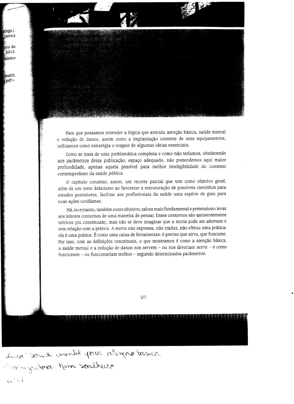 <p>Contra eiro do 2012. health, Para que possamos entender a lógica que articula atenção básica, saúde mental e redução de danos, assim como a implantação coerente de seus equipamentos, utilizamos como estratégia resgate de algumas ideias essenciais. Como se trata de uma problemática complexa e como não teríamos, obedecendo aos parâmetros desta publicação, espaço adequado, não pretendemos aqui maior profundidade, apenas aquela possível para melhor inteligibilidade do contexto contemporâneo da saúde pública. O capítulo constitui, assim, um recorte parcial que tem como objetivo geral, além de um certo didatismo ao favorecer a estruturação de possíveis caminhos para estudos posteriores, facilitar aos profissionais da saúde uma espécie de guia para suas ações cotidianas. Há, no entanto, também outro objetivo, talvez mais fundamental e pretensioso: levar aos leitores contornos de uma maneira de pensar. Esses contornos são eminentemente teóricos (ou conceituais), mas não se deve imaginar que a teoria pode ser abstrata e sem relação com a prática. A teoria não expressa, não traduz, não efetua uma prática; ela é uma prática. É como uma caixa de ferramentas: é preciso que sirva, que funcione. Por isso, com as definições conceituais, que mostramos é como a atenção básica, a saúde mental e a redução de danos nos servem - ou nos deveriam servir - - e como funcionam - ou funcionariam melhor - segundo determinados parâmetros. 127 basica</p><p>SAÚDE MENTAL PARA A ATENÇÃO BÁSICA O SETOR SAÚDE ANTES DA CONSTITUIÇÃO DE 1988 Dentre tantos conceitos e ideias importantes que foram e continuam a ser produzidos pela Reforma Sanitária, selecionamos um que talvez seja o pano de fundo que torna inteligível todo o sistema, embora pareça óbvio: o conceito de saúde. Antes da implantação do Sistema Único de Saúde (SUS) em especial nos anos que compreenderam o período de ditadura militar pelo termo saúde entendia-se. basicamente, a ausência de doença. Essa definição, proposta em 1977 pelo filósofo estadunidense Christopher Boorse (Almeida Filho & 2002), tornou-se comum e ainda podemos percebê-la culturalmente hegemônica no Brasil. Saúde como ausência de doença não é apenas uma definição aparentemente simples, mas é, também, objetiva, na medida em que torna possível relacionarmos ao termo doença certas alterações orgânicas com causa identificável nas lesões características, percebidas em observações clínicas e visíveis pela pesquisa anatomopatológica. É essa objetividade que permite aos médicos identificar, com certo rigor, as doenças, entendê-las através de seus vínculos causais (cada doença tem suas causas ou seus agentes etiológicos) e, assim, identificar seus efeitos por meio de sinais, sintomas e lesões características associadas (embora raramente sejam É assim que a medicina científica pode chamar de doença um acontecimento no qual é possível identificar sinais e sintomas característicos, lesão específica no órgão acometido e causa identificada (por exemplo, presença de sinais e sintomas, como tosse por mais de duas semanas, produção de catarro, hemoptise, febre, sudorese, cansaço, dor no peito, falta de apetite, emagrecimento, com evidência de lesão da estrutura alveolar e formação de cavernas, são características da tuberculose pulmonar, causada pelo Mycobacterium tuberculosis, o bacilo de Koch). Doença, portanto, é uma palavra utilizada para expressar objetivamente uma alteração biológica que acomete um órgão ou organismo, de forma plenamente identificável e quantificável, cuja causa (ou etiologia) não é apenas possível de ser é necessária para o processo de restituição da saúde. A essa ideia de saúde e doença, liga-se a especificidade profissional daqueles aptos a desempenhar as intervenções técnicas pára a obtenção da cura (médicos, enfermeiros etc). Cura que nada mais é que o retorno ao estado considerado ideal de ausência de doença. Usando exemplo anterior, a cura se diz a partir de uma série de eventos, mais ou menos sequenciais, na qual um profissional de saúde específico (o médico) consegue identificar com exames clínicos e laboratoriais a doença e sua causa, aplicando-lhe o tratamento adequado que culmina com a eliminação dos sinais e sintomas, a partir da destruição ou neutralização da causa (no caso do exemplo, o bacilo de Koch). 1 Sinais, sintomas ou alterações anatomopatológicas que, de maneira exclusiva, identificam uma doença; por exemplo, os corpúsculos de Negri são patognomônicos da raiva. 128</p><p>Saúde Pública, Saúde Mental e a Lógica Ampliada da Redução de Danos Por isso modelo de organização do setor saúde baseado na ausência de doença foi denominado curativista ou Tendo como lógica a ideia de saúde como ser ausência de doença, modelo curativista no Brasil se bifurcou em dois eixos gerais fundo 1) recuperação da saúde expressou-se prioritariamente nos hospitais gerais, emergências, ambulatórios e afins teve e tem suas ações voltadas bs anos para indivíduo, é dependente das demandas produzidas pela doença já instalada, e sua meta se limita à obtenção da cura (e corolários, como a filósofo mitificação da dor). bmum e 2) prevenção da doença fez-se por meio de campanhas massivas, coletivas (por isso no Brasil foi chamado também de campanhista), visando ao combate de epidemias e ao controle de endemias (como a febre amarela, termo dengue, malária), através de barreiras físicas ou de vacinações (ex.: contra a varíola ou poliomielite). Antes do SUS, esses eixos se materializaram dentro do Estado brasileiro não doenças ou seus como hoje, em um único órgão (o Ministério da Saúde), mas em dois subsistemas de tomas e saúde paralelos, um no Ministério da Previdência (eixo recuperação da saúde) e outro no Ministério da Saúde (eixo prevenção da A crítica ao modelo 