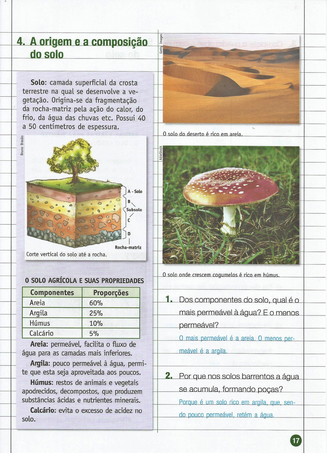 <p>4. A origem e a composição do solo Solo: camada superficial da crosta terrestre na qual se desenvolve a ve- getação. Origina-se da fragmentação da rocha-matriz pela ação do calor, do frio, da água das chuvas etc. Possui 40 a 50 centímetros de espessura. 0 solo do deserto é rico em areia. A Solo Subsolo C D Rocha-matriz Corte vertical do solo até a rocha. 0 solo onde crescem cogumelos é rico em húmus. 0 SOLO AGRÍCOLA E SUAS PROPRIEDADES Componentes Proporções Areia 60% 1. Dos componentes do solo, qual é Argila 25% mais permeável à água? E menos Húmus 10% permeável? Calcário 5% 0 mais permeável é a areia. 0 menos per- Areia: permeável, facilita o fluxo de água para as camadas mais inferiores. meável é a argila. Argila: pouco permeável à água, permi- te que esta seja aproveitada aos poucos. 2. Por que nos solos barrentos a água Húmus: restos de animais e vegetais apodrecidos, decompostos, que produzem se acumula, formando poças? substâncias ácidas e nutrientes minerais. Porque é um solo rico em argila, que, sen- Calcário: evita o excesso de acidez no solo. do pouco permeável, retém a água. 17</p><p>3. Complete O quadro abaixo com os 5. 0 preparo e a preservação componentes do solo agrícola e as do solo respectivas porcentagens. A agricultura é uma importante ati- Componente Porcentagem vidade humana que utiliza o solo para húmus 10% o cultivo de variedades vegetais. 0 cultivo de terras é também chamado areia 60% de lavoura. argila 25% REGRAS BÁSICAS PARA MANTER calcário 5% 0 SOLO APROVEITÁVEL Aragem: para deixar o solo fofo. 4. Complete as seguintes frases. Com o emprego de enxadas, pás ou rastelos (ancinhos), arado ou tratores, o solo é afofado, per- a) Solo é a camada superficial mitindo que água e ar entrem ali com mais facilidade. da crosta terrestre na qual se Irrigação: processo artificial de desenvolve a aguar o solo com mangueiras, o b) O calcário e a areia são com- bombeamento da água ou a cons- trução de açudes. ponentes do solo permeáveis à água, enquanto a argila é pra- ticamente impermeável. c) Da decomposição de restos de vegetais e animais origina-se húmus que fertiliza solo. d) As rochas, sob a ação do calor, do frio e da água das chuvas, Solo sendo arado. fragmentam-se, originando as Drenagem: retirada do excesso de partículas do solo água (com bombas aspiradoras de água, abertura de valetas ou ater- ramento do solo). Adubação: para evitar o esgo- tamento de certos componentes químicos do solo, sobretudo do nitrogênio (principal componente 18</p><p>das proteínas), do fósforo (para as 2. Qual é a finalidade da aragem? atividades energéticas) e do po- Como ela é feita? tássio (para aumentar a resistência das plantas às doenças). Afofar 0 solo. é feita revolvendo-se a Os adubos podem ser: terra por meio de enxadas, rastelos, pás químicos, em geral, preparados etc. com esses principais minerais. orgânicos, preparados a partir de restos de plantas, cascas de ovos, farinha, ossos e outros restos animais. 3. O que é irrigação? Como pode ser feita? É 0 processo artificial de aguar 0 solo. Pode ser feita por regadores, mangueiras ligadas a torneiras ou por um sistema de encana- mentos ligados a poços ou e acio- nados por motores. 0 solo adubado é importante para o plantio. Calagem: aplicação de calcário para diminuir a acidez do solo, facilitando a absorção dos nutrien- tes minerais pelas plantas. 4. Com decorrer do tempo, os ve- Rotação de culturas: alternância getais vão utilizando os nutrientes do tipo de cultura para evitar o esgotamento do solo. do solo, tendendo a esgotá-los. O que se deve fazer para que isso não aconteça? 1. Por que o solo para plantio não A adubação. pode apresentar-se compacto e endurecido? Porque impede a circulação do ar e da 5. Explique como é feito esse pro- água. cesso. É 0 processo de reposição de elementos minerais retirados do solo pelas 19</p><p>6. Que elementos químicos contêm 8. A figura abaixo mostra O ciclo dos adubos minerais complexos? minerais que adubam solo. Ob- Qual é a sua importância? serve a figura e explique como os Nitrogênio, fósforo e potássio. 0 nitrogênio minerais se formam. é importante para 0 desenvolvimento de CICLO DOS MINERAIS sementes, raízes, caules e folhas, pois ele é 0 principal integrante das 0 fósforo atua em todas as atividades ener- géticas das 0 potássio aumenta a resistência das plantas às restos de animais e de plantas minerais livres absorção de decomposição agua e minerais pelas raízes por bactérias e fungos Os restos dos seres vivos se decompõem 7. Qual é a composição do adubo or- pela ação de bactérias e fungos liberando gânico? os minerais que os compõem. Os minerais 0 adubo orgânico é constituído de restos se diluem na água e são absorvidos pelas de vegetais (folhas, ramos, frutos etc.) e de raízes dos restos de animais (estrume, OSSOS, cascas de ovos etc.) 20</p><p>9. Qual é a parte da planta responsá- 13. Qual é a consequência do exces- vel pela absorção dos nutrientes? de acidez num solo? Que pro- A vidência você tomaria se soubesse que O solo de sua horta ou de seu pomar apresenta esse problema? Explique. 10. De que maneira nutrientes do A consequência do excesso de acidez é solo chegam às folhas dos vege- que fica diminuída a absorção dos minerais tais? e, como consequência, diminui-se também Por meio do caule. a produtividade. Para solucionar esse pro- blema em uma horta ou pomar, aplicaria a calagem, isto é, colocaria calcário no solo para facilitar a absorção dos nutrientes pela 11. Em que parte das plantas nu- planta. trientes minerais do solo são trans- formados em nutrientes orgânicos? Nas folhas e outras partes verdes da planta. 14. Suponhaquevocê não tenha um va- SO de barro para um plantio e vá 12. O que você entende por rotação de usar, no lugar, uma lata. Que provi- culturas? dências você tomaria em r