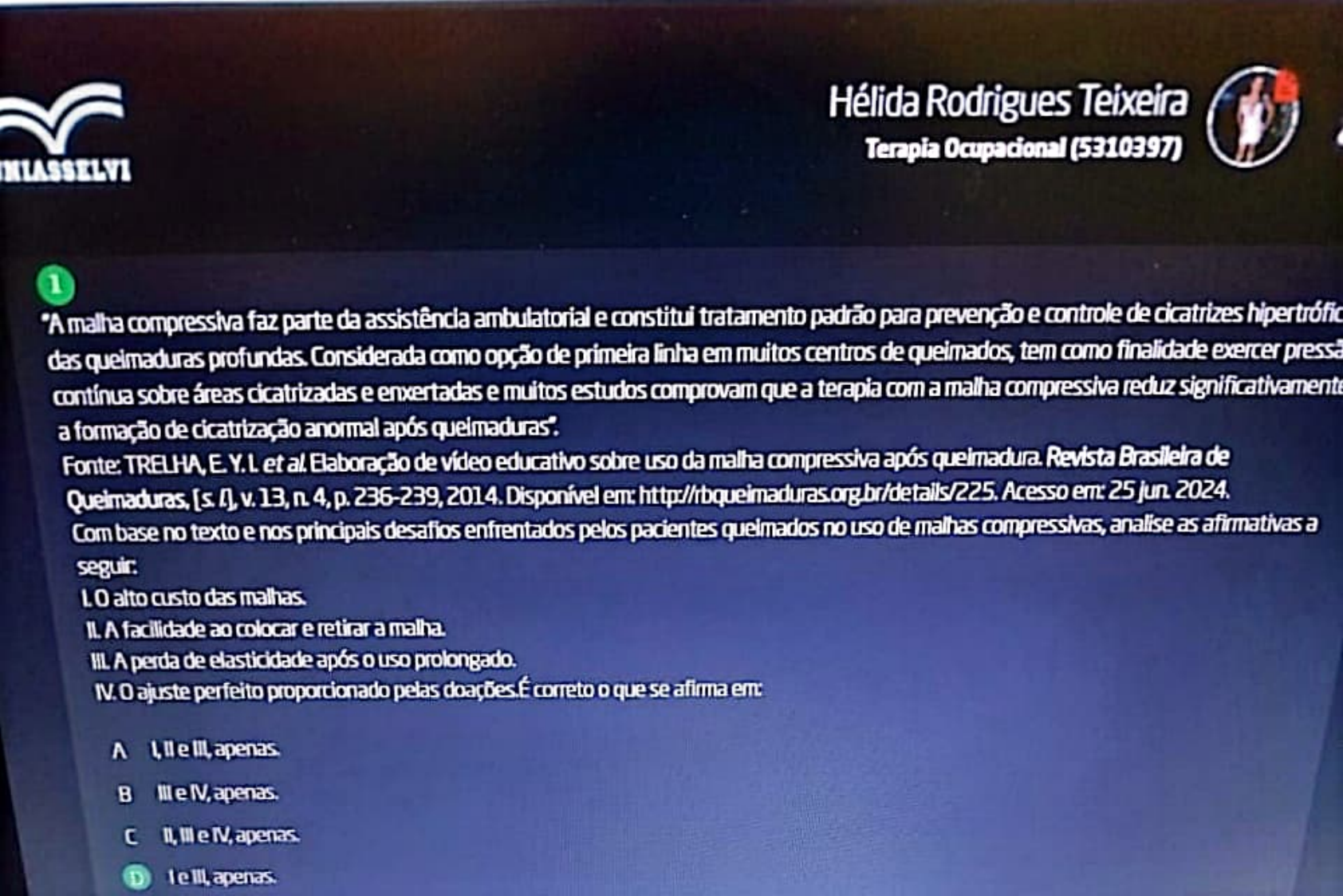 <p>Hélida Rodrigues Teixeira Terapia Ocupacional (5310397) 1 "A malha compressiva faz parte da assistência ambulatorial e constitui tratamento padrão para prevenção e controle de cicatrizes hipertrófic das queimaduras profundas. Considerada como opção de primeira linha em muitos centros de queimados, tem como finalidade exercer pressa contínua sobre áreas cicatrizadas e enxertadas e muitos estudos comprovam que a terapia com a malha compressiva reduz significativamente a formação de cicatrização anormal após Fonte: Y.L et al. Elaboração de vídeo educativo sobre uso da malha compressiva após Revista Brasileira de n. 236-239, 2014. Disponível Acesso 25 jun 2024. Com base no texto e nos principais desafios enfrentados pelos pacientes queimados no de malhas compressivas, analise as afirmativas a seguir. LO alto custo das IL A facilidade ao colocar e retirar a malha HL A perda de elasticidade após o IV. ajuste perfeito proporcionado pelas doações.É correto que se afirma A e e C e e</p><p>Hélida Rodrigues Teixeira Terapia Ocupacional (5310397) "A doença de Parkinson (DP) é a segunda doença crônica neurodegenerativa de maior incidência em pessoas com idade entre 55 e 65 anos DP, a morte das células dopaminérgicas, causando alteração na produção de dopamina, um neurotransmissor responsável pelo movimento. A morte dessas estruturas gera falta de coordenação dos movimentos e é evidenciada nos indivíduos por tremores e anormal da mobilidade corporal e realização de atividades. [-] Devido às alterações motoras e não motoras que a doença propicia, indivíduos com a DP obtêm maior risco de acidentes por quedas quando comparados aos controles Fonte: SILVA, F. da et al Avaliação do risco de quedas entre pessoas com doença de Escola Anna Nery, Lv.26, e20210131, 2022. Disponível Acesso em: 20 jun. 2024. Com base no texto e nas estratégias terapêuticas para reduzir risco de quedas em pacientes com doenças neurológicas, assinale a alternativa que descreve uma das estratégias frequentemente adotadas para melhorar a independência e a funcionalidade desses pacientes: A A utilização exclusiva de equipamentos adaptativos para reabilitação motora B A limitação de informações ao visando evitar sobrecarga A modificação do ambiente doméstico ou local de trabalho para torná-lo mais acessível e seguro. D fornecimento, aos pacientes, de medicações exclusivas para a mobilidade. E treinamento cognitivo para fortalecer a</p><p>Hélida Rodrigues Teixeira 2 Terapia Ocupacional (5310397) UNLASSELVI "As doenças neurodegenerativas são distúrbios progressivos do sistema nervoso que resultam na perda gradual de neurônios. Podem ser desencadeadas por fatores genéticos, proteínas anormais, estresse oxidativo e exposição a substâncias Apresentam características debilitantes, incuráveis, de início gradual e progressão crônica, causando perturbações físicas e cognitivas que podem Kostic Rodrigues, 2023, 6741) Fonte: CARVALHO, C-KOSTIC de A. Doenças neurodegenerativas associadas com as fases da las 2023. Disponível em: em: 25 2024. Com base no texto e nos métodos frequentemente utilizados na avaliação de pacientes com condições rológicas em ambientes hospitalares, analise as afirmativas a seguir. específicos de avaliação IL Testes cognitivos que avaliam funções como memória, atençãoe linguagem. Exames de imagem, como magnética e tomografia correto o que se afkma em: A le Lapenas D E</p><p>Hélida Rodrigues Teixeira 2 UNLASSELVI Terapia Ocupacional (5310397) Paciente MSS. masculino, 25 anos, branco, apresentando corporal (SCQ) tota de 74% de segundo grau superficial, 13% de segundo grau profundoe 5% de terceiro Diagrama de área queimada 21:10</p><p>Hélida Rodrigues Teixeira 2 Terapia Ocupadonal (5310397) afirmativas a LO paciente éum Grande Queimado, pois apresenta queimaduras de primeiro grau (qualquer percentagem). IL paciente é um Médio Queimado, pois apresenta queimaduras de segundo grau em mão, pé, face, axila ou grande articulação. III. paciente éum Médio pois apresenta ras de terceiro grau em <10% do corpoe não envolve paciente éum Grande pois apresenta queimaduras de segundo e terceiro grau acometendo períneoe mão, pé, face ou axila É afirma A e apenas D apenas E 5 doenças degenerativas, como Mal de Parkinson Doença de essencialmente déficits motores trazendo nas atividades no das Fica que POR 21:10</p><p>Hélida Rodrigues Teixeira Terapia Ocupacional (5310397) 5 "As doenças degenerativas, como Mal de Parkinson e a Doença de Alzheimer, se caracterizam essencialmente por déficits motores e na capacidade cognitiva, trazendo prejuízos nas atividades manuais, que interfere no desempenho das capacidades cotidianas. claro que são necessárias alternativas para cuidado e tratamento de pacientes portadores de Doenças Degenerativas, a fim de reduzir a sobrecarga dos profissionais de saúde e minimizar custos causados pelas Dessa forma, a utilização de alternativas ao tratamento como éo caso das tecnologias assistivas, pode atenuar impacto social causado, contribuindo também na qualidade de vida dos pacientes' (Lima, 2020, 130). Fonte: CCA da tecnologia para tratamento de doenças degenerativas. RESU-Revista Educação em 2020. Disponível Acesso em: 25 2024. Com base no textoe papel dos terapeutas ocupacionais no uso de tecnologias assistivas para pacientes com condições neurológicas neurodegenerativas, sobre a importância de adaptar essas tecnologias às limitações individuais dos pacientes, analise as afirmativas a LPara tomar as atividades mais difíceis de serem Para a do paciente em atividades Para maximizar a participação do paciente em atividades Para aumentar a independência do paciente em relação aos dispositivos correto que se afirma em A B</p><p>Hélida Rodrigues Teixeira Terapia Ocupacional (5310397) Fonte: LIMA, LLA et U uso da tecnologia para o tratamento de doenças KESU em 2