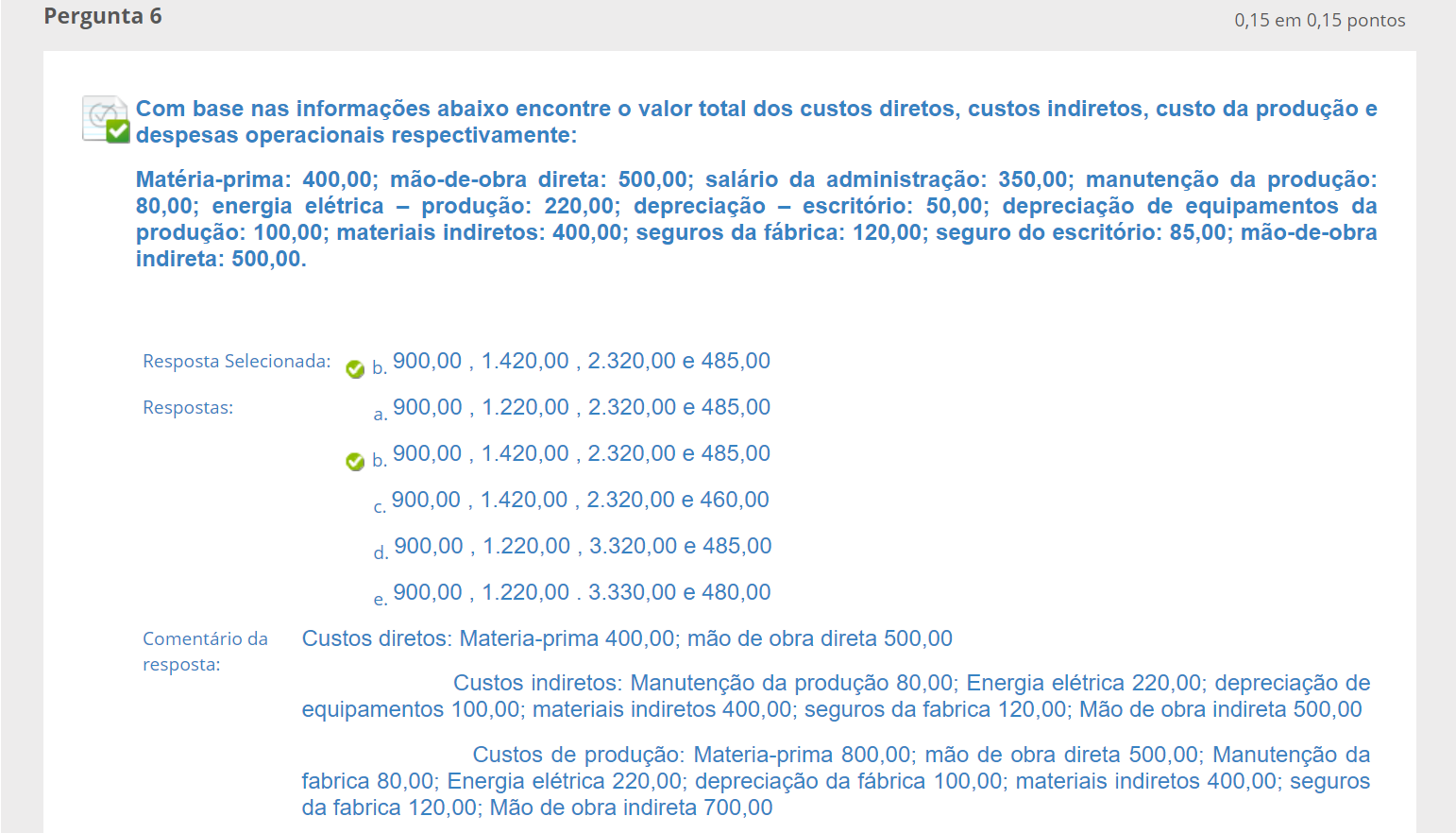 <p>Pergunta 6 0,15 em 0,15 pontos Com base nas informações abaixo encontre o valor total dos custos diretos, custos indiretos, custo da produção e despesas operacionais respectivamente: Matéria-prima: 400,00; mão-de-obra direta: 500,00; salário da administração: 350,00; manutenção da produção: 80,00; energia elétrica - produção: 220,00; depreciação - escritório: 50,00; depreciação de equipamentos da produção: 100,00; materiais indiretos: 400,00; seguros da fábrica: 120,00; seguro do escritório: 85,00; mão-de-obra indireta: 500,00. Resposta Selecionada: b. 900,00 1.420,00 2.320,00 e 485,00 Respostas: a. 900,00 1.220,00 2.320,00 e 485,00 b. 900,00 1.420,00 2.320,00 e 485,00 C. 900,00 1.420,00 , 2.320,00 e 460,00 d. 900,00 1.220,00 3.320,00 e 485,00 e. 900,00 1.220,00.3.330,00 e 480,00 Comentário da Custos diretos: Materia-prima 400,00; mão de obra direta 500,00 resposta: Custos indiretos: Manutenção da produção 80,00; Energia elétrica 220,00; depreciação de equipamentos 100,00; materiais indiretos 400,00; seguros da fabrica 120,00; Mão de obra indireta 500,00 Custos de produção: Materia-prima 800,00; mão de obra direta 500,00; Manutenção da fabrica 80,00; Energia elétrica 220,00; depreciação da fábrica 100,00; materiais indiretos 400,00; seguros da fabrica 120,00; Mão de obra indireta 700,00</p>