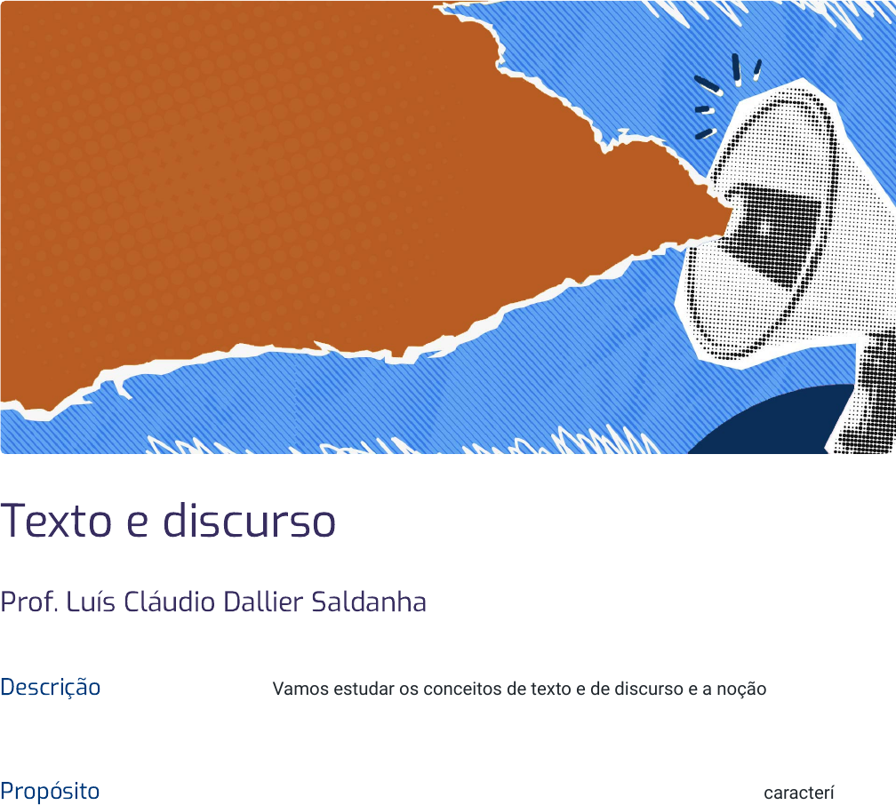<p>Texto e discurso</p><p>Prof. Luís Cláudio Dallier Saldanha</p><p>Descrição Vamos estudar os conceitos de texto e de discurso e a noção de gêneros textuais, abordando</p><p>suas implicações na produção e leitura de textos.</p><p>Propósito Ao compreender a distinção entre texto e discurso, além das características dos gêneros textuais,</p><p>você poderá identificar estratégias e cuidados necessários à elaboração e à leitura de um texto.</p><p>02/09/24, 10:16 Texto e discurso</p><p>https://stecine.azureedge.net/repositorio/00212hu/00234/index.html?brand=estacio# 1/58</p><p>Objetivos</p><p>Módulo 1</p><p>O conceito de</p><p>texto e de</p><p>discurso</p><p>Distinguir os conceitos de texto e de</p><p>discurso.</p><p>Módulo 2</p><p>A elaboração do</p><p>texto</p><p>Identificar aspectos da distinção entre</p><p>texto e discurso na produção textual.</p><p>Módulo 3</p><p>Gêneros textuais</p><p>Reconhecer o conceito de gêneros</p><p>textuais e suas implicações na leitura</p><p>de textos.</p><p>A escrita e a leitura são duas práticas fundamentais na vida acadêmica e</p><p>profissional. Vivemos num mundo letrado, em ambientes físicos ou virtuais que</p><p>são povoados por textos. Cada texto desempenha uma determinada função,</p><p>atende a um objetivo, está relacionado com certa prática social ou situação de</p><p>comunicação e interação.</p><p>Escrevemos textos para serem lidos e lemos textos que foram escritos com</p><p>determinadas intenções. Tudo isso nos conduz à relação entre texto, discurso e</p><p>Introdução</p><p>02/09/24, 10:16 Texto e discurso</p><p>https://stecine.azureedge.net/repositorio/00212hu/00234/index.html?brand=estacio# 2/58</p><p>Material para download</p><p>Clique no botão abaixo para fazer o download do conteúdo completo em formato</p><p>PDF.</p><p>Download material</p><p>gêneros textuais. Por isso, vamos estudar esses conceitos e conhecer algumas</p><p>recomendações para ler e escrever melhor.</p><p>Vamos aos estudos!</p><p>02/09/24, 10:16 Texto e discurso</p><p>https://stecine.azureedge.net/repositorio/00212hu/00234/index.html?brand=estacio# 3/58</p><p>javascript:CriaPDF()</p><p>1 - O conceito de texto e de discurso</p><p>Ao �nal deste módulo, você será capaz de distinguir os conceitos de texto e de</p><p>discurso.</p><p>Intencionalidade da nossa fala ou</p><p>escrita</p><p>02/09/24, 10:16 Texto e discurso</p><p>https://stecine.azureedge.net/repositorio/00212hu/00234/index.html?brand=estacio# 4/58</p><p>Todas as vezes em que você se comunica ou interage com alguém, há sempre uma</p><p>intenção ao falar ou ao escrever.</p><p>Representação de atos de comunicação.</p><p>Dependendo dessa intenção ou da finalidade do ato de comunicação, haverá maneiras</p><p>diferentes de construir sua fala e sua escrita, ou seja, você acabará usando modos</p><p>específicos para se expressar ou interagir por meio da língua.</p><p>As formas características do uso da língua se manifestam em</p><p>determinadas estruturas, isto é, dito de outra forma, aparecem em</p><p>modos peculiares de organizar o discurso ou o ato de</p><p>comunicação. Independentemente da finalidade, sua escrita ou</p><p>sua fala se organizam a partir de estruturas definidas, que muitas</p><p>vezes até passam despercebidas.</p><p>Convidamos você a analisar a seguinte situação:</p><p>Imagine que Rodrigo chegou em casa ansioso por contar à sua esposa, Cristina, algo</p><p>que aconteceu no trabalho, uma situação ocorrida que lhe deu muita esperança de ser</p><p>promovido.</p><p>02/09/24, 10:16 Texto e discurso</p><p>https://stecine.azureedge.net/repositorio/00212hu/00234/index.html?brand=estacio# 5/58</p><p>Marido contando uma novidade para a sua esposa.</p><p>Falamos e escrevemos com as mais diferentes intenções, adequando nosso ato de</p><p>comunicação a partir delas, por isso devemos concluir que há diversas formas de</p><p>organizar o discurso. Isso também implica dizer que existem diversos gêneros</p><p>textuais, além daquelas moda lidades que você deve ter aprendido na escola, como</p><p>narração, descrição e dissertação.</p><p>Rodrigo - Eu acho que vou ser promovido!</p><p>Cristina - Como assim?</p><p>Rodrigo - Hoje eu estava em minha sala quando o chefe abriu a porta e disse que em</p><p>breve terei uma boa notícia.</p><p>Atividade discursiva</p><p>No diálogo anterior, qual modalidade você acha que Rodrigo utilizou para contar o fato</p><p>ocorrido?</p><p></p><p>02/09/24, 10:16 Texto e discurso</p><p>https://stecine.azureedge.net/repositorio/00212hu/00234/index.html?brand=estacio# 6/58</p><p>Digite sua resposta aqui</p><p>Chave de resposta</p><p>Intencionalidade da nossa fala ou</p><p>escrita</p><p>Confira neste vídeo situações de comunicação e interação por meio da escrita e da</p><p>fala que mostram a intencionalidade no uso da língua.</p><p></p><p>02/09/24, 10:16 Texto e discurso</p><p>https://stecine.azureedge.net/repositorio/00212hu/00234/index.html?brand=estacio# 7/58</p><p>A distinção e interdependência</p><p>entre texto e discurso</p><p>Para compreender tudo isso e identificar possíveis aplicações no uso da língua, você</p><p>aprenderá os conceitos de discurso e de texto para, então, verificar como o</p><p>conhecimento dos diferentes gêneros textuais o ajudará a escrever e a ler melhor.</p><p>Para distinguir texto e discurso, primeiramente é preciso conceituá-los, além de</p><p>identificar a utilidade dessa distinção. Mas, em vez de começar logo com uma</p><p>definição, vamos pensar um pouco sobre a prática, ou seja, vamos considerar uma</p><p>situação concreta de uso da língua. Imagine que alguém diga a um colega o seguinte:</p><p>Colegas de trabalho conversando.</p><p>02/09/24, 10:16 Texto e discurso</p><p>https://stecine.azureedge.net/repositorio/00212hu/00234/index.html?brand=estacio# 8/58</p><p>A resposta "sei" provavelmente frustrou quem perguntou. A decepç