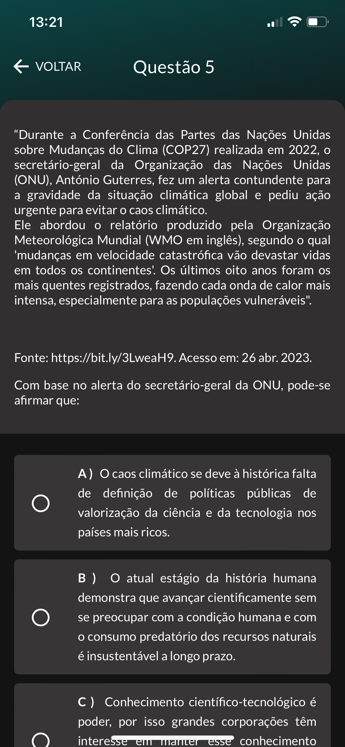 <p>13:21 VOLTAR Questão 5 "Durante a Conferência das Partes das Nações Unidas sobre Mudanças do Clima (COP27) realizada em 2022, secretário-geral da Organização das Nações Unidas (ONU), António Guterres, fez um alerta contundente para a gravidade da situação climática global e pediu ação urgente para evitar caos climático. Ele abordou relatório produzido pela Organização Meteorológica Mundial (WMO em inglês), segundo qual 'mudanças em velocidade catastrófica vão devastar vidas em todos os Os últimos oito anos foram os mais quentes registrados, fazendo cada onda de calor mais intensa, especialmente para as populações vulneráveis". Fonte: https://bit.ly/3LweaH9. Acesso em: 26 abr. 2023. Com base no alerta do secretário-geral da ONU, pode-se afirmar que: A) O caos climático se deve à histórica falta de definição de políticas públicas de valorização da ciência e da tecnologia nos países mais ricos. B ) O atual estágio da história humana demonstra que avançar cientificamente sem se preocupar com a condição humana e com consumo predatório dos recursos naturais é insustentável a longo prazo. C) Conhecimento é poder, por isso grandes corporações têm interesse em esse conhecimento</p>
