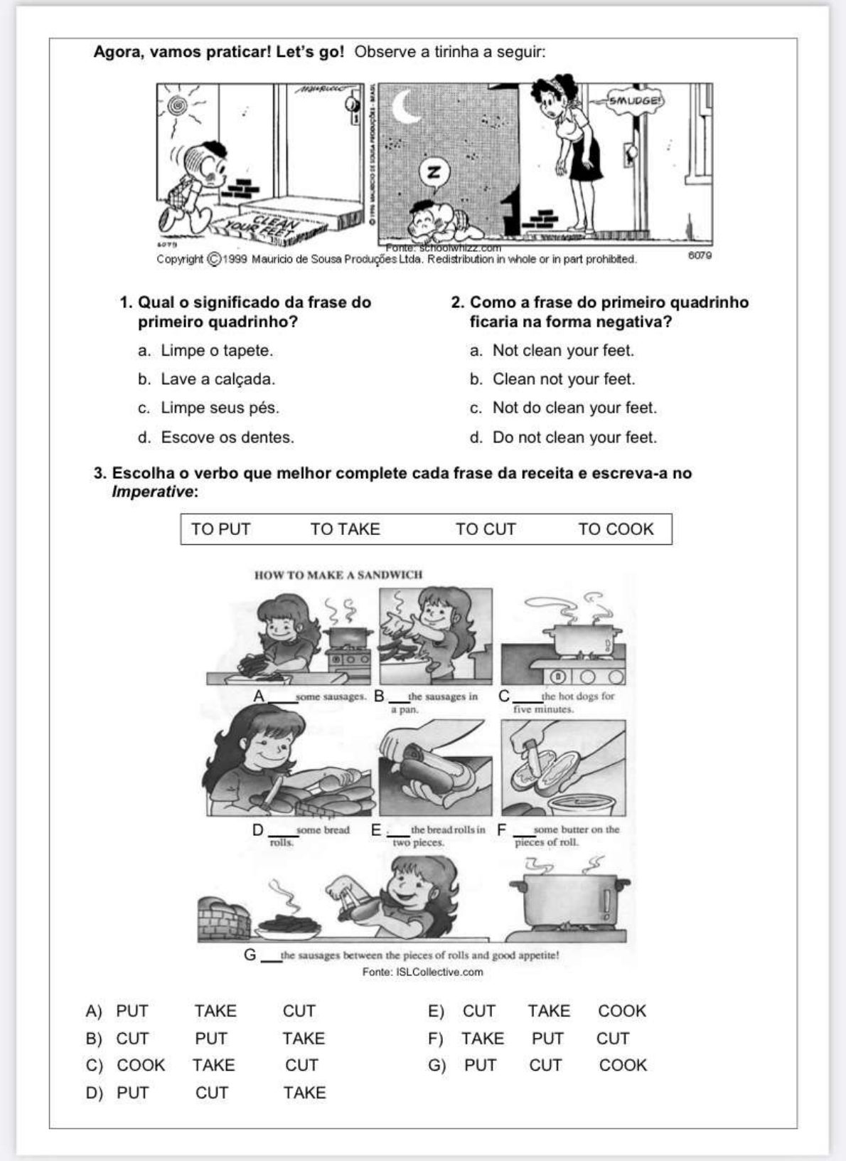 <p>Agora, vamos praticar! Let's go! Observe a tirinha a seguir: SMUDGE! Copyright 1999 Mauricio de Sousa Produções Redistribution in whole or in part 6079 1. Qual o significado da frase do 2. Como a frase do primeiro quadrinho primeiro quadrinho? ficaria na forma negativa? a. Limpe o tapete. a. Not clean your feet. b. Lave a b. Clean not your feet. Limpe seus pés. Not do clean your feet. d. Escove os dentes. d. Do not clean your feet. 3. Escolha o verbo que melhor complete cada frase da receita e escreva-a no Imperative: TO PUT TO TAKE TO CUT TO COOK HOW TO MAKE A SANDWICH A some B the sausages in C the hot dogs for a five D some bread E the bread rolls in some butter on the two pieces. pieces of G the sausages between the pieces of rolls and good appetite! Fonte: ISLCollective.com A) PUT TAKE CUT E) CUT TAKE COOK B) CUT PUT TAKE F) TAKE PUT CUT C) COOK TAKE CUT G) PUT CUT COOK D) PUT CUT TAKE</p>