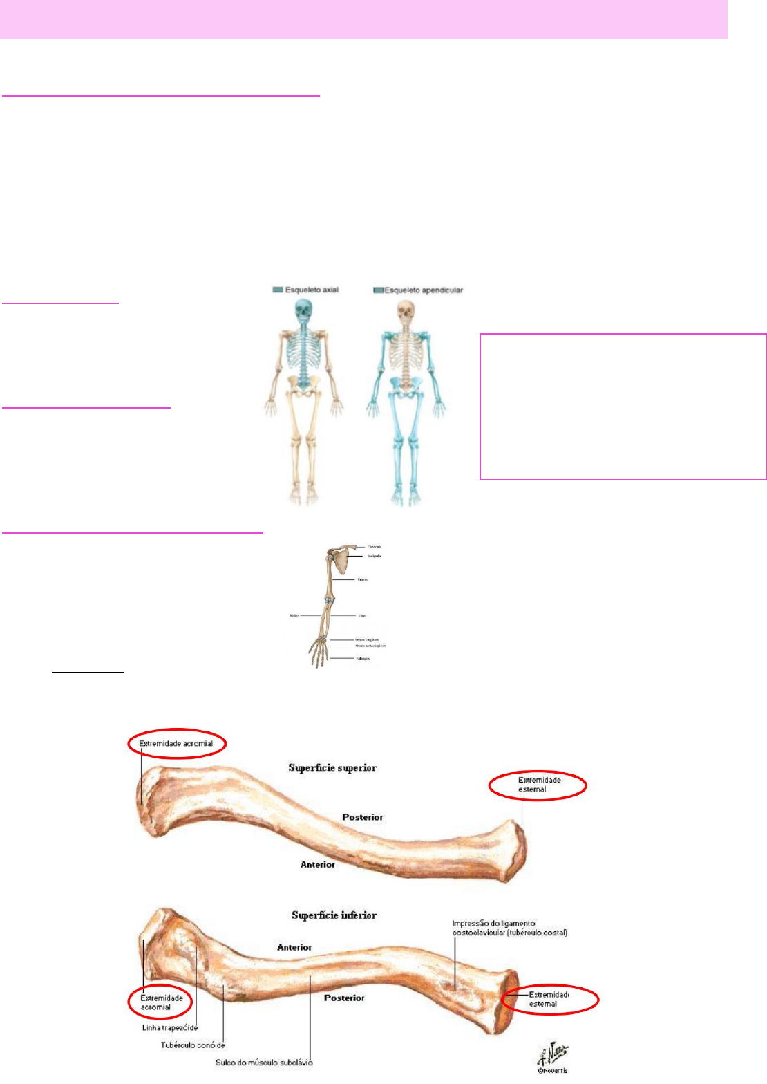 <p>Ps: ninguém é simétrico – exemplo:</p><p>caso de escoliose, ao invés da</p><p>carga se dividir igualmente nas</p><p>pernas, uma fica com mais carga</p><p>que a outra, causando,</p><p>futuramente, uma patologia</p><p>Topografia dos membros superiores</p><p>Relação dos MMSS (membros superiores):</p><p>→ A posição ereta do homem liberou-lhe o membro superior (MS) das tarefas de carga e</p><p>locomoção</p><p>→ Adquiriu ampla mobilidade, força para desempenho de variadas ações e uma brilhante</p><p>habilidade – toda habilidade tem que ser treinada. Na mão possuímos movimentos finos.</p><p>→ Os MMSS têm relação com a cervical, crânio, tórax, costelas, ilíacos e lombar (complexo</p><p>articular do ombro tem relação com todos os músculos dessas regiões)</p><p>→ Importante função na movimentação do ombro, braço, antebraço e mão</p><p>→ Complexas alavancas articulares (alavanca – músculos que movem uma articulação)</p><p>Esqueleto axial:</p><p>→ Crânio</p><p>→ Coluna vertebral</p><p>→ Tórax</p><p>Esqueleto apendicular:</p><p>→ Cintura escapular</p><p>→ Membros superiores</p><p>→ Cintura pélvica</p><p>→ Membros inferiores</p><p>Complexo articular do ombro e MS:</p><p>→ Ossos:</p><p> Escapula;</p><p> Úmero;</p><p> Clavícula;</p><p> Rádio;</p><p> Ulna;</p><p> Carpo;</p><p> Metacarpo;</p><p> Falanges.</p><p>→ Clavícula:</p><p> Extremidade acromial – se</p><p>articula com o acrômio</p><p> Extremidade esternal – se</p><p>articula com o esterno</p><p>Malu - T9 A</p><p>3 músculos que se inserem no processo coracoide:</p><p>→ Peitoral menor – abdutor de escapula</p><p>→ Córaco braquial – flexor de braço</p><p>→ Cabo curto do m. bíceps braquial – flexor de</p><p>antebraço</p><p>→ Escapula:</p><p> Ângulo superior</p><p> Ângulo inferior</p><p> Margem lateral</p><p> Margem medial</p><p> Acrômio</p><p> Espinha da escapula</p><p> Fossa supra-espinhal</p><p> Fossa infra-espinhal</p><p> Processo coracoide</p><p> Cavidade glenoide – onde a cabeça do úmero se articula</p><p> Fossa subscapular – musculo subscapular preenche ela</p><p>→ Úmero:</p><p> Cabeça</p><p> Tubérculo maior</p><p> Tubérculo menor</p><p> Sulco intertubercular – onde passa o tendão do cabo longo do m. bíceps braquial</p><p> Diáfise</p><p> Epicôndilo medial</p><p> Epicôndilo lateral</p><p> Capitulo</p><p> Tróclea</p><p>Malu - T9 A</p><p>→ Região do cotovelo:</p><p> Articulação úmero-ulnar – faz a</p><p>flexo-extenção de antebraço</p><p> Articulação radio-ulnar proximal</p><p>– faz pronação e supinação</p><p>→ Radio:</p><p> Cabeça do radio</p><p> Tuberosidade do radio</p><p> Processo estiloide</p><p>→ Ulna:</p><p> Olecrano</p><p> Incisura troclear</p><p> Tuberosidade da ulna</p><p> Cabeça da ulna</p><p> Processo estiloide da ulna</p><p>→ Mão:</p><p> Ossos do carpo:</p><p> Formados por 8 ossos</p><p>divididos em 2 fileiras de</p><p>4 ossos</p><p> Fileira distal – trapézio,</p><p>trapezoide, capitato e</p><p>amato</p><p> Fileira proximal –</p><p>escafoide, semilunar,</p><p>piramidal e pisiforme</p><p> Ossos do metacarpo</p><p> Falanges</p><p> Todas as articulações são</p><p>sinoviais</p><p>Malu - T9 A</p><p>Entre úmero e acrômio – espaço onde tem 3 estruturas (espaço subacromial) – cabo longo do bíceps</p><p>braquial, tendão do m. supraespinhal e a bolsa subacromial (muito comum burcite e tendinite)</p><p>Inserido na tuberosidade do úmero fica o deltoide – principal fixador de úmero em elevação</p><p>→ 4 articulações no complexo articular do ombro:</p><p> Articulação esternoclavicular –</p><p>movimento de rotação anterior e</p><p>posterior</p><p> Articulação acromioclavicular –</p><p>muito comum luxação</p><p> Articulação glenoumeral – entre</p><p>cavidade glenoide e úmero –</p><p>articulação do ombro</p><p>propriamente dita</p><p> Articulação escapulotorácica –</p><p>permite a boa amplitude de</p><p>membro superior</p><p>Cotovelo:</p><p>→ Articulação do tipo gínglimo ou em dobradiça</p><p>→ Possui 3 articulações:</p><p> Úmero ulnar – flexo-extenção</p><p> Úmero radial – flexo-extenção</p><p> Radio ulnar proximal – pronação e supinação</p><p>Punho:</p><p>→ Articulações:</p><p> Radio-ulnar distal</p><p> Radio-cárpica</p><p>Mão:</p><p>→ Articulações:</p><p> Articulação carpometacarpal</p><p> Articulação metacarpofalangeana</p><p> Articulação interfalangiana</p><p>Malu - T9 A</p><p>Cíngulo do membro superior:</p><p>→ Constituído pela escapula e clavícula</p><p>→ Escapula está apenas aplicada a parede torácica póstero-lateral da 2ª à 7ª costela</p><p>→ Se articula com o tronco apenas pela clavícula</p><p>→ Escapula alada – fraqueza de serrátil anterior (é um dos principais estabilizadores de</p><p>escapula)</p><p>→ Escapula é solta – ela é presa no gradil costal apenas pela articulação esternoclavicular, por</p><p>musculo, tendão, ligamento e fascia</p><p>Músculos que movem a escapula:</p><p>→ M. trapézio</p><p>→ M. levantador de escapula</p><p>→ M. romboide maior e menor – adutores</p><p>(retração)</p><p>→ M. serratil anterior – estabilizador de</p><p>escapula</p><p>→ M. peitoral menor – inserção no</p><p>processo coracoide – abdutor</p><p>(protração)</p><p>Músculos que movem o ombro:</p><p>→ M. peitoral maior – adutor horizontal</p><p>→ M. deltoide – 3 fibras:</p><p> Fibra anterior – flexão</p><p> Fibra media – abdução</p><p> Fibra posterior – extensão</p><p>→ M. supraespinhal – abdutor</p><p>→ M. infraespinhal – rotador lateral</p><p>→ M. redondo maior e menor – rotadores</p><p>→ M. subescapular – rotador medial</p><p>→ M. latíssimo do dorso – extensão, adução e rotação medial</p><p>→ M. coracobraquial – flexão</p><p>→ M. bíceps braquial – auxilia na flexão de ombro e flexiona de antebraço</p><p