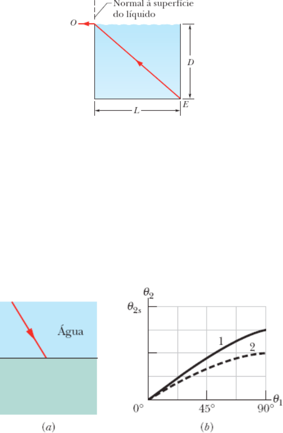 <p>Termodinâmica das Soluções e Equilíbrios</p><p>Segunda Lista de Exercícios</p><p>1. Calcule a velocidade, a frequência e o comprimento de onda da linha D do sódio (λ = 589 nm), quando</p><p>essa luz da fonte atravessa uma espécie cujo índice de refração 𝑛! é 1,43.</p><p>2. Quando a luz da linha D do sódio incide em uma interface ar/diamante a um ângulo de incidência de 30,0</p><p>graus, verifica-se que o ângulo de refração é 11,9 graus. Qual o valor do 𝑛! para o diamante?</p><p>3. Qual o comprimento de onda de um fóton que tem três vezes mais energia que a de um fóton cujo</p><p>comprimento de onda é 500 nm?</p><p>4. O iodeto de prata tem energia de ligação de aproximadamente 255 kJ/mol (AgI é um dos possíveis</p><p>componentes ativos das lentes dos óculos de sol). Qual é o comprimento de onda mais longo da luz que é</p><p>capaz de quebrar as ligações do iodeto de prata?</p><p>5. Calcule o comprimento de onda de :</p><p>(a) linha de sódio de 589 nm em uma solução aquosa que tem índice de refração de 1,35;</p><p>(b) da radiação de saída quando um laser de 694,3 nm atravessa um pedaço de quartzo que tem índice de</p><p>refração de 1,55.</p><p>6. Quando o tanque retangular de metal da Figura está cheio, até a borda, de um líquido desconhecido, um</p><p>observador O, com os olhos ao nível do alto do tanque, mal pode ver o vértice E. A figura mostra um raio</p><p>que se refrata na superfície do líquido e toma a direção do observador O. Se D = 85,0 cm e L = 1,10 m, qual</p><p>é o índice de refração do líquido?</p><p>7. Um raio de luz que estava se propagando no vácuo incide na superfície de uma placa de vidro. No vácuo, o</p><p>raio faz um ângulo de 32,0° com a normal à superfície, enquanto no vidro faz um ângulo de 21,0° com a</p><p>normal. Qual é o índice de refração do vidro?</p><p>8. Na Figura a, um raio luminoso que estava se propagando na água incide com um ângulo θ1 em outro meio,</p><p>no qual parte da luz se refrata. O outro meio pode ser do tipo 1 ou do tipo 2; a Figura b mostra o ângulo de</p><p>refração θ2 em função do ângulo de incidência θ1 para os dois tipos de meio. A escala do eixo vertical é</p><p>definida por θ2s = 90°. Sem fazer nenhum cálculo, determine (a) se o índice de refração do meio 1 é maior ou</p><p>menor que o índice de refração da água (n = 1,33) e (b) se o índice de refração do meio 2 é maior ou menor</p><p>que o índice de refração da água. Determine o índice de refração (c) do meio 1 e (d) do meio 2.</p><p>9. Na Figura, a luz incide, fazendo um ângulo θ1 = 40,1° com a normal, na interface de dois meios</p><p>transparentes. Parte da luz atravessa as outras três camadas transparentes e parte é refletida para cima e</p><p>escapa para o ar. Se n1 = 1,30, n2 = 1,40, n3 = 1,32 e n4 = 1,45, determine o valor (a) de θ5 e (b) de θ4.</p><p>10. Na Figura, um feixe de luz não polarizada, com uma intensidade de 43 W/m2, atravessa um sistema</p><p>composto por dois filtros polarizadores cujas direções fazem ângulos θ1 = 70° e θ2 = 90° com o eixo y. Qual</p><p>é a intensidade da luz transmitida pelo sistema?</p><p>11. (a) Na Figura, um feixe de luz inicialmente não polarizada atravessa três filtros polarizadores cujas</p><p>direções de polarização fazem ângulos de θ1 = θ2 = θ3 = 50° com a direção do eixo y. Que porcentagem da</p><p>intensidade inicial da luz é transmitida pelo conjunto? (Sugestão: Preste atenção nos ângulos.); (b) Na Figura,</p><p>um feixe de luz inicialmente não polarizada atravessa três filtros polarizadores, cujas direções de polarização</p><p>fazem ângulos de θ1 = 40°, θ2 = 20° e θ3 = 40° com a direção do eixo y. Que porcentagem da intensidade</p><p>inicial da luz é transmitida pelo conjunto? (Sugestão: Preste atenção nos ângulos.)</p><p>12. O valor de 𝛼!!" para a lactose é 55,4°. Qual é a concentração desta substância (em gramas por litro) em</p><p>uma solução que apresenta um desvio angular de 7,24°, quando se utiliza um polarímetro, cujo tubo</p><p>polarimétrico mede 10 cm, a 20°C e observando-se sob a raia D da luz de sódio?</p><p>Dados:</p><p>Constante de Avogadro: 6,022 x 1023 mol-1; h = 6,626 x 10-34 J.s; c = 2,998 x 108 m.s-1</p><p>Respostas:</p><p>1. v = 2,1 x 108 m/s; ν = 5,09 x 1014 Hz; λ = 411,9 nm.</p><p>2. 2,42.</p><p>3. 166,7 nm.</p><p>4. 470 nm.</p><p>5. (a) 436,3 nm; (b) 447,9 nm.</p><p>6. 1,25.</p><p>7. 1,48.</p><p>8. (a) maior; (b) maior; (c) 1,44; (d) 1,88.</p><p>9. (a) 56,90°; (b) 24,36°.</p><p>10. 4,43 W/m2.</p><p>11. (a) A intensidade final corresponde a 0,045% da intensidade inicial; (b) 3,1% da intensidade inicial da luz</p><p>é transmitida.</p><p>12. 130,7 g/L.</p><p>Bons estudos!</p>