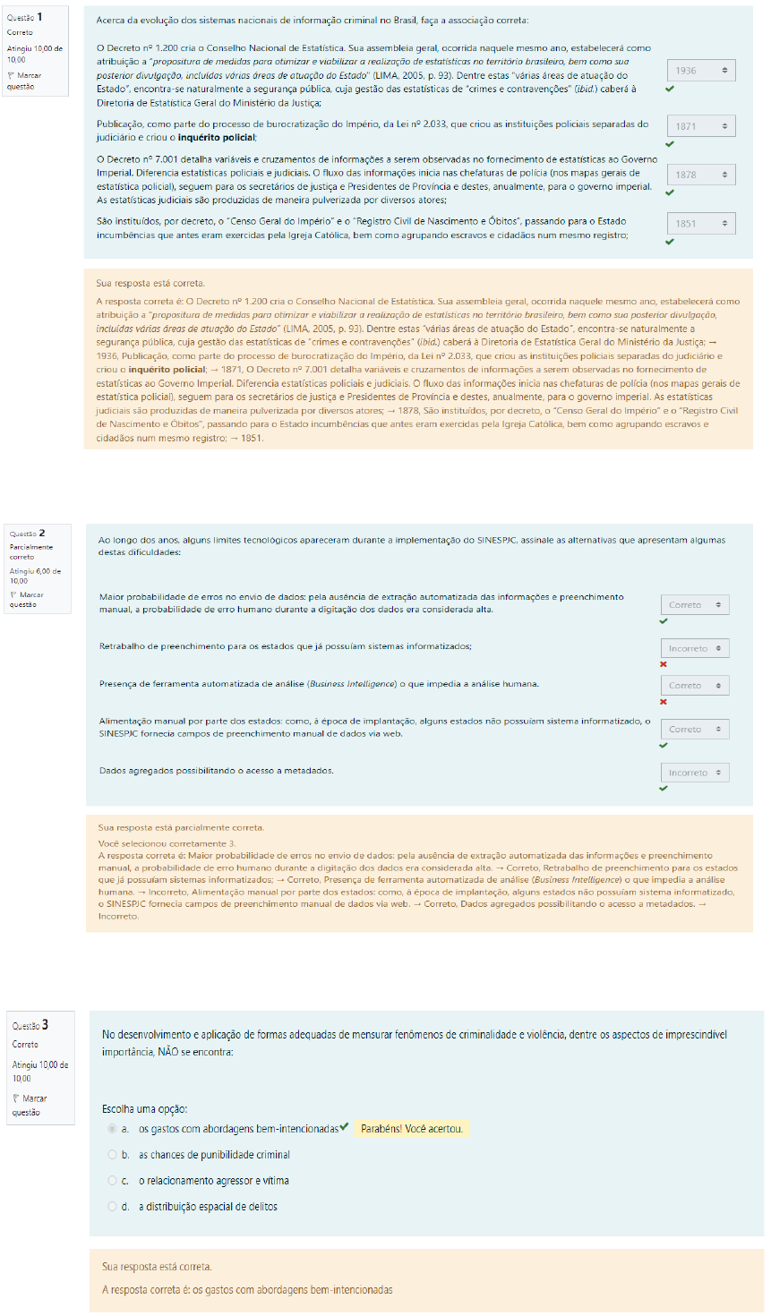 <p>Questão 1 Acerca da evolução dos sistemas nacionais de informação criminal no Brasil, faça a associação correta: Correto Atingiu 10.00 de Decreto cria o Conselho Nacional de Sua assembleia geral, ocorrida naquele mesmo ano, estabelecerá como 10.00 atribuição a "propositura de medidas para otimizar e viabilizar a realização de estatísticas no território bem como sua 1936 Marcar posterior divulgação, incluídas várias areas de atuação do Estado" (LIMA, p. 93). Dentre estas "várias áreas de atuação do questão Estado", encontra-se naturalmente a segurança pública, gestão das estatísticas de "crimes e (ibid.) caberá à Diretoria de Estatística Geral do Ministério da Justiça; Publicação, como parte do processo de burocratização do Império, da Lei 2.033, que criou as instituições policiais separadas do 1871 judiciário e criou o inquérito policial; Decreto 7.001 detalha variáveis e cruzamentos de informações a serem observadas no fornecimento de estatísticas ao Governo Diferencia estatísticas policiais e judiciais. fluxo das informações inicia nas chefaturas de polícia (nos mapas gerais de 1878 estatística policial), seguem para os secretários de justiça e Presidentes de Província e destes, anualmente, para o governo imperial. As estatísticas judiciais são produzidas de maneira pulverizada por diversos atores; São instituídos, por decreto, o "Censo Geral do e o "Registro Civil de Nascimento e passando para o Estado 1851 incumbências que antes eram exercidas pela Igreja Católica, bem como agrupando escravos e cidadãos num mesmo registro; Sua resposta está correta. A resposta correta é: Decreto 1.200 cria o Conselho Nacional de Sua assembleia geral, ocorrida naquele mesmo ano, estabelecerá como atribuição a "propositura de medidas para otimizar e viabilizar a realização de estatísticas no território brasileiro, bem como sua posterior divulgação, incluídas de atuação do Estado" (LIMA, 2005, p. 93). Dentre estas "várias áreas de atuação do Estado", encontra-se naturalmente a segurança pública, cuja gestão das estatísticas de "crimes e (ibid.) caberá à Diretoria de Estatística Geral do Ministério da Justiça; 1936. Publicação, como parte do processo de burocratização do da Lei 2.033, que criou as instituições policiais separadas do judiciário e criou o inquérito policial; 1871, o Decreto 7.001 detalha variáveis e cruzamentos de informações a serem observadas no fornecimento de estatísticas ao Governo Diferencia estatísticas policiais e judiciais. fluxo das informações inicia nas chefaturas de polícia (nos mapas gerais de estatística policial), seguem para os secretários de justiça e Presidentes de Província e destes, anualmente, para o governo imperial. As estatísticas judiciais são produzidas de maneira pulverizada por diversos atores; 1878, São instituídos, por decreto, "Censo Geral do e o "Registro Civil de Nascimento e passando para Estado incumbências que antes eram exercidas pela Igreja Católica, bem como agrupando escravos e cidadãos num mesmo registro; 1851. Questão 2 Ao longo dos anos, alguns limites tecnológicos apareceram durante a implementação do SINESPJC, assinale as alternativas que apresentam algumas Parcialmente destas correto Atingiu 6.00 de 10.00 Marcar Maior probabilidade de erros no envio de pela ausência de extração automatizada das informações e preenchimento questão Correto manual, a probabilidade de erro humano durante a digitação dos dados era considerada alta. Retrabalho de preenchimento para os estados que já sistemas Incorreto x Presença de ferramenta automatizada de (Business Intelligence) que impedia a análise humana. Correto x Alimentação manual por parte dos estados: como, à época de implantação, alguns estados não sistema informatizado, Correto SINESPJC fornecia campos de preenchimento manual de dados via web. Dados agregados possibilitando acesso a Incorreto Sua resposta está parcialmente correta. Você selecionou corretamente 3. A resposta correta é: Maior probabilidade de erros no envio de pela ausência de extração automatizada das informações e preenchimento manual a probabilidade de erro humano durante a digitação dos dados era considerada alta. Correto, Retrabalho de preenchimento para os estados que já sistemas informatizados; Correto, Presença de ferramenta automatizada de (Business Intelligence) que impedia a humana Incorreto, Alimentação manual por parte dos estados: como, à época de implantação, alguns estados não sistema fornecia campos de preenchimento manual de dados via web. Correto, Dados agregados possibilitando o acesso a metadados. Questão 3 No desenvolvimento e aplicação de formas adequadas de mensuran fenômenos de criminalidade e violência, dentre os aspectos de imprescindível Correto importância, NÃO se encontra: Atingiu 10.00 de 10.00 Marcar questão Escolha uma opção: a. os gastos com abordagens bem-intencionadas Você acertou. b. as chances de punibilidade criminal C. o relacionamento agressor e vítima d. a distribuição espacial de delitos Sua resposta está correta. A resposta correta é: os gastos com abordagens bem-intencionadas</p><p>Questão 4 Cláudio Beato relacionou fatores que dificultam a construção dos sistemas de informação criminal no Brasil. Assinale as alternativas indicadas pelo Parcialmente autor: correto Atingiu 8.00 de 10.00 A ausência de dados em âmbito internacional que sirvam como referenciais para as atividades nacionais. Incorreto Marcar questão Descolamento entre as atividades práticas das organizações e os sistemas de informações. Correto Falta de departamentos de estatística e coleta de dados, escassez de tecnologia adequada e de profissionais devidamente capacitados em algumas Secretarias de Segurança brasileiras. Correto Presença de profissionais qualificados e aptos para produção de conhecimento. Incorreto Sistema militarizado da