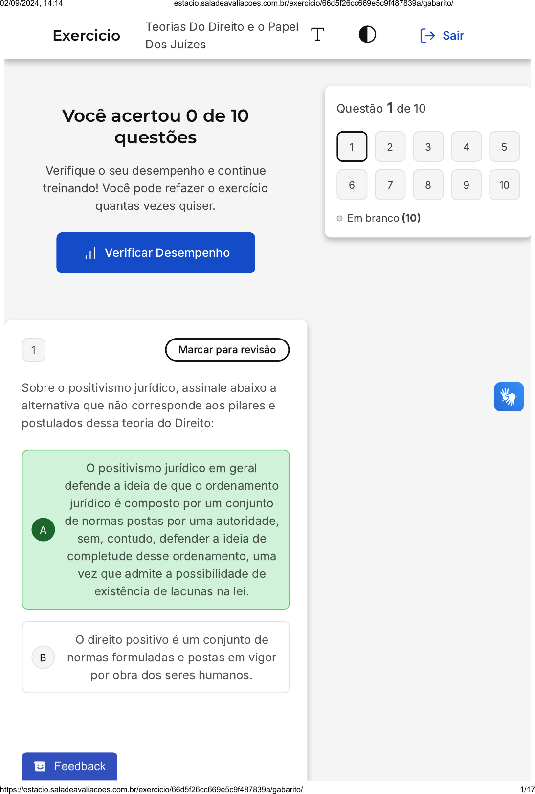 <p>Você acertou 0 de 10</p><p>questões</p><p>Verifique o seu desempenho e continue</p><p>treinando! Você pode refazer o exercício</p><p>quantas vezes quiser.</p><p>Verificar Desempenho</p><p>A</p><p>B</p><p>1 Marcar para revisão</p><p>Sobre o positivismo jurídico, assinale abaixo a</p><p>alternativa que não corresponde aos pilares e</p><p>postulados dessa teoria do Direito:</p><p>O positivismo jurídico em geral</p><p>defende a ideia de que o ordenamento</p><p>jurídico é composto por um conjunto</p><p>de normas postas por uma autoridade,</p><p>sem, contudo, defender a ideia de</p><p>completude desse ordenamento, uma</p><p>vez que admite a possibilidade de</p><p>existência de lacunas na lei.</p><p>O direito positivo é um conjunto de</p><p>normas formuladas e postas em vigor</p><p>por obra dos seres humanos.</p><p>Questão 1 de 10</p><p>Em branco �10�</p><p>1 2 3 4 5</p><p>6 7 8 9 10</p><p>Feedback</p><p>Exercicio</p><p>Teorias Do Direito e o Papel</p><p>Dos Juízes</p><p>Sair</p><p>02/09/2024, 14:14 estacio.saladeavaliacoes.com.br/exercicio/66d5f26cc669e5c9f487839a/gabarito/</p><p>https://estacio.saladeavaliacoes.com.br/exercicio/66d5f26cc669e5c9f487839a/gabarito/ 1/17</p><p>C</p><p>D</p><p>E</p><p>O positivismo jurídico é uma ciência</p><p>ou teorização que consiste</p><p>fundamentalmente na identificação do</p><p>Direito com o direito positivo.</p><p>O positivismo jurídico em sentido</p><p>amplo é aquele afirma uma absoluta</p><p>exclusão do direito natural da</p><p>definição do direito posto vigente.</p><p>O positivismo jurídico em sentido</p><p>estrito consiste em uma contraposição</p><p>ao moralismo jurídico, pois considera</p><p>que o estudo e a compreensão do</p><p>Direito não abrangem a sua avaliação</p><p>moral e não dependem da sua</p><p>conformidade a critérios de justiça e</p><p>retidão.</p><p>Questão não respondida</p><p>Opa! A alternativa correta é a letra</p><p>A. Confira o gabarito comentado!</p><p>Gabarito Comentado</p><p>A resposta correta é: O positivismo jurídico</p><p>em geral defende a ideia de que o</p><p>ordenamento jurídico é composto por um</p><p>conjunto de normas postas por uma</p><p>autoridade, sem, contudo, defender a ideia</p><p>de completude desse ordenamento, uma</p><p>vez que admite a possibilidade de</p><p>existência de lacunas na lei.</p><p>2 Marcar para revisão</p><p>02/09/2024, 14:14 estacio.saladeavaliacoes.com.br/exercicio/66d5f26cc669e5c9f487839a/gabarito/</p><p>https://estacio.saladeavaliacoes.com.br/exercicio/66d5f26cc669e5c9f487839a/gabarito/ 2/17</p><p>A</p><p>B</p><p>C</p><p>D</p><p>E</p><p>Assinale a alternativa INCORRETA sobre o pós-</p><p>positivismo e/ou autores pós-positivistas:</p><p>Para Robert Alexy, a razão</p><p>institucionalizada seria o Direito, de</p><p>modo que uma criação perfeita seria o</p><p>Direito correto.</p><p>Um dos objetivos de Dworkin, com a</p><p>sua teoria do Direito como integridade,</p><p>é garantir uma coerência de</p><p>princípios.</p><p>Para Miguel Reale, a estrutura do</p><p>Direito é tridimensional, uma vez que o</p><p>ordenamento jurídico deve estar</p><p>assentado necessariamente em três</p><p>elementos: fato, valor e norma.</p><p>Na concepção de Robert Alexy, o</p><p>Direito deve ser visto como um</p><p>fenômeno discursivo, em que a</p><p>argumentação jurídica e a ponderação</p><p>de princípios são de absoluta</p><p>importância para a aplicação do</p><p>Direito.</p><p>A interpretação e a argumentação</p><p>jurídica, embora importantes nos dias</p><p>atuais na atuação dos profissionais do</p><p>Direito, são noções não essenciais</p><p>para as doutrinas pós-positivistas.</p><p>Questão não respondida</p><p>Opa! A alternativa correta é a letra</p><p>E. Confira o gabarito comentado!</p><p>02/09/2024, 14:14 estacio.saladeavaliacoes.com.br/exercicio/66d5f26cc669e5c9f487839a/gabarito/</p><p>https://estacio.saladeavaliacoes.com.br/exercicio/66d5f26cc669e5c9f487839a/gabarito/ 3/17</p><p>A</p><p>B</p><p>C</p><p>Gabarito Comentado</p><p>A alternativa E está incorreta. A</p><p>interpretação e a argumentação jurídica</p><p>são, de fato, essenciais para as doutrinas</p><p>pós-positivistas. O pós-positivismo, como</p><p>uma corrente do pensamento jurídico,</p><p>valoriza a interpretação e a argumentação</p><p>jurídica como ferramentas fundamentais</p><p>para a aplicação do Direito. Portanto, ao</p><p>contrário do que a alternativa E sugere,</p><p>essas noções são de extrema importância</p><p>e essenciais para as doutrinas pós-</p><p>positivistas.</p><p>3 Marcar para revisão</p><p>No âmbito do imperativismo jurídico de John</p><p>Austin é INCORRETO afirmar que:</p><p>A concepção de uma norma jurídica</p><p>tem uma estrutura de comando que</p><p>procede do soberano, que é quem tem</p><p>o poder de criar as leis.</p><p>A lei é definida como um comando</p><p>geral e abstrato do qual emana a</p><p>expressão de um desejo que deve ser</p><p>cumprido sob pena de sanção.</p><p>O que diferencia o comando dos</p><p>outros tipos de desejos é o poder ou</p><p>capacidade de o emissor punir o</p><p>destinatário do comando no caso de</p><p>violação daquilo que foi expresso</p><p>como desejo.</p><p>02/09/2024, 14:14 estacio.saladeavaliacoes.com.br/exercicio/66d5f26cc669e5c9f487839a/gabarito/</p><p>https://estacio.saladeavaliacoes.com.br/exercicio/66d5f26cc669e5c9f487839a/gabarito/ 4/17</p><p>D</p><p>E</p><p>O dever de cumprimento do comando</p><p>se expressa na conduta do seu</p><p>destinatário, que age conforme aquilo</p><p>que é desejado pelo seu emissor.</p><p>É necessário que a sanção seja, de</p><p>fato, aplicada para que esteja</p><p>caracterizado o comando, não</p><p>bastando a simples possibilidade</p><p>dessa imposição.</p><p>Questão não respondida</p><p>Opa! A alternativa correta é a letra</p><p>E. Confira o gabarito comentado!</p><p>Gabarito Comentado</p><p>A resposta correta é: É necessári