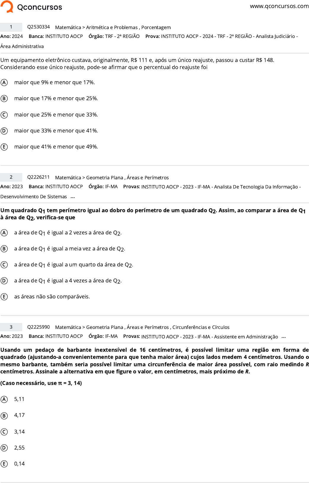 <p>www.qconcursos.com</p><p>Ano: 2024 Banca: INSTITUTO AOCP Órgão: TRF - 2ª REGIÃO</p><p>Um equipamento eletrônico custava, originalmente, R$ 111 e, após um único reajuste, passou a custar R$ 148.</p><p>Considerando esse único reajuste, pode-se a�rmar que o percentual do reajuste foi</p><p>A maior que 9% e menor que 17%.</p><p>B maior que 17% e menor que 25%.</p><p>C maior que 25% e menor que 33%.</p><p>D maior que 33% e menor que 41%.</p><p>E maior que 41% e menor que 49%.</p><p>Ano: 2023 Banca: INSTITUTO AOCP Órgão: IF-MA</p><p>Um quadrado Q tem perímetro igual ao dobro do perímetro de um quadrado Q . Assim, ao comparar a área de Q</p><p>à área de Q , veri�ca-se que</p><p>A a área de Q é igual a 2 vezes a área de Q .</p><p>B a área de Q é igual a meia vez a área de Q .</p><p>C a área de Q é igual a um quarto da área de Q .</p><p>D a área de Q é igual a 4 vezes a área de Q .</p><p>E as áreas não são comparáveis.</p><p>Ano: 2023 Banca: INSTITUTO AOCP Órgão: IF-MA</p><p>Usando um pedaço de barbante inextensível de 16 centímetros, é possível limitar uma região em forma de</p><p>quadrado (ajustando-a convenientemente para que tenha maior área) cujos lados medem 4 centímetros. Usando o</p><p>mesmo barbante, também seria possível limitar uma circunferência de maior área possível, com raio medindo R</p><p>centímetros. Assinale a alternativa em que �gure o valor, em centímetros, mais próximo de R.</p><p>(Caso necessário, use π = 3, 14)</p><p>A 5,11</p><p>B 4,17</p><p>C 3,14</p><p>D 2,55</p><p>E 0,14</p><p>1 Q2530334 >Matemática Aritmética e Problemas , Porcentagem</p><p>Prova: INSTITUTO AOCP - 2024 - TRF - 2ª REGIÃO - Analista Judiciário -</p><p>Área Administrativa</p><p>2 Q2226211 >Matemática Geometria Plana , Áreas e Perímetros</p><p>Provas: INSTITUTO AOCP - 2023 - IF-MA - Analista De Tecnologia Da Informação -</p><p>Desenvolvimento De Sistemas ...</p><p>1 2 1</p><p>2</p><p>1 2</p><p>1 2</p><p>1 2</p><p>1 2</p><p>3 Q2225990 >Matemática Geometria Plana , Áreas e Perímetros , Circunferências e Círculos</p><p>Provas: INSTITUTO AOCP - 2023 - IF-MA - Assistente em Administração ...</p><p>https://www.qconcursos.com/</p><p>https://www.qconcursos.com/questoes-de-concursos/bancas/instituto-aocp</p><p>https://www.qconcursos.com/questoes-de-concursos/institutos/trf-2-regiao</p><p>https://www.qconcursos.com/questoes-de-concursos/bancas/instituto-aocp</p><p>https://www.qconcursos.com/questoes-de-concursos/institutos/if-ma</p><p>https://www.qconcursos.com/questoes-de-concursos/bancas/instituto-aocp</p><p>https://www.qconcursos.com/questoes-de-concursos/institutos/if-ma</p><p>https://www.qconcursos.com/questoes-de-concursos/questoes/8617094a-3e</p><p>https://www.qconcursos.com/questoes-de-concursos/disciplinas/matematica-matematica</p><p>https://www.qconcursos.com/questoes-de-concursos/disciplinas/matematica-matematica/aritmetica-e-problemas</p><p>https://www.qconcursos.com/questoes-de-concursos/disciplinas/matematica-matematica/porcentagem</p><p>https://www.qconcursos.com/questoes-de-concursos/provas/instituto-aocp-2024-trf-2-regiao-analista-judiciario-area-administrativa</p><p>https://www.qconcursos.com/questoes-de-concursos/provas/instituto-aocp-2024-trf-2-regiao-analista-judiciario-area-administrativa</p><p>https://www.qconcursos.com/questoes-de-concursos/questoes/31a14411-2d</p><p>https://www.qconcursos.com/questoes-de-concursos/disciplinas/matematica-matematica</p><p>https://www.qconcursos.com/questoes-de-concursos/disciplinas/matematica-matematica/geometria-plana</p><p>https://www.qconcursos.com/questoes-de-concursos/disciplinas/matematica-matematica/areas-e-perimetros</p><p>https://www.qconcursos.com/questoes-de-concursos/provas/instituto-aocp-2023-if-ma-analista-de-tecnologia-da-informacao-desenvolvimento-de-sistemas</p><p>https://www.qconcursos.com/questoes-de-concursos/provas/instituto-aocp-2023-if-ma-analista-de-tecnologia-da-informacao-desenvolvimento-de-sistemas</p><p>https://www.qconcursos.com/questoes-de-concursos/questoes/12678f00-2d</p><p>https://www.qconcursos.com/questoes-de-concursos/disciplinas/matematica-matematica</p><p>https://www.qconcursos.com/questoes-de-concursos/disciplinas/matematica-matematica/geometria-plana</p><p>https://www.qconcursos.com/questoes-de-concursos/disciplinas/matematica-matematica/areas-e-perimetros</p><p>https://www.qconcursos.com/questoes-de-concursos/disciplinas/matematica-matematica/circunferencias-e-circulos</p><p>https://www.qconcursos.com/questoes-de-concursos/provas/instituto-aocp-2023-if-ma-assistente-em-administracao</p><p>Ano: 2023 Banca: INSTITUTO AOCP Órgão: IF-MA</p><p>Não é raro que surjam memes na internet em que problemas aritméticos teriam respostas diferentes, dependendo</p><p>da ordem em que as operações fossem realizadas. Entretanto deve-se observar que as operações matemáticas</p><p>obedecem a uma ordem especí�ca. Nesse contexto, ao resolver a expressão: 1/2 + 1/2 x 1/2 Será encontrado</p><p>A 1/2.</p><p>B 1.</p><p>C 2/6.</p><p>D 2/8.</p><p>E 3/4.</p><p>Ano: 2023 Banca: INSTITUTO AOCP Órgão: IF-MA</p><p>Considere os conjuntos S, T, Q e D, de tal maneira que o conjunto S seja composto pelas letras das palavras</p><p>SEGUNDA, SEXTA e SABADO, o conjunto T seja composto pelas letras da palavra TERCA, o conjunto Q pelas letras das</p><p>palavras QUARTA e QUINTA, e o conjunto D seja composto pelas letras da palavra DOMINGO. Sobre tais conjuntos, é</p><p>correto a�rmar que</p><p>A a união de S com T resulta no próprio S.</p><p>B os conjuntos T e Q têm exatamente três elementos em comum.</p><p>C um elemento aparece simultaneamente nos quatro conjuntos citados.</p><p>D a união dos conjuntos citados conta com todas as letras do alfabeto, exceto K, Y, W e Z.</p><p>E a intersecção entre T e D é o conjunto unitário.</p><p>Ano: 2023 Banca: INSTITUTO AOCP Órgão: POLÍCIA CIENTÍFICA-PR</p><p>Visando ao esclarecimento e às prova das infrações pena