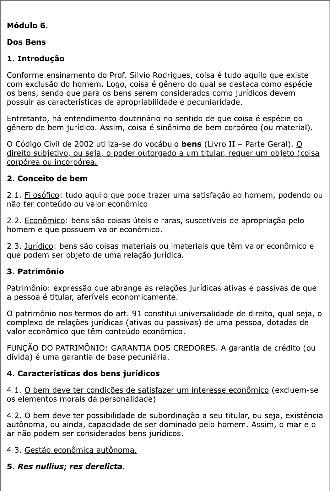 <p>Módulo 6. Dos Bens 1. Introdução Conforme ensinamento do Prof. Silvio Rodrigues, coisa é tudo aquilo que existe com exclusão do homem. Logo, coisa é gênero do qual se destaca como espécie os bens, sendo que para os bens serem considerados como jurídicos devem possuir as características de apropriabilidade e pecuniaridade. Entretanto, há entendimento doutrinário no sentido de que coisa é espécie do gênero de bem jurídico. Assim, coisa é sinônimo de bem (ou material). Código Civil de 2002 utiliza-se do vocábulo bens (Livro II Parte Geral). direito subjetivo, ou seja, o poder outorgado a um titular, requer um objeto (coisa corpórea ou incorpórea. 2. Conceito de bem 2.1. Filosófico: tudo aquilo que pode trazer uma satisfação ao homem, podendo ou não ter conteúdo ou valor econômico. 2.2. Econômico: bens são coisas úteis e raras, suscetíveis de apropriação pelo homem e que possuem valor econômico. 2.3. Jurídico: bens são coisas materiais ou imateriais que têm valor econômico e que podem ser objeto de uma relação jurídica. 3. Patrimônio Patrimônio: expressão que abrange as relações jurídicas ativas e passivas de que a pessoa é titular, aferíveis economicamente. patrimônio nos termos do art. 91 constitui universalidade de direito, qual seja, o complexo de relações jurídicas (ativas ou passivas) de uma pessoa, dotadas de valor econômico que têm conteúdo econômico. FUNÇÃO DO PATRIMÔNIO: GARANTIA DOS CREDORES. A garantia de crédito (ou dívida) é uma garantia de base pecuniária. 4. Características dos bens jurídicos 4.1. bem deve ter condições de satisfazer um interesse econômico (excluem-se os elementos morais da personalidade) 4.2. O bem deve ter possibilidade de subordinação a seu titular, ou seja, existência autônoma, ou ainda, capacidade de ser dominado pelo homem. Assim, o mar e o não podem ser considerados bens jurídicos. 4.3. Gestão econômica autônoma. 5. Res nullius; res derelicta.</p><p>Res nullius é coisa de ninguém, sem dono, que não foi objeto de apropriação pelo homem, ou seja, não foi objeto de relação jurídica anterior (ex. caça, pesca). Res derelicta é coisa abandonada por alguém, ou seja, já teve um titular que renunciou a sua propriedade e desta forma foi objeto de relação jurídica anterior (rádio velho no lixo). 6. o que pode ser objeto de uma relação jurídica? Direitos reais, direitos pessoais (também denominados obrigacionais), direitos de personalidade e diretos de família. Os direitos de personalidade e de família são considerados extrapatrimoniais. Os direitos reais e pessoais (obrigacionais) são direitos patrimoniais. Na relação jurídica obrigacional (ou pessoal) o objeto imediato consiste numa prestação de dar, fazer ou não fazer a cargo do devedor (sujeito passivo) no interesse do credor (sujeito ativo). objeto da prestação, por sua vez, é o objeto mediato, qual seja um bem jurídico qualquer. Logo, os efeitos de tal relação jurídica são relativos entre as partes e seus herdeiros, desde que não personalíssima. Na relação jurídica real, o titular do bem corpóreo ou incorpóreo (sujeito ativo) exerce os atributos da propriedade (uso, gozo e disposição) e o sujeito passivo é universal. Logo, os efeitos de tal relação jurídica são absolutos (erga omnes). 7. Classificação dos bens A classificação visa compreender uma instituição jurídica, agrupando as várias espécies de um gênero, para aproximar as que apresentem um elemento comum, afastando as que não o apresentem. A inclusão de um bem em determinada categoria implica a aplicação de regras próprias e específicas, considerando que não se podem aplicar as mesmas regras a todos os bens. Código Civil classifica os bens conforme os seguintes critérios: A) considerados em si mesmos B) reciprocamente considerados em relação ao titular do domínio 8. Bens corpóreos e incorpóreos Essa divisão clássica que advém do Direito Romano não consta do Código Civil, embora seja aceita pela maioria da doutrina. Bens corpóreos (ou materiais) são os que têm existência física material e que podem ser tangidos pelo homem. Bens incorpóreos (ou imateriais) são aqueles que têm existência abstrata, não podendo ser percebidos pelos sentidos do homem, mas que possuem valor econômico (ex.: direitos do autor). Os bens corpóreos são objetos de contratos. Os incorpóreos são objetos de cessão. Tanto uns quanto os outros integram o patrimônio da pessoa.</p><p>Outros bens, além das coisas corpóreas e incorpóreas, podem ser objeto de direito. Ex.: atos ou comportamentos humanos que são os objetos imediatos das obrigações de dar, fazer e não fazer. Direitos podem ser objeto de outros direitos. Ex.: usufruto de crédito; cessão de crédito. Exercício 1: Analise as afirmações abaixo e assinale a alternativa correta: O patrimônio é uma universalidade PORQUE O patrimônio envolve relações jurídicas ativas e passivas, créditos e dívidas de seu titular, podendo inclusive ser negativo. A) As duas proposições são corretas e a segunda justifica a primeira. B) As duas proposições são corretas, mas a segunda não justifica a primeira. C) Apenas a primeira proposição é correta. D) Apenas a segunda proposição é correta. E) As duas proposições são falsas. Exercício 2: Examine as proposições seguintes e assinale a alternativa correta: I. Res nullius é coisa de ninguém, sem dono, que não foi objeto de apropriação pelo homem, ou seja, não foi objeto de relação jurídica anterior (ex. caça, pesca).</p><p>II. Res derelicta é coisa abandonada por alguém, ou seja, já teve um titular que renunciou a sua propriedade e desta forma foi objeto de relação jurídica anterior (ex.: objeto no lixo). III. A classificação dos bens não é importante para definir o seu regime jurídico, por exemplo quanto a tributos e forma de alienação. A) Somente I é correta. B) Som