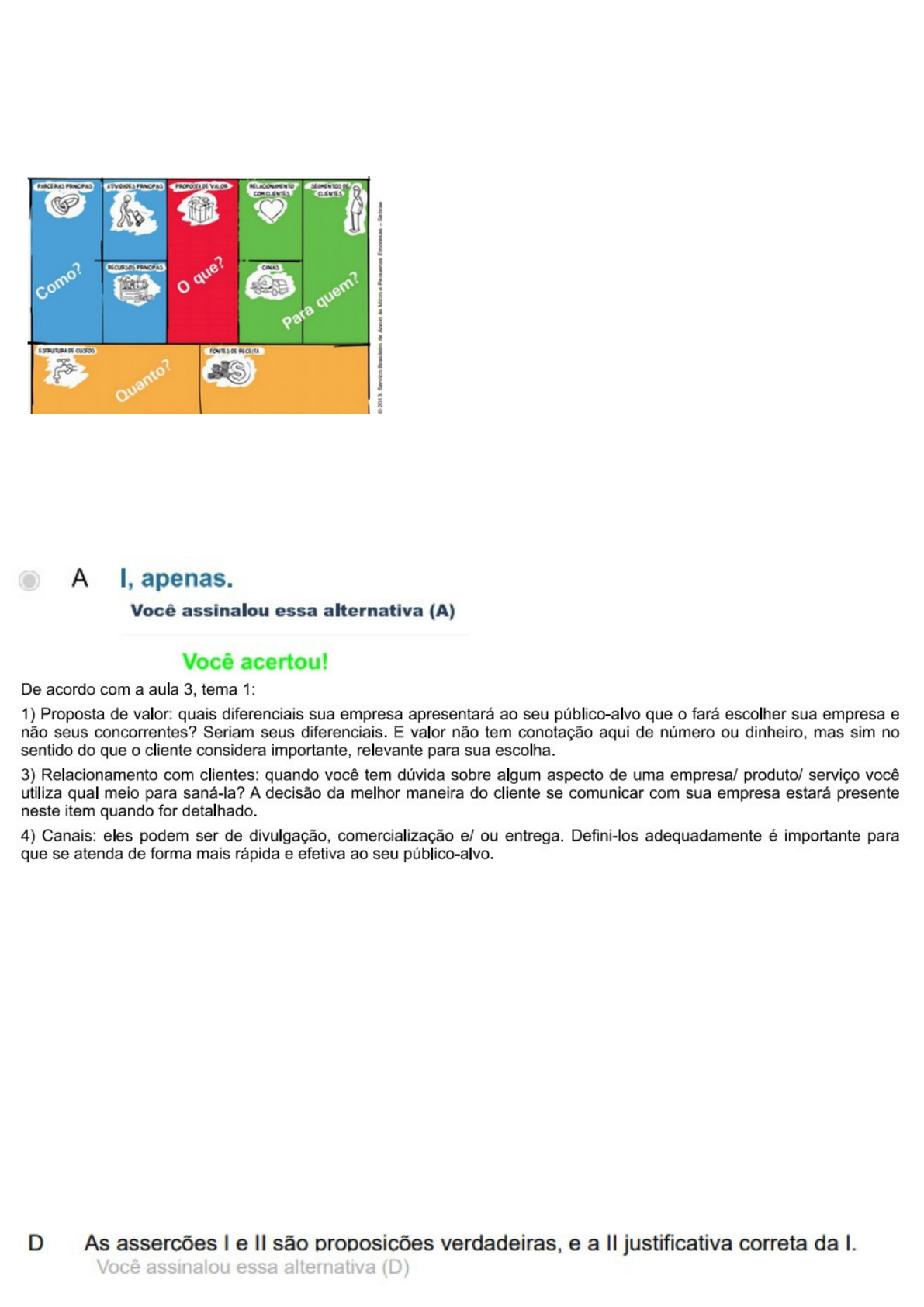 Perguntas e Respostas Questão 1/10 - Comportamento Empreendedor Analise a imagem do BMG, a seguir: COMPORTAMENTO EMPREENDEDOR Sobre os elementos do BMG é correto afirmar que: I – A proposta de valor apresenta os diferenciais da empresa. II – O relacionamento com os clientes apresenta os canais de divulgação, comercialização e/ ou entrega. III – Os canais apresentam as formas como os clientes podem se comunicar com a empresa. É correto o que se afirma em: Questão 2/10 - Comportamento Empreendedor Para conseguir crescer e se destacar no mercado, o empresário deve estar a par da situação da economia, conhecendo a legislação contábil, trabalhista e empresarial. O conhecimento ajuda o empresário na tomada de decisões, trazendo a elas mais segurança e independência. Considerando o texto apresentado e os conteúdos na aula 2, analise as asserções a seguir e a relação proposta entre elas: I – O empreendedor deve estar atento ao que está mudando (ou mudou) na legislação e demanda novos produtos ou serviços PORQUE II - Estar atento à legislação pode fazer com que se antecipe ou aja rapidamente para responder a uma nova necessidade A respeito dessas asserções, assinale a opção correta: Questão 3/10 - Comportamento Empreendedor A proposta de valor baseada em redução de custo oferece ao cliente possibilidades de economizar em suas compras e gastos. Criar modos inovadores de gerar valor para o cliente, obtendo receita indireta em virtude disso. Com base na definição acima, assinale a alternativa que apresenta um exemplo de proposta de valor do tipo “Redução de Custo”. Questão 4/10 - Comportamento Empreendedor “Na atual era da hipercompetição, a necessidade de novos produtos e o espírito empreendedor tornaram-se tão grandes que cada vez mais as empresas estão desenvolvendo um ambiente intraempreendedor, frequentemente na forma de unidades estratégicas de negócios” (Hirich; Peters; Shepherd, 2009, p. 38) Sobre as características de empresas que valorizam o intraempreendedorismo, avalie as afirmações: I - Têm em seus gestores figuras que incentivam a busca pelo novo. II – Possuem política de gestão de pessoas atual e moderna, estruturada para valorizar o colaborar e lhe dar condições gerais para que ofereça o melhor de si. III – Possuem remuneração e benefícios, no mínimo, dentro da média de mercado, para que talentos sejam atraídos e retidos. É correto o que se afirma em: Você acertou! A resposta correta é “as asserções I e II são proposições verdadeiras, e a II justificativa correta da I”. De acordo com a aula 2, tema 1: Legislação: o que está mudando (ou mudou) e demanda novos produtos ou serviços? Estar atento à legislação pode fazer com que o empreendedor se antecipe ou aja rapidamente para responder a uma nova necessidade. Questão 5/10 - Comportamento Empreendedor Maria após ser demitida utilizou o valor de sua rescisão para abrir uma empresa. Apesar de não ter realizado pesquisas de mercado e não ter experiência na condução de um negócio, Maria estava decidida a garantir sua sobrevivência e de sua família. Qual tipo de empreendedora Maria pode ser considerada? Questão 6/10 - Comportamento Empreendedor A proposta de valor baseada em personalização tem por objetivo oferecer ao cliente a opção de tornar único seu produto ou serviço. Além disso, disputa nichos de mercado agregando valor a produtos ou serviços tradicionais, dando a eles a possibilidade de se tornarem diferenciados, atendendo o gosto do cliente. Com base na definição acima, assinale a alternativa que apresenta um exemplo de proposta de valor do tipo “Personalização”. Questão 7/10 - Comportamento Empreendedor O intraempreendedor faz referência ao empregado que tem uma visão e atuação diferenciada. É aquele que se destaca dos demais por sua iniciativa e disposição para pensar, planejar e executar novos projetos. Sobre as características de empresas que valorizam o intraempreendedorismo, avalie as afirmações: I – Usam das técnicas e visões mais modernas de gestão para atrair e reter talentos II – Possuem um programa de recompensas formalizado e divulgado para que os colaboradores saibam o que podem ter em troca de seu comprometimento e ideias; III – Apresentam muita burocracia na análise de projetos inovadores. A análise preliminar é focada em limitar a criatividade, para a incentivar somente após a aprovação de direção. É correto o que se afirma em: Questão 8/10 - Comportamento Empreendedor A proposta de valor baseada em desempenho oferece ao mercado algo que irá provocar nos clientes a sensação de que o que possuem é muito limitado. Disputa mercados concorridos gerando espaço mediante oferta de produtos melhores, mais rápidos e/ ou mais versáteis.. Com base na definição acima, assinale a alternativa que apresenta um exemplo de proposta de valor do tipo “Desempenho”. Questão 9/10 - Comportamento Empreendedor A respeito do conceito e do contexto de empreendedorismo, avalie as definições a seguir: I – Empreendedorismo é a área de conhecimento dedicada a estudar os processos de idealização de empreendimentos, destacando tanto o valor de uma ideia como a sua capacidade de agregar valor ao que já existe (produto e processo). II – Empreendedor é somente um fundador de novas empresas, o construtor de novos negócios ou o consolidador e impulsionador de negócios atuais. III - Empreendedor é toda pessoa que possui um projeto, dedica tempo e energia, podendo gastar dinheiro para tornar seu projeto uma realidade. É correto o que se afirma em: Você acertou! De acordo com a aula 1, tema 2: Para Biagio (2012, p. 13), “empreendedorismo é a área de conhecimento dedicada a estudar os processos de idealização de empreendimentos, destacando tanto o valor de uma ideia como a sua capacidade de agregar valor ao que já existe (produto e processo)”. Já empreendedor 