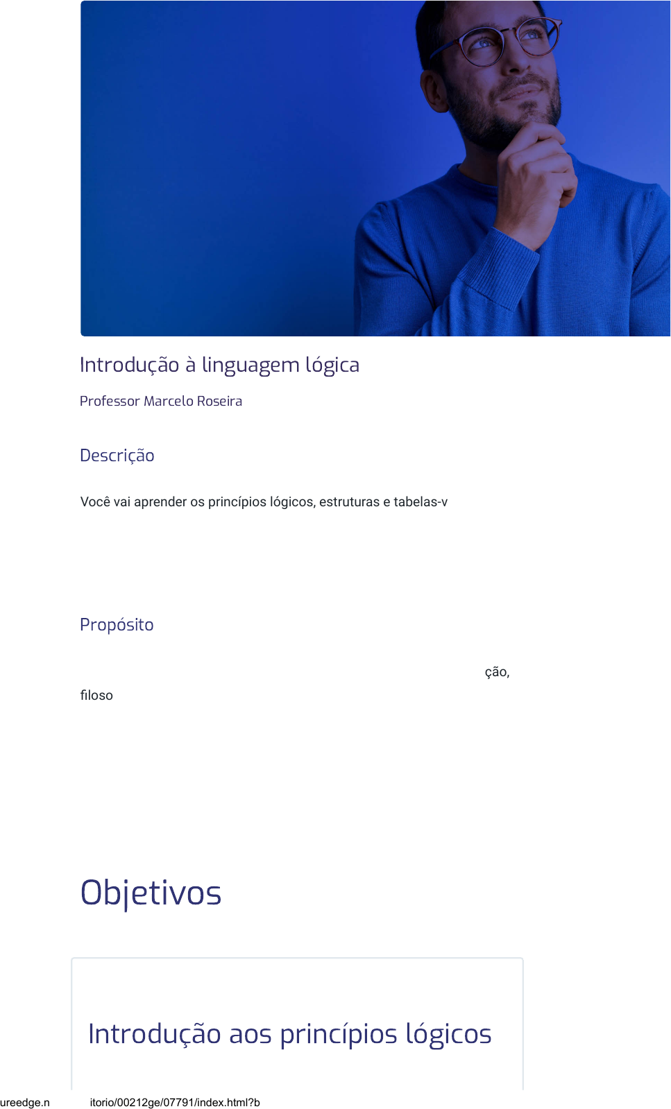 <p>Introdução à linguagem lógica</p><p>Professor Marcelo Roseira</p><p>Descrição</p><p>Você vai aprender os princípios lógicos, estruturas e tabelas-verdade,</p><p>equivalência lógica, leis do pensamento aristotélico e relações entre</p><p>proposições. Também verá exemplos de operações de conjuntos e a</p><p>conexão entre lógica e as operações básicas.</p><p>Propósito</p><p>A lógica tem aplicação direta em campos como ciência da computação,</p><p>filosofia, matemática, direito e ciências sociais, capacitando os alunos a</p><p>tomar decisões fundamentadas e identificar falácias. Ter uma</p><p>compreensão sólida dos princípios lógicos e estruturas fundamentais</p><p>para analisar, avaliar e construir argumentos de forma racional é de</p><p>extrema importância para o desenvolvimento de habilidades de</p><p>pensamento crítico.</p><p>Objetivos</p><p>Módulo 1</p><p>Introdução aos princípios lógicos</p><p>02/09/2024, 18:38 Introdução à linguagem lógica</p><p>https://stecine.azureedge.net/repositorio/00212ge/07791/index.html?brand=estacio# 1/49</p><p>Identificar os princípios lógicos que regem o pensamento humano e</p><p>investigar a importância do princípio da não contradição, bem como o</p><p>princípio da identidade.</p><p>Módulo 2</p><p>Principais estruturas lógicas e</p><p>tabelas-verdade</p><p>Formular as principais estruturas lógicas e suas tabelas-verdade e</p><p>conhecer as propriedades da conjunção, disjunção, condicional e</p><p>bicondicional.</p><p>Módulo 3</p><p>Equivalência lógica</p><p>Identificar as principais regras de equivalência lógica.</p><p>Módulo 4</p><p>Principais regras e relações</p><p>lógicas</p><p>Reconhecer as implicações lógicas entre proposições, incluindo</p><p>implicações, equivalências, tautologias e contradições.</p><p>Introdução</p><p></p><p>02/09/2024, 18:38 Introdução à linguagem lógica</p><p>https://stecine.azureedge.net/repositorio/00212ge/07791/index.html?brand=estacio# 2/49</p><p>A lógica permeia diversas áreas do conhecimento e está presente</p><p>em nosso cotidiano de maneira mais profunda do que</p><p>imaginamos. Vamos explorar os fundamentos dessa ciência, que</p><p>nos permite analisar, avaliar e construir argumentos de forma</p><p>racional.</p><p>Abordaremos os princípios lógicos que regem o pensamento</p><p>humano, investigando a importância do princípio da não</p><p>contradição (uma proposição não pode ser verdadeira e falsa ao</p><p>mesmo tempo) e da identidade, que nos permitem desenvolver</p><p>um pensamento mais claro e coerente.</p><p>Exploraremos as principais estruturas lógicas e suas tabelas-</p><p>verdade. Conheceremos as propriedades da conjunção,</p><p>disjunção, condicional e bicondicional; aprenderemos a construir</p><p>tabelas-verdade e veremos como essas estruturas se relacionam</p><p>entre si.</p><p>A equivalência lógica nos permite simplificar e transformar</p><p>expressões lógicas sem alterar seu significado. Veremos suas</p><p>principais regras, como a lei da dupla negação e a regra de</p><p>Morgan, e aprenderemos a aplicá-las na simplificação de</p><p>argumentos complexos.</p><p>Exploraremos ainda as relações entre proposições, incluindo</p><p>implicações, equivalências e contradições. Veremos quando uma</p><p>proposição implica em outra, quando duas proposições são</p><p>equivalentes, bem como detectar tautologias e contradições</p><p>lógicas.</p><p>Utilizaremos exemplos de linguagem lógica simbólica e nossa</p><p>linguagem corrente. Você verá que a lógica pode ser uma</p><p>ferramenta poderosa para analisar e resolver problemas</p><p>complexos, além de desenvolver habilidades de pensamento</p><p>crítico, valiosas em sua carreira profissional.</p><p>A lógica está presente em todos os aspectos da vida. Aqui você</p><p>será capaz de compreender seus princípios básicos e</p><p>introdutórios à linguagem e aplicá-la de maneira eficaz.</p><p>Material para download</p><p>02/09/2024, 18:38 Introdução à linguagem lógica</p><p>https://stecine.azureedge.net/repositorio/00212ge/07791/index.html?brand=estacio# 3/49</p><p>Clique no botão abaixo para fazer o download do</p><p>conteúdo completo em formato PDF.</p><p>Download material</p><p>1 - Introdução aos princípios lógicos</p><p>Ao �nal deste módulo, você será capaz de identi�car os princípios</p><p>lógicos que regem o pensamento humano e investigar a importância</p><p>do princípio da não contradição, bem como o princípio da identidade.</p><p>Introdução à lógica e sua</p><p>importância em áreas do</p><p>conhecimento</p><p>Assista ao vídeo e confira a importância da lógica em diversas áreas do</p><p>conhecimento. Além disso, veja como ela nos permite analisar</p><p>argumentos sistemáticamente, identificar falhas de raciocínio e</p><p>construir pensamentos coerentes.</p><p>02/09/2024, 18:38 Introdução à linguagem lógica</p><p>https://stecine.azureedge.net/repositorio/00212ge/07791/index.html?brand=estacio# 4/49</p><p>javascript:CriaPDF()</p><p>A lógica permeia diversas áreas do conhecimento, desde a filosofia e a</p><p>matemática até a ciência da computação e a linguística. Ela nos permite</p><p>analisar argumentos de forma sistemática, identificar falhas de</p><p>raciocínio e construir pensamentos coerentes. Ao dominar seus</p><p>conceitos básicos, desenvolvemos habilidades essenciais, como o</p><p>pensamento crítico, a capacidade de avaliar informações e resolver</p><p>problemas.</p><p>O pensamento lógico também ajuda a analisar e compreender</p><p>estruturas e relações entre as proposições. Por meio dos conectivos e</p><p>estruturas lógicas (como a negação, a conjunção, a disjunção, a</p><p>disjunção exclusiva, a condicional e a bicondicional), podemos combinar</p><p>proposições simples e criar proposições compostas.</p><p>A lógica é a ciência da razão e do ra