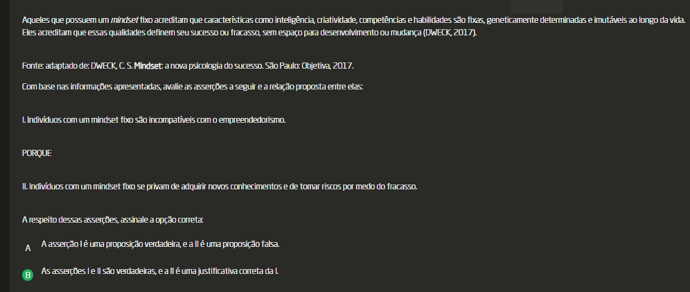 <p>Aqueles que possuem um mindset fixo acreditam que características como inteligência, competências e habilidades são fixas, geneticamente determinadas e imutáveis ao longo da vida. Eles acreditam que essas qualidades definem seu sucesso fracasso, sem espaço para desenvolvimento ou mudança (DWECK, 2017). adaptado de: S Mindset a nova psicologia do São Objetiva, 2017. Com base nas informações apresentadas, avalie as asserções a seguir e a relação proposta entre elas: I. Indivíduos com um mindset fixo são incompatíveis com empreendedorismo. PORQUE IL com um mindset fixo se privam de novos conhecimentos e de tomar riscos por medo do fracasso. A respeito dessas assinale a opção correta: A A asserção é uma proposição verdadeira, e all é uma proposição falsa B As asserções le II são verdadeiras, e all é uma justificativa correta da I.</p>