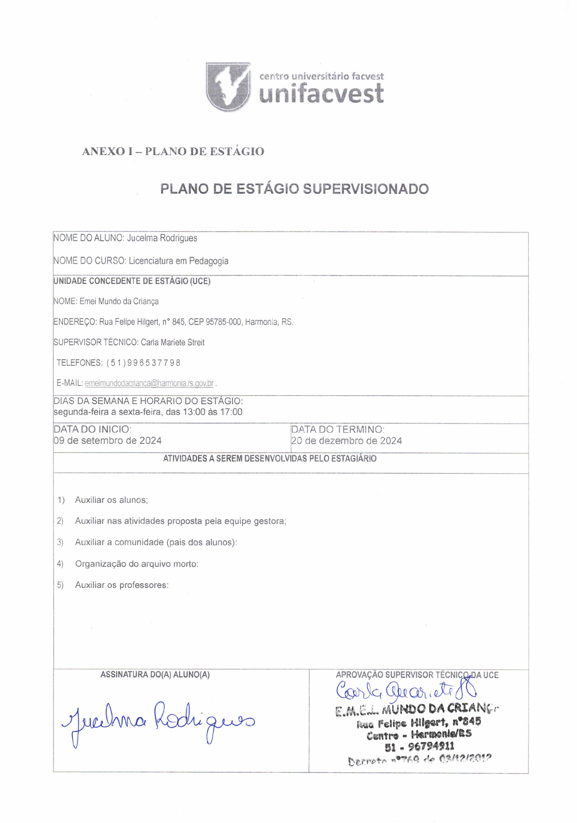 <p>centro universitário facvest unifacvest ANEXO I - PLANO DE ESTÁGIO PLANO DE ESTÁGIO SUPERVISIONADO NOME DO ALUNO: Jucelma Rodrigues NOME DO CURSO: Licenciatura em Pedagogia UNIDADE CONCEDENTE DE ESTÁGIO (UCE) NOME: Emei Mundo da Criança ENDEREÇO: Rua Felipe Hilgert, n° 845, CEP 95785-000, Harmonia, RS. SUPERVISOR TÉCNICO: Carla Mariete Streit TELEFONES: (51)996537798 E-MAIL: DIAS DA SEMANA E HORARIO DO ESTÁGIO: segunda-feira a sexta-feira, das 13:00 às 17:00 DATA DO INICIO: DATA DO TERMINO: 09 de setembro de 2024 20 de dezembro de 2024 ATIVIDADES A SEREM DESENVOLVIDAS PELO ESTAGIÁRIO 1) Auxiliar os alunos; 2) Auxiliar nas atividades proposta pela equipe gestora; 3) Auxiliar a comunidade (pais dos alunos): 4) Organização do arquivo morto: 5) Auxiliar os professores: ASSINATURA DO(A) ALUNO(A) APROVAÇÃO SUPERVISOR UCE Carla E.M.E.L. MUNDO DA Felipe Hilgart, n°845 Centro 51 - 96794911 03/12/2012</p>