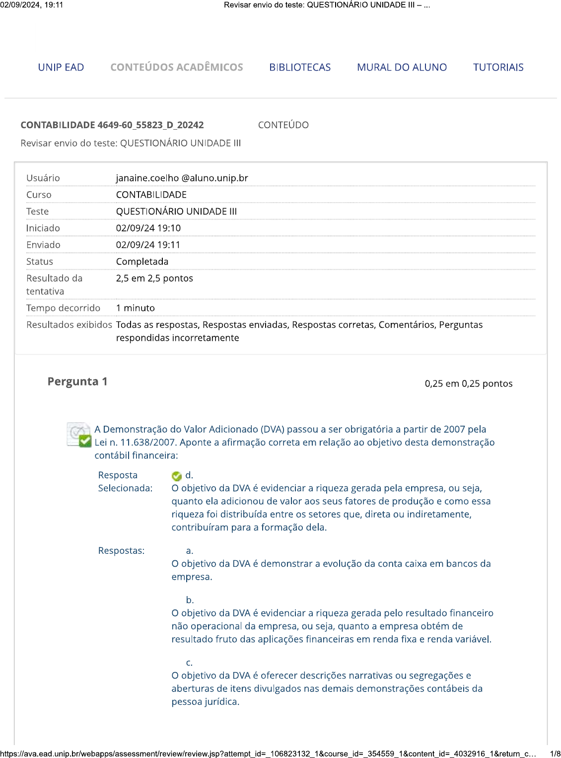 <p>02/09/2024, 19:11 Revisar envio do teste: QUESTIONÁRIO UNIDADE III UNIP EAD CONTEÚDOS ACADÊMICOS BIBLIOTECAS MURAL DO ALUNO TUTORIAIS CONTABILIDADE CONTEÚDO Revisar envio do teste: QUESTIONÁRIO UNIDADE III Usuário janaine.coelho@aluno.unip.br Curso CONTABILIDADE Teste QUESTIONÁRIO UNIDADE III Iniciado 02/09/24 19:10 Enviado 02/09/24 19:11 Status Completada Resultado da 2,5 em 2,5 pontos tentativa Tempo decorrido 1 minuto Resultados exibidos Todas as respostas, Respostas enviadas, Respostas corretas, Comentários, Perguntas respondidas incorretamente Pergunta 1 0,25 em 0,25 pontos A Demonstração do Valor Adicionado (DVA) passou a ser obrigatória a partir de 2007 pela Lei n. 11.638/2007. Aponte a afirmação correta em relação ao objetivo desta demonstração contábil financeira: Resposta d. Selecionada: objetivo da DVA é evidenciar a riqueza gerada pela empresa, ou seja, quanto ela adicionou de valor aos seus fatores de produção e como essa riqueza foi distribuída entre os setores que, direta ou indiretamente, contribuíram para a formação dela. Respostas: a. O objetivo da DVA é demonstrar a evolução da conta caixa em bancos da empresa. b. O objetivo da DVA é evidenciar a riqueza gerada pelo resultado financeiro não operacional da empresa, ou seja, quanto a empresa obtém de resultado fruto das aplicações financeiras em renda fixa e renda variável. C. O objetivo da DVA é oferecer descrições narrativas ou segregações e aberturas de itens divulgados nas demais demonstrações contábeis da pessoa jurídica. 1/8</p><p>02/09/2024, 19:11 Revisar envio do teste: QUESTIONÁRIO UNIDADE III d. O objetivo da DVA é evidenciar a riqueza gerada pela empresa, ou seja, quanto ela adicionou de valor aos seus fatores de produção e como essa riqueza foi distribuída entre os setores que, direta ou indiretamente, contribuíram para a formação dela. e. O objetivo da DVA é demonstrar a evolução dos custos e despesas da pessoa jurídica. Comentário da Resposta: D resposta: Comentário: A única alternativa correta é a opção D, uma vez que corresponde ao objetivo de uma Demonstração do Valor Adicionado (DVA). Pergunta 2 0,25 em 0,25 pontos A Contabilidade fornece importantes ferramentais para padronizar as formas de controle e demonstração da evolução patrimonial financeira das empresas. Além das diversas demonstrações contábeis financeiras disponíveis, a Ciência Contábil também prevê o uso das notas explicativas. Quanto às notas explicativas, é correto afirmar que: Resposta e. Selecionada: Notas explicativas contêm informação adicional em relação à apresentada nas demonstrações contábeis. As notas explicativas oferecem descrições narrativas ou segregações e aberturas de itens divulgados nessas demonstrações e informação acerca de itens que não se enquadram nos critérios de reconhecimento nas demonstrações contábeis. Respostas: a. Notas explicativas contêm informações irrelevantes para complementar as demonstrações financeiras. b. Notas explicativas contêm informações acessórias para complementar as demonstrações contidas na demonstração de fluxo de caixa. C. Notas explicativas contêm informações irrelevantes para complementar as demonstrações contidas na demonstração de resultado do exercício. d. Notas explicativas contêm informações acessórias para completar informações da DVA.</p><p>02/09/2024, 19:11 Revisar envio do teste: QUESTIONÁRIO UNIDADE III e. Notas explicativas contêm informação adicional em relação à apresentada nas demonstrações contábeis. As notas explicativas oferecem descrições narrativas ou segregações e aberturas de itens divulgados nessas demonstrações e informação acerca de itens que não se enquadram nos critérios de reconhecimento nas demonstrações contábeis. Comentário da Resposta: E resposta: Comentário: A única alternativa correta é a opção E, já que corresponde ao objetivo das notas explicativas, que é detalhar e esclarecer as movimentações apontadas nas demonstrações contábeis financeiras. Pergunta 3 0,25 em 0,25 pontos Partindo da hipótese que uma determinada empresa com fins lucrativos possua R$ 310.000,00 em ativos e R$ 90.000,00 em passivos, suponha que os gestores desta empresa decidam pagar, nesse momento, todas as suas obrigações e distribua o restante igualmente entre os três sócios. Nesse contexto, o valor referente ao patrimônio líquido da empresa será de: Resposta Selecionada: R$ 220.000,00. a. Respostas: a. R$ $220.000,00. b. R$ 200.000,00. R$ 240.000,00. C. d. R$ $ 180.000,00. R$ 210.000,00. e. Comentário da Resposta: A resposta: Comentário: Considerando que a equação do patrimônio líquido (PL) é dada por ativo passivo, temos que: ativo = 310.000 - passivo = 90.000, teremos um patrimônio líquido de R$ 220.000,00. Pergunta 4 0,25 em 0,25 pontos A empresa Tecnoplus Participações possui um patrimônio líquido de R$ 100.000,00; um ativo total de R$ 450.000,00; um passivo não circulante de R$ 50.000,00. Aponte a afirmação correta que evidencia o total do passivo circulante da empresa: Resposta Selecionada: R$ 300.000,00. C. 3/8</p><p>02/09/2024, 19:11 Revisar envio do teste: QUESTIONÁRIO UNIDADE III Respostas: R$ 310.000,00. a. b. R$ 350.000,00. R$ 300.000,00. C. d. R$ 380.000,00. e. R$ 290.000,00. Comentário Resposta: C da resposta: Comentário: Sabendo-se que ativo total = passivo total e considerando que o ativo total é de R$ 450.000,00, temos que o passivo total também é R$ 450.000,00. Tendo em vista que o total do passivo é dado por passivo circulante (PC) + passivo não circulante (PNC) + patrimônio líquido (PL), temos que PNC é de 50.000, PL é de 100.000 e o passivo total é de 450.000, a diferença para completar os 450.000 corresponde aos 300.000 de passivo circulante. Logo, a alternativa correta é a opção C. Pergunta 5 0,25 em 0,25 pontos A empresa Belinha Ltda. possuía, em 2021, um p
