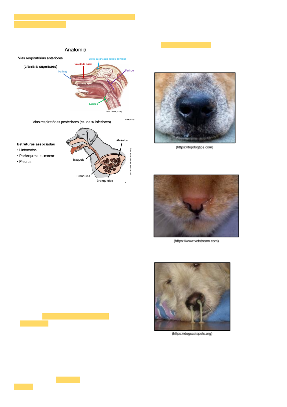 <p>Semiologia do sistema respiratório de</p><p>pequenos animais:</p><p>Carina - bifurcação na traqueia</p><p>As pleuras revestem a a cavidade toracica e</p><p>protegem os pulmões. Nas peluras tem o líquido</p><p>Pleural.</p><p>- Síndrome das vias aéreas dos</p><p>braquicefálicos</p><p>1) Exame clínico do Sistema Respiratório:</p><p>Objetivos:</p><p>- Determinar se a alteração é do sistema</p><p>respiratório.</p><p>- Localizar o processo dentros do sistema</p><p>respiratório.</p><p>- Estabelecer a etiologia</p><p>- Iniciar pela identificação do paciente.</p><p>- Anamnese: Qual a queixa principal? como</p><p>iniciou? qual a evolução? quanto tempo ?</p><p>- Tratamentos anteriores (drogas, doses,</p><p>resultados), ambiente, alimentação,</p><p>vacinas, desverminação, revisão dos</p><p>sistemas orgânicos, sinais clínicos</p><p>relacionados ao sistema respiratório.</p><p>É um sinal clínico individual (em 1 animal) ou algo</p><p>coletivo (vários animais) ?</p><p>2) Sinais clínicos associados ao sistema</p><p>respiratório:</p><p>● Secreção nasal: Tipos de secreção</p><p>Serosa: é normal, límpida. mas o excesso não.</p><p>Mucosa: espessa e esbranquiçada</p><p>Purulenta: espessa e amarelada</p><p>Hemorrágica:</p><p>***Epistaxe: hemorragia nasal pura</p><p>Sangue puro - hemorragia; pode ser deficiência de</p><p>coagulação, estrutural vital (vaso sanguíneo que</p><p>pode estar sendo ou está rompido)</p><p>Sero-hemorrágica: serosa com estrias de sangue.</p><p>● Tosse: Expiração explosiva de ar dos</p><p>pulmões através da boca. É um reflexo</p><p>protetor.</p><p>Tosse produtiva - se tem líquido</p><p>Não produtiva - seca</p><p>*** Hemoptise: tosse com sangue</p><p>- Edema pulmonar cardiogênico - gera tosse</p><p>por acúmulo de líquido</p><p>● Hemoptise: eliminação de sangue pela</p><p>tosse = boca e narinas. Indica sangue nas</p><p>vias aéreas mais baixas.</p><p>Origem: Trato respiratório posterior (caudal).</p><p>Causas diversas: traumas, neoplasias,</p><p>coagulopatias, etc.</p><p>Importante diferenciar de hematêmese (vômito de</p><p>sangue) = sangue de origem do TGI.</p><p>● Espirro: Expiração brusca e ruidosa pelo</p><p>nariz.</p><p>- Causas: Irritação dos nervos nasais;</p><p>Reflexo protetor: corpos estranhos, poeira,</p><p>poluentes ambientais, alergias.</p><p>● Espirro reverso: Período breve de</p><p>inspiração ruidosa e forçada.</p><p>- Comum em cães de pequeno porte (hígidos</p><p>ou doentes)</p><p>- Possui natureza aguda, transitória e</p><p>autolimitante.</p><p>Causas: processo envolvendo a nasofaringe</p><p>(irritação), idiopáticas.</p><p>● Estridor: Som inspiratório agudo</p><p>(semelhante a um assobio fino)</p><p>- Audível sem o uso de estetoscópio</p><p>- Decorre de distúrbios na laringe, traqueia</p><p>ou narinas</p><p>- Incomum em gatos</p><p>- Em cães pode ocorrer disfonia (mudança</p><p>no latido)</p><p>- Comum na paralisia de laringe - as</p><p>aritenoides ficam meio fechadas, pode</p><p>causar dispneia e síncope.</p><p>● Ronco: som alto e grosseiro.</p><p>- Audível sem estetoscópio</p><p>- Ocorre devido a uma quantidade excessiva</p><p>de palato mole ou massas/ pólipos na</p><p>região da faringe</p><p>- Mais comum em cães de raças</p><p>braquiocefálicas e em animais obesos.</p><p>● Cianose: Coloração azulada observadas</p><p>em pele e mucosas.</p><p>- Decorrente de hipóxia tecidual</p><p>- Cautela*** = raças com a língua azulada.</p><p>(Ex: chow chow e sharpei)</p><p>● Dispneia: Dificuldade respiratória</p><p>- Narinas dilatadas, respiração com a boca</p><p>aberta, esforço respiratório evidente;</p><p>comum cianose.</p><p>- Esforço abdominal e torácica forte</p><p>● Ortopneia: quadro extremo de dispneia.</p><p>Neia - pescoço</p><p>- O paciente não consegue deitar - assume</p><p>posições que confiram alívio (estação ou</p><p>decúbito esternal).</p><p>Cautela !!!</p><p>- Manipulação cuidadosa de animais</p><p>dispneicos/cianóticos</p><p>- Estabilizar o paciente antes da avaliação</p><p>clínica.</p><p>3) Exame físico geral:</p><p>4) Exame físico específico:</p><p>- Inspeção</p><p>- Palpação</p><p>- Percussão</p><p>- Auscultação</p><p>● Inspeção e palpação:</p><p>Cabeça e pescoço: Aumentos de volumes;</p><p>cavidade oral (dentes e palato); focinho (úmido -</p><p>normal, seco), narinas (presença de secreções);</p><p>reflexo de tosse - friccionar os anéis traqueais.</p><p>Tórax: Aumentos de volume, ferimentos, fraturas</p><p>de costelas, dor torácica, enfisema SC.</p><p>- Respiração:</p><p>Tipo respiratório: Costoabdominal, abdominal,</p><p>costal.</p><p>Ritmo respiratório: a duração da inspiração e</p><p>expiração são semelhantes.</p><p>- Frequência respiratória:</p><p>Termos:</p><p>- Eupneia: respiração normal</p><p>- Taquipneia: aumento da FR</p><p>- Bradipneia: diminuição da FR</p><p>- Apneia: ausência de respiração</p><p>- Oscilações fisiológicas da Frequência</p><p>respiratória:</p><p>Aumento da frequência respiratória:</p><p>- Animais jovens</p><p>- Gestação</p><p>- Exercício</p><p>- Estresse</p><p>- Ambientes quentes e úmidos</p><p>Diminuição da frequência respiratória:</p><p>- Animais obesos</p><p>- Repouso prolongado</p><p>● Auscultação:</p><p>- Local silencioso</p><p>- Animal preferencialmente em estação</p><p>- Auscultar de maneira sistemática = de</p><p>frente para trás e de cima para baixo nos</p><p>espaços intercostais;</p><p>- Auscultar, no mínimo, dois movimentos</p><p>respiratórios em cada ponto de</p><p>auscultação.</p><p>- Fazer auscultação comparativa em cada</p><p>lado do tórax.</p><p>- Toda área de anormalidade deverá ser</p><p>auscultada novamente e comparada com</p><p>áreas normais.</p><p>Felinos = Ronronar; é um ruído grave;</p><p>Ativação dos músculos laríngeos intrínsecos.</p><p>Parar de ronronar = estímulo desagradável leve</p><p>(ex: 