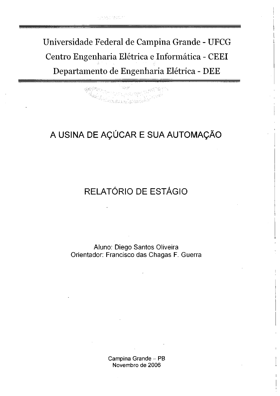 <p>Universidade Federal de Campina Grande - UFCG</p><p>Centro Engenharia Eletrica e Informatica - CEEI</p><p>Departamento de Engenharia Eletrica - DEE</p><p>A USINA DE AQUCAR E SUA AUTOMAQAO</p><p>RELATORIO DE ESTAGIO</p><p>Aluno: Diego Santos Oliveira</p><p>Orientador: Francisco das Chagas F. Guerra</p><p>Campina Grande - PB</p><p>Novembro de 2006</p><p>Biblioteca Setorial do CDSA. Fevereiro de 2021.</p><p>Sumé - PB</p><p>A USINA DE AQUCAR E ALCOOL E SUA AUTOMAQAO</p><p>Relatorio de estagio apresentado ao Curso de Graduagao em</p><p>Engenharia Eletrica da Universidade Federal de Campina Grande, em</p><p>cumprimento parcial as exigencias para obtengao do Grau de</p><p>Engenheiro Eletricista.</p><p>Diego Santos Oliveira</p><p>Aluno</p><p>Francisco das Chagas F. Guerra</p><p>Orientador</p><p>Campina Grande - PB</p><p>Novembro de 2006</p><p>2</p><p>Sumario</p><p>1. INTRODUQAO 5</p><p>2. A EMPRESA 5</p><p>3. O P R O C E S S O PRODUTIVO 6</p><p>3.1 Recepcao 6</p><p>3.2 Descarregamento 7</p><p>3.3 Preparo 7</p><p>3.4 Extracao 8</p><p>3.4.1 Automacao na area de extra pa o 9</p><p>3.4.2 Resultados obtidos com a automacao 10</p><p>3.5 Tratamento de caldo 10</p><p>3.5.1 Caleacao e Sulfitagao 10</p><p>3.5.2 Aquecimento 11</p><p>3.5.3 Decantacao 11</p><p>3.5.4 Automacao na area de tratamento de caldo 12</p><p>3.5.5 Resultados obtidos com a automacao 12</p><p>3.6 Filtacao 13</p><p>3.7 Evaporacao 13</p><p>3.7.1 Automacao na area de evaporacao 14</p><p>3.7.2 Resultados obtidos com a automacao 15</p><p>3.8 Cozimento 15</p><p>3.8.1 Automacao da area de cozimento 16</p><p>3.8.2 Resultados obtidos com a automacao 16</p><p>3.9 Cristalizacao 16</p><p>3.10 Centrifugacao 17</p><p>3.10.1 Automacao na area de centrifugacao 18</p><p>3.11 Secagem do agucar 19</p><p>3.11.1 Automagao da area de secagem 19</p><p>3.12 Refinagao 20</p><p>3.13 Ensacamento 21</p><p>4. G E R A ? A O DE VAPOR 21</p><p>4.1 Automagao na area de geragao de vapor 23</p><p>3</p><p>4.2 resultados obtidos com a automagao 24</p><p>5. APLICAQAO DE UM PROJETO DE AUTOMAQAO 24</p><p>5.1 Projeto 24</p><p>5.2 Beneficios 25</p><p>5.3 Programacao por linguagens de sinais (Ladder) 25</p><p>5.4 Controlador Clic 02 - WEG 28</p><p>5.4.1 Caracteristicas 28</p><p>5.4.2 Vantagens de uso 28</p><p>5.4.3 Aplicagdes 29</p><p>5.5 Programagao do projeto 29</p><p>5.6 Esquema eletrico 30</p><p>5.7 Principio de funcionamento 31</p><p>6. PERSPECTIVAS DO SETOR SUCROALCOOLEIRO 32</p><p>7. CONCLUSAO 33</p><p>8. R E F E R E N C E S BIBLIOGRAFICAS 34</p><p>9. ANEXOS 35</p><p>4</p><p>1. INTRODUQAO</p><p>O estagio foi realizado na S. A. Leao Irmaos - Agucar e Alcool, unidade</p><p>constituida por uma usina de agucar e uma destilaria de alcool localizada em Rio</p><p>Largo, interior de Alagoas, bem proximo a capital Maceio. No dia 20 de fevereiro de</p><p>2006 iniciou-se um intenso aprendizado sobre todo o processo produtivo destas</p><p>unidades com intuido de futuramente poder contribuir de alguma forma com os</p><p>conhecimentos adquiridos na Universidade Federal de Campina Grande e ao longo</p><p>da vida academica.</p><p>Apos a integragao realizada em todas as partes da industria, processo que</p><p>durou pouco mais de um mes, foi apresentado um programa de atividades para ser</p><p>seguido ao longo do estagio, objetivando diversas melhorias como: organizagao,</p><p>padronizagao e especificagao dos materiais eletricos da industria; automagao em</p><p>sistemas de acionamento de motores (projeto de automagao do controle de uma</p><p>ponte rolante industrial), adequagao da industria as exigencias do Ministerio do</p><p>Trabalho e Emprego perante a Norma Regulamentadora Numero 10 (Seguranga em</p><p>Instaliagoes e Servigos com Eletricidade); analise da viabilidade de automagao de</p><p>processos, e outras. A implementagao de uma dessas atividades sera apresentada</p><p>com maior enfase nesse trabalho.</p><p>2. A EMPRESA</p><p>A S. A. Leao Irmaos, popularmente conhecida como Usina Leao, teve sua</p><p>primeira unidade fundada em 1894 e passou por diversas modificagoes ao longo do</p><p>tempo, melhorando continuamente suas instalagoes e adaptando-se muito bem ao</p><p>desenvolvimento tecnologico bastante acentuado nas ultimas decadas. Atualmente,</p><p>em sua terceira unidade (construida no final da decada de 70), esta entre as cinco</p><p>maiores produtoras de agucar e alcool em um estado predominantemente agucareiro</p><p>(total de 26 usinas).</p><p>A familia Leao, proprietaria da Usina, uma das mais tradicionais produtoras do</p><p>nordeste no setor, de olho nas oportunidades que surgem num mercado cada vez</p><p>mais competitivo viu a necessidade de um processo de reestruturagao em sua</p><p>organizagao. Entao, em meados dos anos 90 iniciou-se uma gestao profissionalizada</p><p>5</p><p>montando uma equipe de executivos gabaritados, muitos vindo de Sao Paulo e com</p><p>historico de atuacao em outros segmentos, que vem obtendo otimos resultados.</p><p>Outra preocupacao marcante da unidade e com o meio ambiente. Muito antes</p><p>do surgimento de normas ambientais, sempre houve uma preocupacao com a</p><p>preservacao ambiental nas areas da empresa. Atualmente possui 7,5 mil hectares</p><p>preservados de mata atlantica, totalizando a maior area privada desta vegetagao no</p><p>estado de Alagoas.</p><p>3. O P R O C E S S O PRODUTIVO</p><p>O processo produtivo do agucar e constituido por diversas etapas, envolvendo</p><p>as areas agricola (plantio, colheita, transporte) e industrial (transformagao da materia</p><p>prima em produto final). Alem do agucar, tambem e produzida uma grande quantidade</p><p>de alcool na destilaria da industria. Entretanto este processo nao sera tratado no</p><p>trabalho, visto que nao foram realizadas muitas atividades e projetos relacionados a</p><p>Engenharia Eletrica nesta area da industria.</p><p>Deste modo, sera apresentada uma descrigao sucinta das etapas da produgao</p><p>do agucar refinado e os principals controles utilizados no processo industria