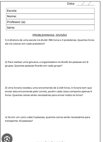 <p>Data: / Escola: Nome: Professor (a): Série: PROBLEMINHAS DIVISÃO 1) A diretora de uma escola irá dividir 396 livros 3 Quantos livros ela irá colocar em cada prateleira? 2) Para realizar uma a organizadora irá dividir 64 pessoas em 8 Quantas pessoas ficarão em cada grupo? 3) Uma livraria recebeu uma encomenda de 2,448 A livraria term que enviar esta encomenda pelo cada caixa comporta apenas 9 Quantas caixas serão para enviar todos os livros? 4) Se em um carro cabe 5 pessoas, quantos carros serão necessários para transportar 45 pessoas?</p>