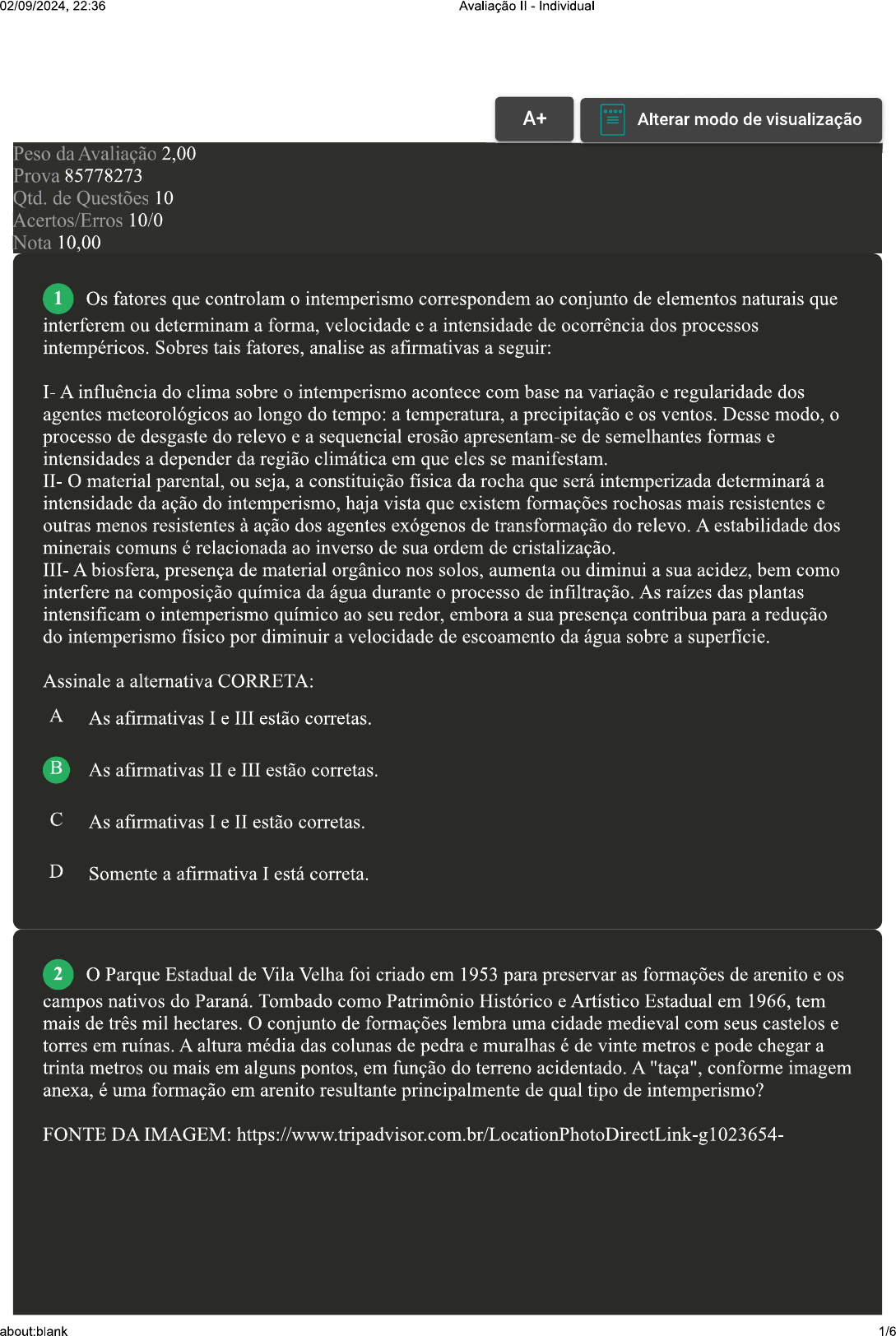 <p>02/09/2024, 22:36 Avaliação Individual A+ Alterar modo de visualização Peso da Avaliação 2,00 Prova 85778273 Qtd. de Questões 10 Acertos/Erros 10/0 Nota 10,00 1 Os fatores que controlam intemperismo correspondem ao conjunto de elementos naturais que interferem ou determinam a forma, velocidade e a intensidade de ocorrência dos processos intempéricos. Sobres tais fatores, analise as afirmativas a seguir: A influência do clima sobre intemperismo acontece com base na variação e regularidade dos agentes meteorológicos ao longo do tempo: a temperatura, a precipitação e os ventos. Desse modo, processo de desgaste do relevo e a sequencial erosão apresentam-se de semelhantes formas e intensidades a depender da região climática em que eles se manifestam. II- O material parental, ou seja, a constituição física da rocha que será intemperizada determinará a intensidade da ação do intemperismo, haja vista que existem formações rochosas mais resistentes e outras menos resistentes à ação dos agentes exógenos de transformação do A estabilidade dos minerais comuns é relacionada ao inverso de sua ordem de cristalização. III- A biosfera, presença de material orgânico nos solos, aumenta ou diminui a sua acidez, bem como interfere na composição química da água durante processo de infiltração. As raízes das plantas intensificam intemperismo químico ao seu redor, embora a sua presença contribua para a redução do intemperismo físico por diminuir a velocidade de escoamento da água sobre a superfície. Assinale a alternativa CORRETA: A As afirmativas I e III estão corretas. B As afirmativas II e III estão corretas. C As afirmativas I e II estão corretas. D Somente a afirmativa I está correta. 2 O Parque Estadual de Vila Velha foi criado em 1953 para preservar as formações de arenito e os campos nativos do Paraná. Tombado como Patrimônio Histórico e Artístico Estadual em 1966, tem mais de três mil hectares. O conjunto de formações lembra uma cidade medieval com seus castelos e torres em A altura média das colunas de pedra e muralhas é de vinte metros e pode chegar a trinta metros ou mais em alguns pontos, em função do terreno acidentado. A "taça", conforme imagem anexa, é uma formação em arenito resultante principalmente de qual tipo de intemperismo? FONTE DA IMAGEM:https://www.tripadvisor.com.br/LocationPhotoDirectLink-g1023654- about:blank 1/6</p><p>02/09/2024, 22:36 Avaliação Individual em: 28 ago. A Intemperismo Físico. B Intemperismo Líquido. C Intemperismo Biológico. D Intemperismo Químico. 3 A estabilidade dos agregados expressa a resistência à desagregação que os agregados apresentam quando submetidos a forças externas ou forças internas que tendem a rompê-los. Sobre os fatores que afetam as movimentações de massa, classifique V para as sentenças verdadeiras e F para as falsas: ( ) Os materiais que constituem uma encosta variam significativamente dependendo do tipo de terreno. Para cada tipo de material, podemos considerar um ângulo diferente de repouso. ( ) Os desmatamentos e incêndios nas florestas reduzem a vegetação das encostas desta forma, reduzindo a estabilidade da encosta e propiciando as movimentações de massa. ( ) Os movimentos de massa podem ser atribuídos à quantidade de água na rocha ou no solo Geralmente, a época de ocorrência dos desabamentos acontece no período das chuvas intensas e prolongadas, pois a presença de água entre as partículas aumenta atrito interno do solo. ( ) A velocidade de deslizamento de um material nas encostas é proporcional à declividade, ou seja, quanto mais íngreme é terreno. mais estável e, consequentemente, maior a possibilidade de movimentos. Assinale a alternativa que apresenta a sequência CORRETA: A B C V-V-F-V D 4 A estrutura do solo é constituída pela disposição geométrica das partículas. A textura e a estrutura do solo influenciam na quantidade de ar e de água que as plantas em crescimento podem about:blank 2/6</p><p>02/09/2024, 22:36 Avaliação II Individual obter. Sobre os tipos de estruturas do solo e na imagem a seguir, assinale a alternativa CORRETA: Dos Santos et p 23) A A - Laminar; BA E BB - Prismática; CA E CB - Em blocos; D Granular. B A Prismática; BA E BB - Laminar; CA E CB - Em blocos; D Granular. C A Em blocos ; BA E BB - Laminar; CA E CB Prismática; D - Granular. D A Laminar; BA E BB - Prismática; CA E CB - Granular; D - Em blocos. 5 No Brasil, os solos são classificados de acordo com suas características físicas, químicas, mineralógicas e morfológicas. São também levados em consideração dados e informações relativos à área em que solo se encontra. Neste sentido, são considerados: clima, aspectos hídricos (chuvas, passagem de rios, freáticos), material de origem do solo, época de formação, relevo e vegetação. Sobre a classificação dos solos no Brasil, associe os itens, utilizando o código a seguir: I- Solo bem argiloso, apresentando mobilização de argila da parte mais superficial. Solo pouco desenvolvido, com horizonte B incipiente. III- Solo altamente evoluído, lateralizado, rico em argilominerais e de ferro e alumínio. IV- Solo essencialmente orgânico cujo material original constitui próprio solo. ( ) Organossolos. ( ) Latossolos. ) Argilossolo. ( ) Cambissolo. Assinale a alternativa que apresenta a sequência CORRETA: A III II I IV. B C D IV - II. 6 Determinado local é onde os seres vivos estão situados e é onde os equipamentos de topografia são instalados para desenvolvimento de serviços topográficos. about:blank 3/6</p><p>02/09/2024, 22:36 Avaliação Individual Assinale a alternativa CORRETA que indica qual é esse A A superfície terrestre. B A superfície plana. C A superfície topográfica. D A superfície geoide. 7 O processo de formação do relevo envolve diversos fenômenos, dentre os quais, destaca-se intemperismo, responsável pela desagregação das rochas. Sobre as cara