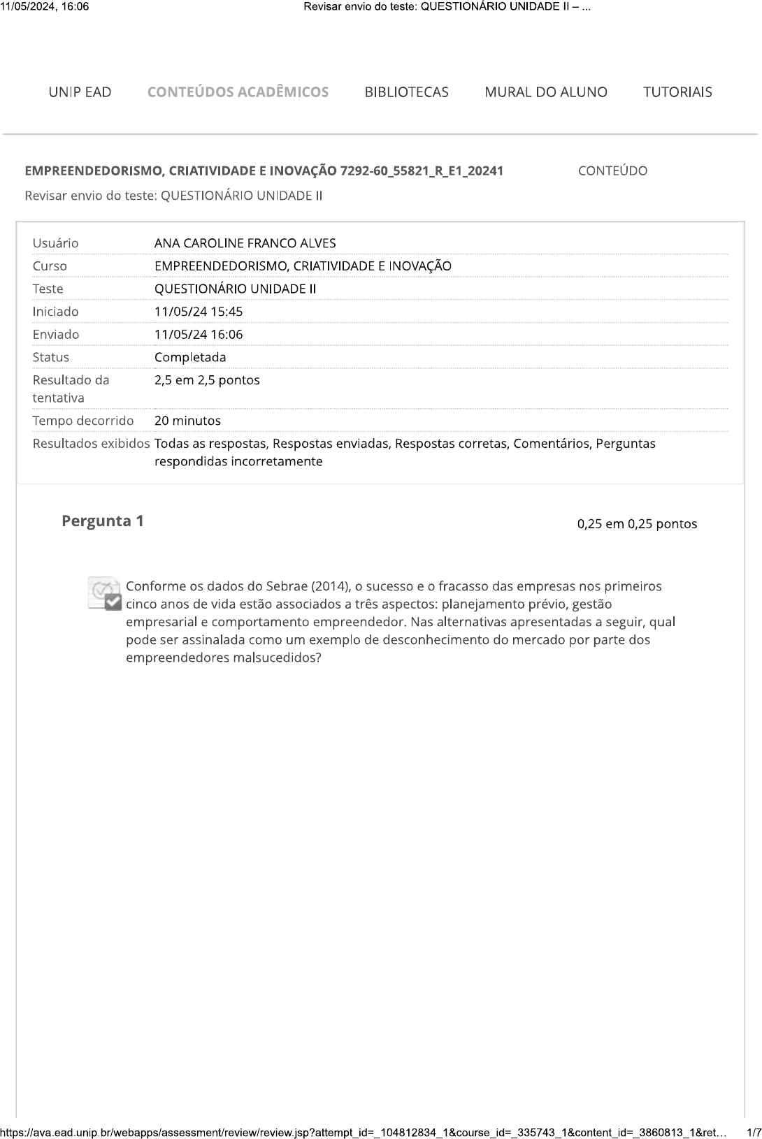 <p>11/05/2024, 16:06 Revisar envio do teste: QUESTIONÁRIO UNIDADE - UNIP EAD CONTEÚDOS ACADÊMICOS BIBLIOTECAS MURAL DO ALUNO TUTORIAIS EMPREENDEDORISMO, CRIATIVIDADE E INOVAÇÃO 7292-60_ 55821_R_E1_20241 CONTEÚDO Revisar envio do teste: QUESTIONÁRIO UNIDADE Usuário ANA CAROLINE FRANCO ALVES Curso EMPREENDEDORISMO, CRIATIVIDADE E INOVAÇÃO Teste QUESTIONÁRIO UNIDADE II Iniciado 11/05/24 15:45 Enviado 11/05/24 16:06 Status Completada Resultado da 2,5 em 2,5 pontos tentativa Tempo decorrido 20 minutos Resultados exibidos Todas as respostas, Respostas enviadas, Respostas corretas, Comentários, Perguntas respondidas incorretamente Pergunta 1 0,25 em 0,25 pontos Conforme os dados do Sebrae (2014), o sucesso e o fracasso das empresas nos primeiros cinco anos de vida estão associados a três aspectos: planejamento prévio, gestão empresarial e comportamento empreendedor. Nas alternativas apresentadas a seguir, qual pode ser assinalada como um exemplo de desconhecimento do mercado por parte dos empreendedores malsucedidos? 1/7</p><p>11/05/2024, 16:06 Revisar envio do teste: QUESTIONÁRIO UNIDADE Resposta Selecionada: Não sabiam o número de clientes que teriam nem os seus hábitos. Respostas: Não definiram uma estratégia para evitar desperdícios. a. b. Não determinaram o valor do lucro pretendido. C. Não elaboraram um plano de negócios. d. Não planejaram como a empresa funcionaria em sua ausência. e. Não sabiam o número de clientes que teriam nem os seus hábitos. Comentário Resposta: E da resposta: Comentário: dentre as alternativas, apenas a letra E representa um indicativo de desconhecimento de mercado ambiente externo, ou seja, não houve o cuidado em conhecer as características e os comportamentos do público consumidor do produto e/ou serviço. As demais alternativas indicam falhas de planejamento em relação à concepção do negócio, a partir de elementos do ambiente interno da empresa. Pergunta 2 0,25 em 0,25 pontos Entre as diversas definições de plano de negócios, é incorreto afirmar: Resposta b. Selecionada: É a descrição, em um documento, dos riscos de negócio que o candidato a empreendedor pretende desenvolver. Respostas: a. É um documento usado para descrever um empreendimento e o modelo de negócios que sustenta a empresa. b. É a descrição, em um documento, dos riscos de negócio que o candidato a empreendedor pretende desenvolver. C. É um documento preparado pelo empreendedor, no qual são descritos todos os elementos externos e internos para o início de um novo empreendimento. d. É um documento que descreve os objetivos de negócio e quais passos devem ser dados para serem alcançados. e. É um documento que descreve uma série de etapas processuais para o adequado posicionamento no ambiente de negócios. Comentário da Resposta: B resposta: Comentário: ao desenvolver um plano de negócios, o empreendedor 2/7</p><p>11/05/2024, 16:06 Revisar envio do teste: QUESTIONÁRIO UNIDADE busca identificar oportunidades, as quais possibilitem atender às demandas não atendidas ou atendidas de maneira insatisfatória. Pergunta 3 0,25 em 0,25 pontos Degen (2009) apresenta uma série de benefícios que um plano de negócios pode gerar: I. É praticamente impossível para as pessoas guardarem na memória ordenadamente todos os dados e as informações necessárias para um novo negócio, e a elaboração do plano de negócio torna o acesso às informações consistente e imediato. II. Avaliar o potencial de lucro do negócio e perspectivas de crescimento, projetar o fluxo de caixa; declarar, avaliar e mitigar os riscos do empreendimento; estabelecer o plano de marketing e vendas, estabelecer o plano de operação. III. Os riscos do negócio e as maneiras de superá-los são evidenciados para todos os stakeholders, isso evita que algo crítico ao projeto fique esquecido. Está correto o que se afirma em: Resposta Selecionada: I, e III. e. Respostas: I, apenas. a. b. II. e III. C. d. e III. e. I, e III. Comentário da Resposta: E resposta: Comentário: as três afirmativas fazem parte de um estudo de Degen, que relaciona dez benefícios ao elaborar um plano de negócios, e contribuem para uma adequação do modelo de negócios às dimensões de planejamento e gerenciamento da empresa e as oportunidades percebidas. Pergunta 4 0,25 em 0,25 pontos Apesar de vários estudos apontarem para a importância do uso de um plano de negócios, muitos empreendedores justificam o desprezo pelo documento por conta dos seguintes argumentos, exceto: Resposta Selecionada: "Preciso conhecer o mercado". a. Respostas: "Preciso conhecer o mercado". a. b. "Não preciso disso". 3/7</p><p>11/05/2024, 16:06 Revisar envio do teste: QUESTIONÁRIO UNIDADE "Não tenho afinidade com C. d. "Tenho recursos suficientes". "Está tudo na minha cabeça". e. Comentário Resposta: A da resposta: Comentário: como em várias definições apontadas, o plano de negócios é um documento que contribui para a compreensão mais complexa do modelo de negócios, desde a percepção das oportunidades, assim como as limitações para o bom desempenho da iniciativa. Nesse sentido, o plano de negócios permite um conhecimento preciso das características do mercado, dos consumidores, da dinâmica logística e os respectivos comportamentos de todos os atores envolvidos no negócio. Pergunta 5 0,25 em 0,25 pontos Dornelas (2001) propõe um esquema geral para ajudar o empreendedor a formatar e alinhar o discurso de vendas do projeto. Após a elaboração do plano de negócios, deve-se considerar o que representa o alicerce do projeto. É necessário elaborar um sumário executivo e, em seguida, precisa ser desenvolvido o chamado elevator speech, que consiste em uma sequência de passos, em que o empreendedor buscará responder a alguns questionamentos básicos do seu modelo de negócios. Desse modo, questões como: "quais atividades chave serão desenvolvidas pela equipe", "quais marcos de referência ser