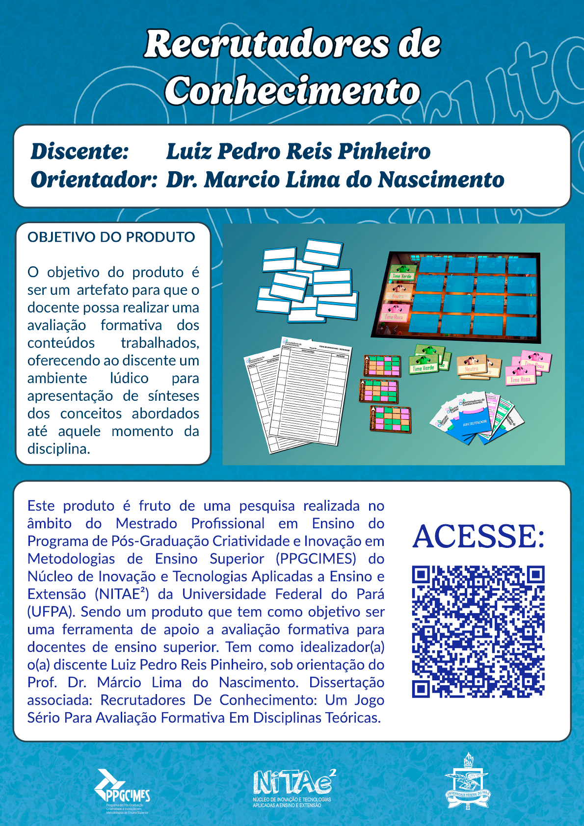 <p>Discente: Luiz Pedro Reis Pinheiro</p><p>Orientador: Dr. Marcio Lima do Nascimento</p><p>Recrutadores de</p><p>Conhecimento</p><p>Este produto é fruto de uma pesquisa realizada no</p><p>âmbito do Mestrado Profissional em Ensino do</p><p>Programa de Pós-Graduação Criavidade e Inovação em</p><p>Metodologias de Ensino Superior (PPGCIMES) do</p><p>Núcleo de Inovação e Tecnologias Aplicadas a Ensino e</p><p>Extensão (NITAE²) da Universidade Federal do Pará</p><p>(UFPA). Sendo um produto que tem como objevo ser</p><p>uma ferramenta de apoio a avaliação formava para</p><p>docentes de ensino superior. Tem como idealizador(a)</p><p>o(a) discente Luiz Pedro Reis Pinheiro, sob orientação do</p><p>Prof. Dr. Márcio Lima do Nascimento. Dissertação</p><p>associada: Recrutadores De Conhecimento: Um Jogo</p><p>Sério Para Avaliação Formava Em Disciplinas Teóricas.</p><p>ACESSE:</p>