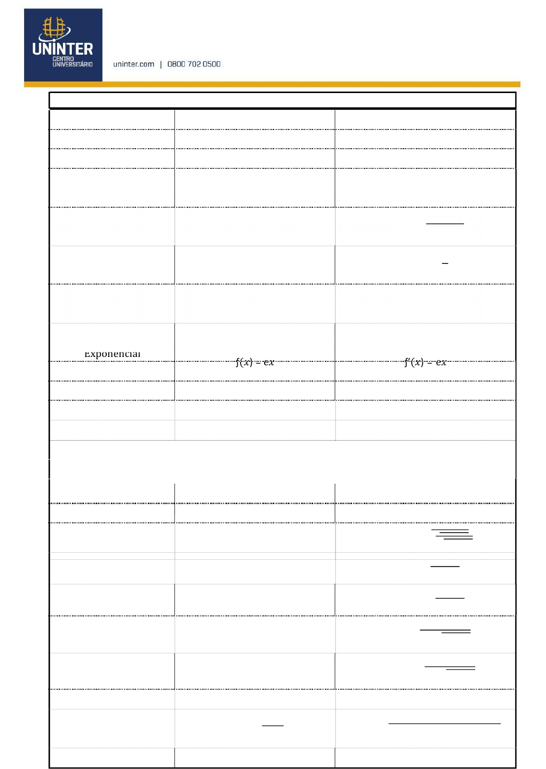 <p>CÁLCULO DIFERENCIAL E INTEGRAL A UMA VARIÁVEL</p><p>Formulário</p><p>DERIVADAS</p><p>Constante</p><p>ƒ(𝑥) = 𝑎</p><p>ƒ′(𝑥) = 0</p><p>Afim</p><p>ƒ(𝑥) = 𝑎𝑥 + 𝑏</p><p>ƒ′(𝑥) = 𝑎</p><p>Identidade</p><p>ƒ(𝑥) = 𝑥</p><p>ƒ′(𝑥) = 1</p><p>Potência</p><p>Logarítmica Logarítmica</p><p>ƒ(𝑥) = 𝑥𝑛</p><p>(</p><p>+</p><p>)(𝑥 ∈ 𝑅∗ e 𝑛 ∈ 𝑅) ƒ(𝑥) = log𝑎(𝑥)</p><p>(</p><p>+</p><p>)(𝑥 ∈ 𝑅∗ e 0 < 𝑎 ≠ 1)</p><p>ƒ′(𝑥) = 𝑛. 𝑥𝑛−1</p><p>ƒ′(𝑥) = 1</p><p>𝑥 ∙ ln(𝑎)</p><p>(Base Natural) Exponencial</p><p>ƒ(𝑥) = ln(𝑥) ƒ′(𝑥) = 1</p><p>𝑥</p><p>ƒ(𝑥) = 𝑎𝑥</p><p>(</p><p>Exponencial</p><p>ƒ</p><p>(</p><p>𝑥</p><p>)</p><p>=</p><p>e</p><p>𝑥</p><p>ƒ</p><p>′</p><p>(</p><p>𝑥</p><p>)</p><p>=</p><p>e</p><p>𝑥</p><p>)(Base qualquer)</p><p>(𝑎 > 0)</p><p>ƒ′(𝑥) = 𝑎𝑥 ∙ ln(𝑎)</p><p>(base Natural)</p><p>Seno</p><p>ƒ(𝑥) = 𝑠e𝑛(𝑥)</p><p>ƒ′(𝑥) = cos(𝑥)</p><p>Cosseno</p><p>ƒ(𝑥) = cos(𝑥)</p><p>ƒ′(𝑥) = −𝑠e𝑛(𝑥)</p><p>Tangente</p><p>ƒ(𝑥) = 𝑡𝑔(𝑥)</p><p>ƒ′(𝑥) = 𝑠e𝑐²(𝑥)</p><p>Cotangente</p><p>ƒ(𝑥) = 𝑐o𝑡𝑔(𝑥)</p><p>ƒ′(𝑥) = −𝑐o𝑠𝑠e𝑐²(𝑥)</p><p>Secante</p><p>ƒ(𝑥) = sec(𝑥)</p><p>ƒ′(𝑥) = 𝑡𝑔(𝑥) ∙ sec(𝑥)</p><p>Cossecante</p><p>ƒ(𝑥) = 𝑐o𝑠𝑠e𝑐(𝑥)</p><p>ƒ′(𝑥) = −𝑐o𝑡𝑔(𝑥) ∙ 𝑐o𝑠𝑠e𝑐(𝑥)</p><p>Arco-seno</p><p>ƒ(𝑥) = 𝑎𝑟𝑐𝑠e𝑛(𝑥)</p><p>ƒ′(𝑥) =</p><p>1</p><p>√1 − 𝑥²</p><p>Arco-cosseno ƒ(𝑥) = arccos(𝑥) ƒ′(𝑥) = − 1</p><p>√1 − 𝑥²</p><p>Arco-tangente ƒ(𝑥) = 𝑎𝑟𝑐𝑡𝑔(𝑥) ƒ′(𝑥) = 1</p><p>1 + 𝑥²</p><p>Arco-cotangente ƒ(𝑥) = 𝑎𝑟𝑐𝑐o𝑡𝑔(𝑥) ƒ′(𝑥) = − 1</p><p>1 + 𝑥²</p><p>Arco-secante ƒ(𝑥) = arcsec(𝑥) ƒ′(𝑥) = 1</p><p>𝑥 ∙ √𝑥² − 1</p><p>Arco-cossecante ƒ(𝑥) = 𝑎𝑟𝑐𝑐o𝑠𝑠e𝑐(𝑥) ƒ′(𝑥) = − 1</p><p>𝑥 ∙ √𝑥² − 1</p><p>Produto de funções ƒ(𝑥) = 𝑢(𝑥). 𝑣(𝑥) ƒ´(𝑥) = 𝑢(𝑥). 𝑣´(𝑥) + 𝑣(𝑥). 𝑢´(𝑥)</p><p>Divisão de funções ƒ(𝑥) = 𝑢(𝑥)</p><p>𝑣(𝑥)</p><p>ƒ`(𝑥) = 𝑣(𝑥). 𝑢´(𝑥) − 𝑢(𝑥). 𝑣´(𝑥)</p><p>(𝑣(𝑥))2</p><p>Regra da Cadeia 𝑦 = ƒ(𝑔(𝑥)) 𝑦′ = 𝑔′(𝑥). ƒ′(𝑔(𝑥))</p><p>CÁLCULO DIFERENCIAL E INTEGRAL A UMA VARIÁVEL</p><p>Formulário</p><p>INTEGRAIS</p><p>Integral Indefinida</p><p>Função Primitiva</p><p>∫[ƒ(𝑥) ± 𝑔(𝑥)]𝑑𝑥 = ∫ ƒ(𝑥)𝑑𝑥 ± ∫ 𝑔(𝑥)𝑑𝑥 𝐹(𝑥) ± 𝐺(𝑥) + 𝐶</p><p>∫ 𝐶1 𝑑𝑥 𝐶1. 𝑥 + 𝐶</p><p>∫ 𝐶. ƒ(𝑥)𝑑𝑥 𝐶. ∫ ƒ(𝑥)𝑑𝑥</p><p>∫ 𝑥𝑛𝑑𝑥 𝑐o𝑚 𝑛 ≠ −1 𝑥𝑛+1</p><p>𝑛 + 1 + 𝐶</p><p>∫ 1 𝑑𝑥 = ∫ 𝑥−1𝑑𝑥 ln|𝑥| + 𝐶</p><p>𝑥</p><p>∫ e𝑥𝑑𝑥 e𝑥 + 𝐶</p><p>∫ 𝑎𝑥𝑑𝑥 𝑎𝑥</p><p>ln(𝑎) + 𝐶</p><p>∫ 𝑠e𝑛(𝑥)𝑑𝑥 − cos(𝑥) + 𝐶</p><p>∫ cos(𝑥) 𝑑𝑥 𝑠e𝑛(𝑥) + 𝐶</p><p>∫ sec2(𝑥)𝑑𝑥 𝑡𝑔(𝑥) + 𝐶</p><p>∫ 𝑐o𝑠𝑠e𝑐2(𝑥)𝑑𝑥 −𝑐o𝑡𝑔(𝑥) + 𝐶</p><p>∫ sec(𝑥) 𝑡𝑔(𝑥)𝑑𝑥 sec(𝑥) + 𝐶</p><p>∫ 𝑐o𝑠𝑠e𝑐(𝑥). 𝑐o𝑡𝑔(𝑥)𝑑𝑥 −𝑐o𝑠𝑠e𝑐(𝑥) + 𝐶</p><p>∫ 𝑡𝑔(𝑥)𝑑𝑥 −ln|cos(𝑥)| + 𝐶 = 𝑙𝑛|sec(𝑥)| + 𝐶</p><p>∫ 𝑐o𝑡𝑔(𝑥)𝑑𝑥 𝑙𝑛|𝑠e𝑛(𝑥)| + 𝐶</p><p>∫ sec(𝑥) 𝑑𝑥 𝑙𝑛|sec(𝑥) + 𝑡𝑔(𝑥)| + 𝐶</p><p>∫ 𝑐o𝑠𝑠e𝑐(𝑥)𝑑𝑥 𝑙𝑛|𝑐o𝑠𝑠e𝑐(𝑥) − 𝑐o𝑡𝑔(𝑥)| + 𝐶</p><p>∫ 1 𝑑𝑥 𝑠e𝑛−1 𝑥) + 𝐶</p><p>(</p><p>√𝑎2 − 𝑥2 𝑎</p><p>∫ 1 𝑑𝑥 𝑡𝑔−1 𝑥) + 𝐶</p><p>𝑎2 + 𝑥2 (</p><p>𝑎</p><p>∫ 1 𝑑𝑥 1 . 𝑠e𝑐−1 𝑥) + 𝐶</p><p>𝑥. √𝑥2 − 𝑎2 𝑎 (</p><p>𝑎</p><p>∫ 1 𝑑𝑥 1 𝑙𝑛 |𝑥 + 𝑎| + 𝐶</p><p>𝑎2 − 𝑥2 2𝑎 𝑥 − 𝑎</p><p>∫ 1 𝑑𝑥 𝑙𝑛 │𝑥 + √𝑥2 − 𝑎2│ + 𝐶</p><p>√𝑥2 − 𝑎2</p><p>∫ ƒ(𝑢)𝑑𝑢 o𝑛𝑑e 𝑢 = ƒ(𝑥) 𝐹(𝑢) + 𝐶</p><p>∫ 𝑢. 𝑑𝑣 𝑢. 𝑣 − ∫ 𝑣. 𝑑𝑢</p><p>CÁLCULO DIFERENCIAL E INTEGRAL A UMA VARIÁVEL</p><p>Formulário</p><p>(</p><p>ÁREAS</p><p>)</p><p>a) Área abaixo de uma curva:</p><p>𝑛</p><p>á𝑟e𝑎 = ∑ 𝑎𝑙𝑡𝑢𝑟𝑎 . 𝑏𝑎𝑠e</p><p>i=1</p><p>(V.S.) Até o eixo x</p><p>(H.S.) Até o eixo y</p><p>𝑏</p><p>𝐴 = ∫ ƒ(𝑥)𝑑𝑥</p><p>𝑎</p><p>𝑑</p><p>𝐴 = ∫ ƒ(𝑦)𝑑𝑦</p><p>𝑐</p><p>b) Área entre curvas:</p><p>(V.S.)</p><p>(H.S.)</p><p>𝑏 𝑏</p><p>𝐴 = ∫ 𝑦𝑠𝑢𝑝 − 𝑦i𝑛f 𝑑𝑥 = ∫ ƒ(𝑥) − 𝑔(𝑥) 𝑑𝑥</p><p>𝑎 𝑎</p><p>𝑑 𝑑</p><p>𝐴 = ∫ 𝑥𝑑i𝑟 − 𝑥e𝑠𝑞 𝑑𝑦 = ∫ ƒ(𝑦) − 𝑔(𝑦) 𝑑𝑦</p><p>𝑐 𝑐</p><p>(</p><p>ESBOÇO</p><p>DE</p><p>CURVAS</p><p>)</p><p>image6.png</p><p>image7.png</p><p>image8.png</p><p>image9.png</p><p>image10.png</p><p>image11.png</p><p>image12.png</p><p>image13.png</p><p>image14.png</p><p>image15.png</p><p>image16.png</p><p>image17.png</p><p>image18.png</p><p>image19.png</p><p>image20.png</p><p>image21.png</p><p>image22.png</p><p>image23.png</p><p>image24.png</p><p>image25.png</p><p>image26.png</p><p>image27.png</p><p>image28.png</p><p>image29.png</p><p>image30.png</p><p>image31.png</p><p>image32.png</p><p>image33.png</p><p>image34.png</p><p>image35.png</p><p>image36.png</p><p>image37.png</p><p>image38.png</p><p>image39.png</p><p>image40.png</p><p>image41.png</p><p>image42.png</p><p>image43.png</p><p>image44.png</p><p>image45.png</p><p>image1.png</p><p>image46.png</p><p>image47.png</p><p>image48.png</p><p>image49.png</p><p>image50.png</