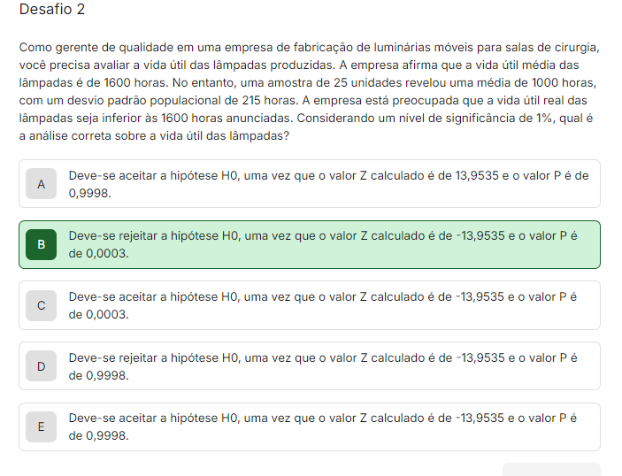 <p>Desafio 2 Como gerente de qualidade em uma empresa de fabricação de luminárias móveis para salas de cirurgia, você precisa avaliar a vida útil das lâmpadas produzidas. A empresa afirma que a vida útil média das lâmpadas é de 1600 horas. No entanto, uma amostra de 25 unidades revelou uma média de 1000 horas, com um desvio padrão populacional de 215 horas. A empresa está preocupada que a vida útil real das lâmpadas seja inferior às 1600 horas anunciadas. Considerando um nível de significância de qual é a análise correta sobre a vida útil das lâmpadas? Deve-se aceitar a hipótese uma vez que O valor Z calculado é de 13,9535 e O valor P é de A 0,9998. Deve-se rejeitar a hipótese HO, uma vez que valor Z calculado é de -13,9535 e valor P é B de 0,0003. Deve-se aceitar a hipótese HO, uma vez que O valor Z calculado é de -13,9535 e O valor P é C de Deve-se rejeitar a hipótese HO, uma vez que valor Z calculado é de -13,9535 e valor P é D de 0,9998. Deve-se aceitar a hipótese uma vez que valor Z calculado é de -13,9535 e valor P é E de 0,9998.</p>
