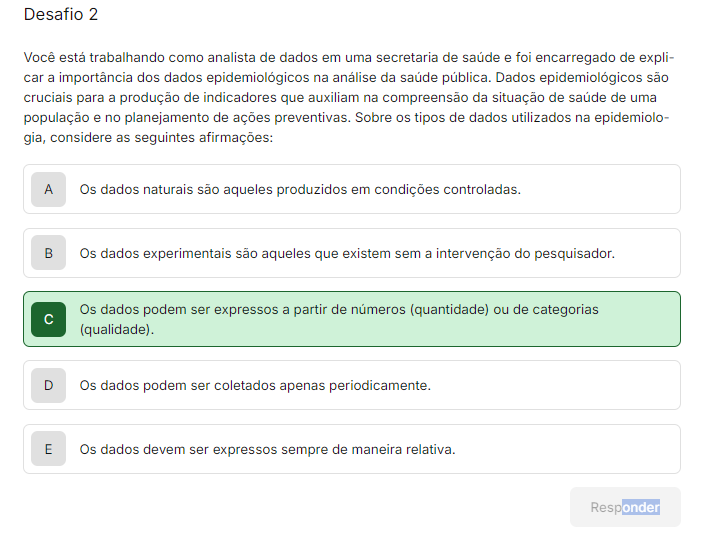 <p>Desafio 2 Você está trabalhando como analista de dados em uma secretaria de saúde e foi encarregado de expli- car a importância dos dados epidemiológicos na análise da saúde pública. Dados epidemiológicos são cruciais para a produção de indicadores que auxiliam na compreensão da situação de saúde de uma população e no planejamento de ações preventivas. Sobre os tipos de dados utilizados na epidemiolo- gia, considere as seguintes afirmações: A Os dados naturais são aqueles produzidos em condições B Os dados experimentais são aqueles que existem sem a intervenção do pesquisador. Os dados podem ser expressos a partir de numeros (quantidade) ou de categorias C (qualidade). D Os dados podem ser coletados apenas periodicamente. E Os dados devem ser expressos sempre de maneira relativa. Responder</p>