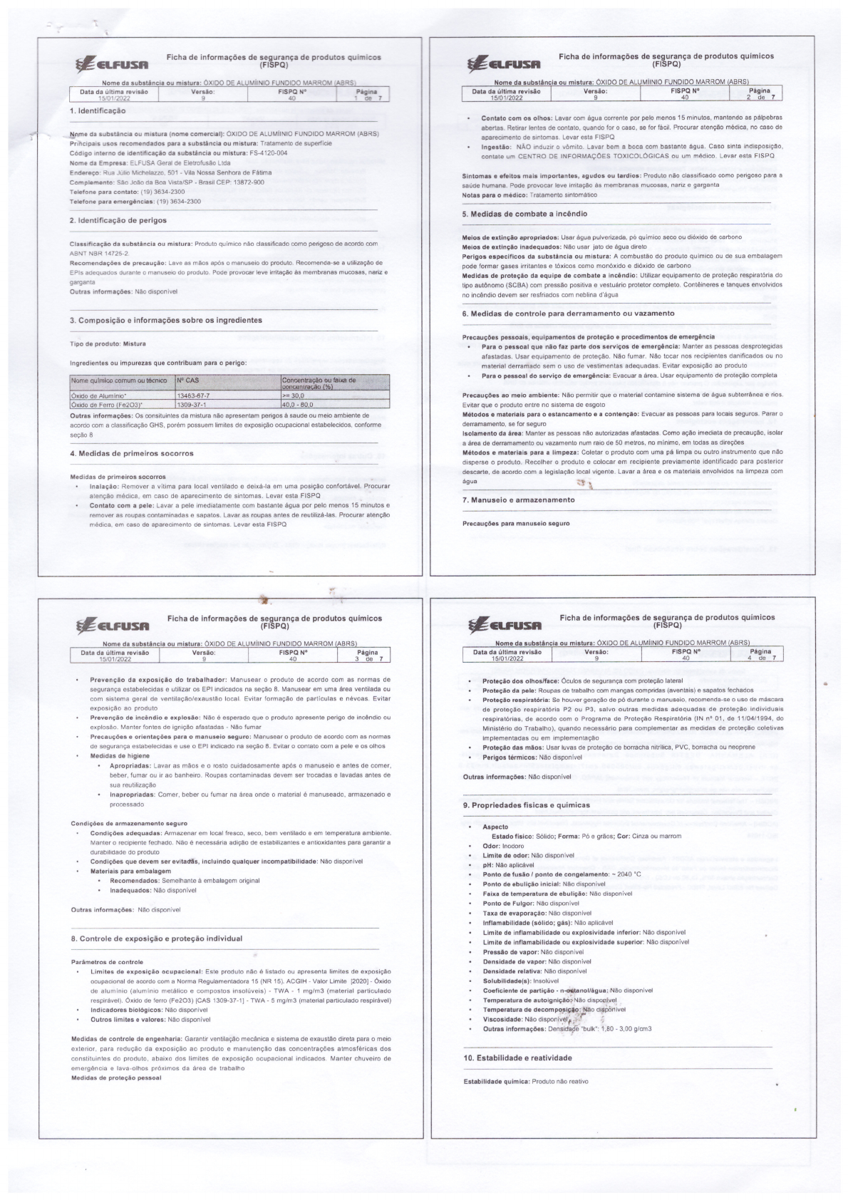 <p>Ficha de informações de segurança de produtos químicos Ficha de informações de segurança de produtos químicos ELFUSA (FISPQ) ELFUSA (FISPQ) Nome da substância ou mistura: ÓXIDO DE ALUMÍINIO FUNDIDO MARROM (ABRS) Nome da substância ou mistura: ÓXIDO DE ALUMÍINIO FUNDIDO MARROM (ABRS) Data da última revisão Versão: Página Data da última revisão Versão: Página 15/01/2022 40 7 15/01/2022 9 40 2 7 1. Identificação Contato com os olhos: Lavar com água corrente por pelo menos 15 minutos, mantendo as pálpebras Retirar lentes de quando for se for Procurar atenção no caso de Name da substância ou mistura (nome comercial): ÓXIDO DE FUNDIDO MARROM (ABRS) aparecimento de Levar esta Principais usos recomendados para a substância ou mistura: Tratamento de superficie Ingestão: NÃO induzir Lavar bem a boca com bastante Caso sinta indisposição, Código interno de identificação da substância ou mistura: FS-4120-004 contate um CENTRO DE INFORMAÇÕES TOXICOLÓGICAS ou um médico. Levar esta Nome da Empresa ELFUSA Geral de Eletrofusão Ltda Endereço: Rua 501 Vila Nossa Senhora de Fátima Sintomas e efeitos mais importantes, agudos ou tardios: Produto não classificado como perigoso para a Complemento: João da Boa Vista/SP Brasil CEP: 13872-900 saúde Pode provocar leve irritação às membranas nariz e garganta Telefone para contato: (19) 3634-2300 Notas para médico: Tratamento sintomático Telefone para emergências: 3634-2300 5. Medidas de combate a incêndio 2. Identificação de perigos Meios de extinção apropriados: Usar água pulverizada. pó químico seco ou dióxido de carbono Classificação da substância ou mistura: Produto não classificado como perigoso de acordo com Meios de extinção Não usar jato de água direto ABNT NBR Perigos da substância ou mistura: A combustão do produto ou de sua embalagem Recomendações de precaução: Lave as mãos após do produto Recomenda-se a utilização de pode formar gases irritantes e tóxicos como monóxido e dióxido de carbono EPIs adequados durante manuseio do produto Pode provocar leve irritação às membranas nariz e Medidas de proteção da equipe de combate a Utilizar equipamento de proteção respiratória do garganta tipo autônomo (SCBA) com pressão positiva e vestuário protetor Contêineres e tanques envolvidos Outras informações: Não disponível no incêndio devem ser resfriados com neblina d'água 6. Medidas de controle para derramamento ou vazamento 3. Composição e informações sobre os ingredientes Precauções equipamentos de proteção e procedimentos de emergência Tipo de produto: Mistura Para pessoa que não faz parte dos serviços de emergência: Manter as pessoas desprotegidas afastadas. Usar equipamento de proteção. Não Não tocar nos recipientes danificados ou no Ingredientes ou impurezas que contribuam para o perigo: material derramado sem uso de vestimentas adequadas. Evitar exposição ao produto Nome comum ou técnico CAS Concentração ou faixa de Para pessoal do serviço de emergência: Evacuar a Usar equipamento de proteção completa concentração (%) Óxido de 13463-67-7 Precauções ao meio ambiente: Não permitir que o material contamine sistema de água subterrânea e rios. Óxido de Ferro 1309-37-1 Evitar que o produto entre no sistema de esgoto Outras Os consituintes da mistura não apresentam perigos à saude ou meio ambiente de Métodos materiais para estancamento e a contenção: Evacuar as pessoas para locais seguros. Parar acordo com a classificação porém possuem limites de exposição ocupacional estabelecidos, conforme se for seguro seção 8 Isolamento da área: Manter as pessoas não autorizadas Como ação imediata de precaução, isolar a área de derramamento ou vazamento num raio de 50 no em todas as direções 4. Medidas de primeiros socorros Métodos e materiais para a limpeza: Coletar produto com uma pá limpa ou outro instrumento que não disperse produto. Recolher produto e colocar em recipiente previamente identificado para posterior descarte, de acordo com a legislação local Lavar a área e os materiais envolvidos na limpeza com Medidas de primeiros socorros água Inalação: Remover a para local ventilado e deixá-la em uma posição Procurar atenção em caso de aparecimento de sintomas. Levar esta FISPQ 7. Manuseio e armazenamento Contato com a pele: Lavar a pele imediatamente com bastante água por pelo menos 15 minutos e remover as roupas contaminadas e sapatos. Lavar as roupas antes de Procurar atenção em caso de aparecimento de Levar esta Precauções para manuseio seguro Ficha de informações de segurança de produtos químicos Ficha de informações de segurança de produtos químicos ELFUSA (FISPQ) ELFUSA (FISPQ) Nome da substância ou mistura: ÓXIDO DE FUNDIDO MARROM (ABRS) Nome da substância ou mistura: ÓXIDO DE ALUMÍINIO FUNDIDO MARROM (ABRS) Data da última revisão Versão: Página Data da última revisão Versão: FISPQ Página 15/01/2022 9 40 3 7 15/01/2022 9 40 4 7 Prevenção da exposição do trabalhador: Manusear o produto de acordo com as normas de Proteção dos olhos/face: Óculos de segurança com proteção lateral segurança estabelecidas e utilizar os EPI indicados na seção 8. Manusear em uma área ventilada ou Proteção da pele: Roupas de trabalho com mangas compridas (aventais) e sapatos fechados com sistema geral de Evitar formação de particulas e Evitar Proteção respiratória: Se houver geração de pó durante o recomenda-se uso de máscara exposição ao produto de proteção respiratória P2 ou P3. salvo outras medidas adequadas de proteção individuais Prevenção de incêndio e Não é esperado que produto apresente perigo de incêndio ou de acordo com o Programa de Proteção Respiratória (IN de do Manter fontes de ignição afastadas Não fumar Ministério do Trabalho), quando necessário para complementar as medidas de proteção coletivas Precauções e orientações para o man