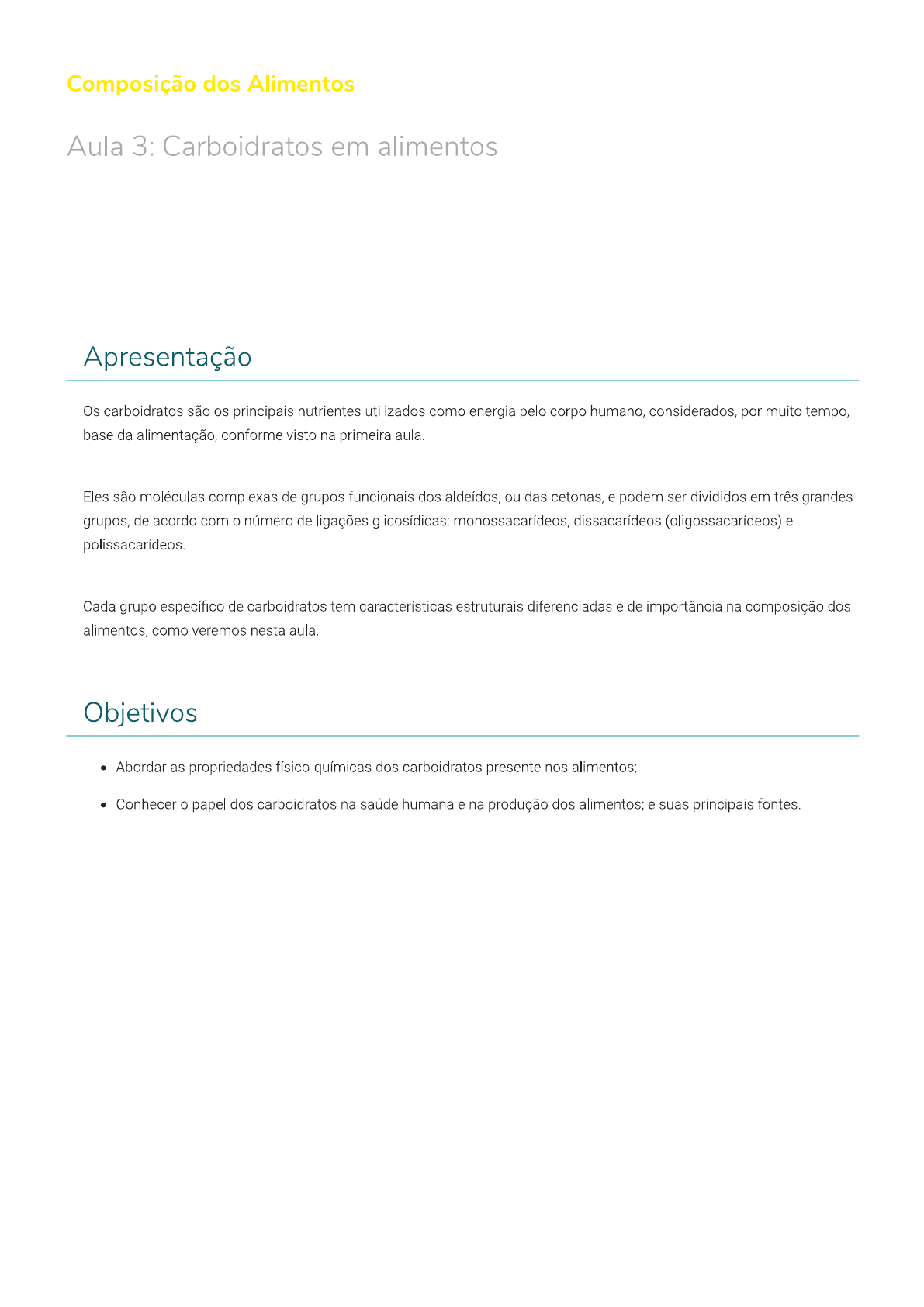 <p>Composição dos Alimentos Aula 3: Carboidratos em alimentos Apresentação Os carboidratos são os principais nutrientes utilizados como energia pelo corpo humano, considerados, por muito tempo, base da alimentação, conforme visto na primeira aula. Eles são moléculas complexas de grupos funcionais dos aldeídos, ou das cetonas, e podem ser divididos em três grandes grupos, de acordo com número de ligações glicosídicas: monossacarídeos, dissacarídeos (oligossacarídeos) e polissacarídeos. Cada grupo específico de carboidratos tem características estruturais diferenciadas e de importância na composição dos alimentos, como veremos nesta aula. Objetivos Abordar as propriedades físico-químicas dos carboidratos presente nos alimentos; Conhecer papel dos carboidratos na saúde humana e na produção dos alimentos; e suas principais fontes.</p><p>Fonte: Shutterstock Monossacarídeos, dissacarídeos e polissacarídeos Os monossacarídeos constituem-se como as unidades básicas formadoras dos carboidratos e, portanto, não podem ser hidrolisados a outros menores, sendo absorvidos pelos enterócitos. Como exemplos têm a glicose, a frutose e a galactose. Já os dissacarídeos são carboidratos formados por dois monossacarídeos. Por exemplo: a sacarose (açúcar comum, de mesa), a lactose (principal carboidrato do leite) e a maltose (amplamente encontrado nos alimentos). Os oligossacarídeos são formadas por 3 a 10 monossacarídeos. Normalmente são carboidratos não digeríveis e que podem ser fermentados pelas bactérias colônicas. Os polissacarídeos são moléculas mais complexas, formadas por mais de 10 moléculas de monossacarídeos, como amido, glicogênio, a celulose e a quitina. Suas principais funções são a capacidade de armazenar energia e de participar da estruturação de tecidos. As propriedades físico-químicas dos carboidratos são a higroscopicidade, estado vítreo, a cristalização, a inversão dos açúcares e poder edulcorante. Observa-se que a capacidade de adsorção de água é uma das suas características mais importantes, e ela depende da sua estrutura, da mistura de isômeros e da sua pureza. Falaremos aqui de algumas das</p><p>propriedades relevantes nos alimentos. Propriedades físico-químicas dos carboidratos Clique no botão acima. Propriedades físico-químicas dos carboidratos Higroscopicidade Para (2005), esta propriedade está relacionada à presença de grupos hidroxilas, que são capazes de se ligarem a água, por meio de pontes de hidrogênio. Açúcares impuros e os xaropes absorvem água em uma velocidade maior do que os açúcares puros. Isso acontece, porque as impurezas dificultam as reações entre as de açúcar, disponibilizando as hidroxilas para interagir com as de água A higroscopicidade dos carboidratos pode ser desejável, ou indesejável, em alimentos. Por exemplo: a manutenção da umidade de produtos de confeitaria, e panificação, pode ser atribuída à presença de carboidratos, que formam uma camada superficial, limitando a perda de água e, portanto, causando um efeito desejável para produto; produtos granulados, e em pó, devido à interação com a água podem formar aglomerados, limitando a solubilidade dos açúcares, o que se torna indesejável. Estado vítreo Ainda para (2005), estado vítreo é o estado amorfo, no qual a viscosidade é tão elevada, que impede a cristalização do açúcar. Ele é pouco estável, podendo ser alcançado por congelamento, concentração rápida ou desidratação. Também se atinge esse estado quando ocorre fusão térmica de determinados açúcares cristalinos, com resfriamento brusco, impedindo que as moléculas se reorganizem e formem cristais. Os açúcares em estado vítreo são higroscópicos, o que contribui para a sua instabilidade, já que, ao reter água, aumentam a sua mobilidade e, consequentemente, a velocidade de cristalização. Um exemplo clássico de carboidratos em estado vítreo são os caramelos duros. Eles são soluções supersaturadas de sacarose, cuja cristalização é impedida pela elevada viscosidade, rigidez da massa, e pela presença de outros açúcares, como a glicose. Cristalização A cristalização dos açúcares ocorre pelo resfriamento de soluções saturadas, que gera uma reorganização das formando-se, assim, um cristal. Os fatores que influenciam nessa formação dos cristais são o grau de saturação da solução original, a temperatura, a natureza da superfície do cristal, e a natureza, e concentração, das impurezas presentes na solução. Quanto mais lento é resfriamento, maior é tamanho dos cristais. Isso é interessante para alguns alimentos, como leite condensado. Ele pode ter a formação de cristais de lactose, conferindo uma textura arenosa, que não é desejável do ponto de vista sensorial. Inversão dos açúcares</p><p>De acordo com os estudos de (2005), basicamente, essa propriedade está relacionada à inversão da sacarose, que se hidrolisa por via enzimática (invertase) e procedimentos como a ação de ácido clorídrico a temperatura elevada. produto final é conhecido como açúcar invertido e encontra-se de forma natural no mel. Essa inversão provoca aumento do sabor doce e, sobretudo, da solubilidade do açúcar, visto que a frutose livre é mais solúvel que a sacarose. Isso é interessante, porque aumenta a concentração de açúcares em uma solução, acentuando o sabor da mesma. Poder edulcorante Os carboidratos têm como principal característica a capacidade de sendo os mais importantes a sacarose, a frutose e os xaropes de amido. Normalmente, o poder edulcorante do açúcar não depende da sua concentração. Mensura-se a intensidade do sabor doce, mediante a determinação do patamar de percepção do sabor, ou por comparação com uma substância de referência, como a sacarose, que se destaca entre as demais, por ser mais agradável. Cabe ressaltar que a intensidade e a qualidade do sabor de