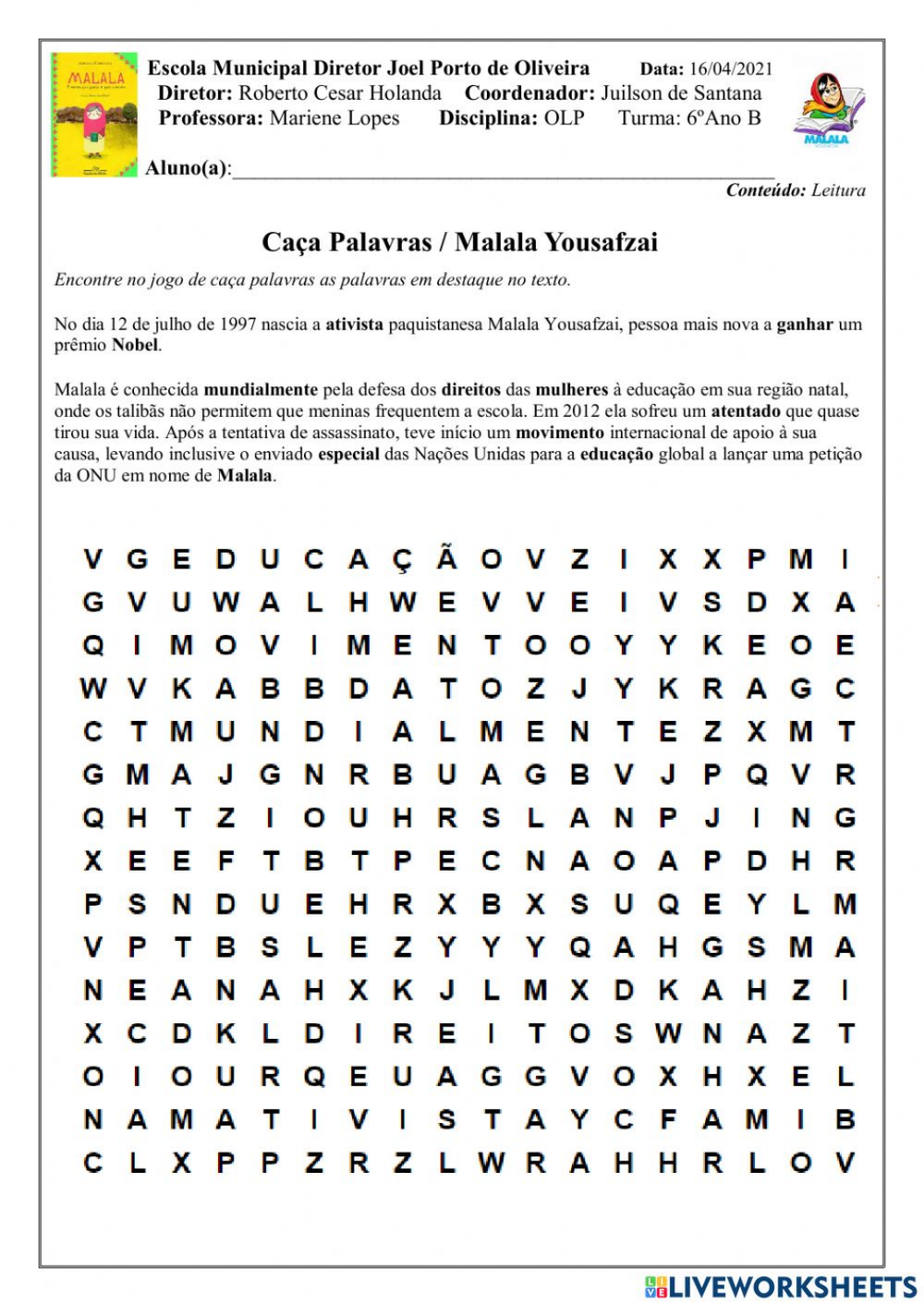 <p>Escola Municipal Diretor Joel Porto de Oliveira Data: 16/04/2021 MALALA Diretor: Roberto Cesar Holanda Coordenador: Juilson de Santana Professora: Mariene Lopes Disciplina: OLP Turma: 6° Ano B MALALA Aluno(a): Conteúdo: Leitura Caça Palavras / Malala Yousafzai Encontre no jogo de caça palavras as palavras em destaque no texto. No dia 12 de julho de 1997 nascia a ativista paquistanesa Malala Yousafzai, pessoa mais nova a ganhar um prêmio Nobel. Malala é conhecida mundialmente pela defesa dos direitos das mulheres à educação em sua região natal, onde os talibãs não permitem que meninas frequentem a escola. Em 2012 ela sofreu um atentado que quase tirou sua vida. Após a tentativa de assassinato, teve início um movimento internacional de apoio à sua causa, levando inclusive o enviado especial das Nações Unidas para a educação global a lançar uma petição da ONU em nome de Malala. CLXPPZRZLWRAHHRLOV</p>