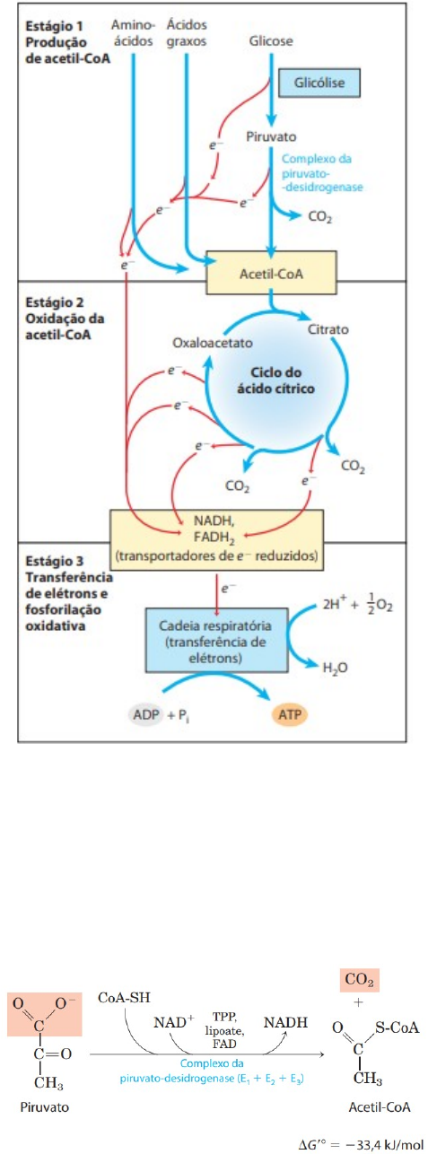 <p>CICLO DE KREBS</p><p>1.0 PRODUÇÃO DO ACETIL-COENZIMA A</p><p>Antes de entrarem no ciclo do ácido cítrico, os esqueletos de carbono dos açúcares e ácidos graxos são convertidos (oxidados) ao grupo acetil da acetil-CoA, a forma na qual a maioria dos combustíveis entra no ciclo. Essa conversão é feita pelo complexo da piruvase-desidrogenase (PDH). A reação geral catalisada pelo PDH é uma descarboxilação oxidativa, um processo de oxidação irreversível no qual o grupo carboxil é removido do piruvato na forma de uma molécula de CO2, e os dois carbonos remanescentes são convertidos ao grupo acetil da acetil-CoA.</p><p>A combinação de desidrogenação e descarboxilação do piruvato ao grupo acetil da acetil-CoA requer a ação sequencial de três enzimas diferentes e cinco coenzimas diferentes ou grupos prostéticos: Pirofosfato de tiamina (TPP); -> coenzima da piruvato-descarboxilase</p><p>Dinucleotídeo de flavina-adenina (FAD); -> transportador de elétrons</p><p>Coenzima A (CoA);</p><p>Dinucleotídeo de nicotinamida-adenina (NAD); -> transportador de elétrons</p><p>Lipoato;</p><p>Quatro vitaminas diferentes essenciais à nutrição humana são componentes vitais desse sistema:</p><p>tiamina (no TPP);</p><p>riboflavina (no FAD);</p><p>niacina (no NAD);</p><p>pantetonato (no CoA)</p><p>1.1 O PDH consiste em três enzimas</p><p>O complexo da PDH contém três enzimas: piruvato-desidrogenase (E1), di-hidrolipoil-transacetilase (E2) e di-hidrolipoil-desidrogenase (E3).</p><p>· E1 catalisa a primeira descarboxilação do piruvato, produzindo hidroxietil-TPP, e então a oxidação do grupo hidroxietil a um grupo acetil. Os elétrons dessa oxidação reduzem o dissulfeto do lipoato ligado a E2, e o grupo acetil é transferido em uma ligação tioéster a um grupo ¬SH do lipoato reduzido.</p><p>· E2 catalisa a transferência do grupo acetil para a coenzima A, formando acetil-CoA.</p><p>· E3 catalisa a regeneração da forma dissulfeto (oxidada) do lipoato; os elétrons passam primeiramente ao FAD, e então ao NAD+</p><p>· Os longos braços de lipoil-lisina movem-se livremente entre o sítio ativo de E1 e os sítios ativos de E2 e E3, prendendo os intermediários ao complexo enzimático e possibilitando a canalização do substrato. c</p><p>· A organização do complexo da PDH é muito similar àquela dos complexos enzimáticos que catalisam a oxidação do a-cetoglutarato e dos a-cetoácidos de cadeia ramificada.</p><p>Áudio – ciclo de Krebs</p><p>Características da mitocôndria:</p><p>- Possui ATP sintase (complexo proteico que participa da síntese de ATP)</p><p>- Tem duas membranas, externa (permeável a moléculas e íons), interna (impermeável ao H+)</p><p>- Cadeia de transporte de elétrons que tem 4 complexos proteicos</p><p>- ATP/ADP translocase</p><p>- Matriz contém: o complexo piruvato desidrogenase; é onde vai ter as enzimas do ciclo do ácido tricarboxílico; enzimas da beta-oxidação; DNA da mitocôndria;</p><p>- Os canais de porina transportam água oxigenada, ela é produzida em situação de stress oxidativo na matriz mitocondrial, a qual passa pela porina para o citosol. Em excesso causa cabelos brancos kkkk.</p><p>É pelo ciclo do ácido tri carboxílico que iremos obter NADH e FADH reduzido. Eles vão carrear prótons e elétrons. Estão acoplados na membrana interna da matriz mitocondrial nos complexos proteicos. Os elétrons que não estiverem acoplados irão reagir com o oxigênio. Esse oxigênio serve como acoplador final de elétrons. H20 está sendo formado.</p><p>Dúvida*(então os complexos são quem vão, em primeira mão acoplar os elétrons, e depois o O2?)</p><p>A reação de transformação do piruvato em acetilcoa é impossível de ser revertida, pois tem um deltaG alto. Não tem outro destino, a acetil-coa vai ter que participar do ciclo do ácido tricarboxílico.</p><p>O piruvato vem do metabolismo do carboidrato da via glicolítica. A complexação do piruvato em acetil-coA ocorre pelo Complexo piruvato desidrogenase – presente na matriz mitocondrial complexo com 3 sítios com a participação: da CoenzimaA, o qual é um carreador de grupos acetilas, de um NAD+ oxidado, Tiamil-pirofosfato e FAD. A AcetilCoa é formada no processo de descarboxilação oxidativa pois se liberou CO2</p><p>A primeira reação do ácido oxálico com acetil-coa gerando citrato.</p><p>A última é a formação do oxaloacetato; Complexo aspartato-malato -> O ácido oxálico não atravessa a membrana interna mitocondrial. Ele precisa desse complexo para participar da gliconeogenese. O “ácido oxálico” (que deve ser o oxaloacetato) pode continuar no ciclo do ácido tricarboxílico ou vira corpo cetônico. Corpo cetônico é alimento, em alta quantidade é tóxico.</p><p>Quais as doenças relacionadas aos corpos cetonicos? Retinopatia, diabetes</p><p>A mais oxidada é guanina, que é um marcador de stress oxidativo. Significa que o DNA está sendo atacado.</p><p>Glutationa</p><p>Pontes de Sulfeto</p><p>ONDE tem MITOCÔNDRIA... tem CADEIA DE TRANSPORTE DE ELÉTRONS e PRODUÇÃO DE ATP, por exemplo no músculo liso</p><p>PRODUÇÃO DE ATP -> PRODUÇÃO DE ELÉTRONS</p><p>ETAPAS DO CICLO</p><p>- Condensação do acetyl-coa com o oxaloacetato</p><p>- Citrato</p><p>Pode ser desviado para produzir triacilgliceróis, porque o alto consumo de doces aumenta os níveis de di-hidroxiacetona-fosfato da via glicolítica e estimula o ciclo do ácido tri carboxílico a produção de citrato. Os TAG são armazenados nos adipócitos.</p><p>-alfa-Ketoglutarato</p><p>Precursor da produção de grupo HEME, esse grupo está presente na Hemoglobina.</p><p>Em um processo de sangramento, está se perdendo hemácias, ou seja, grupos heme, consequentemente o ciclo estará desviando alfa-cetoglutarato.</p><p>-Succinyl-Coa</p><p>“Os lipídios queimam na fogueira dos carboidratos”</p><p>É preciso do carboidrato para metabolizar os lipídios. Em processo de jejum, a b