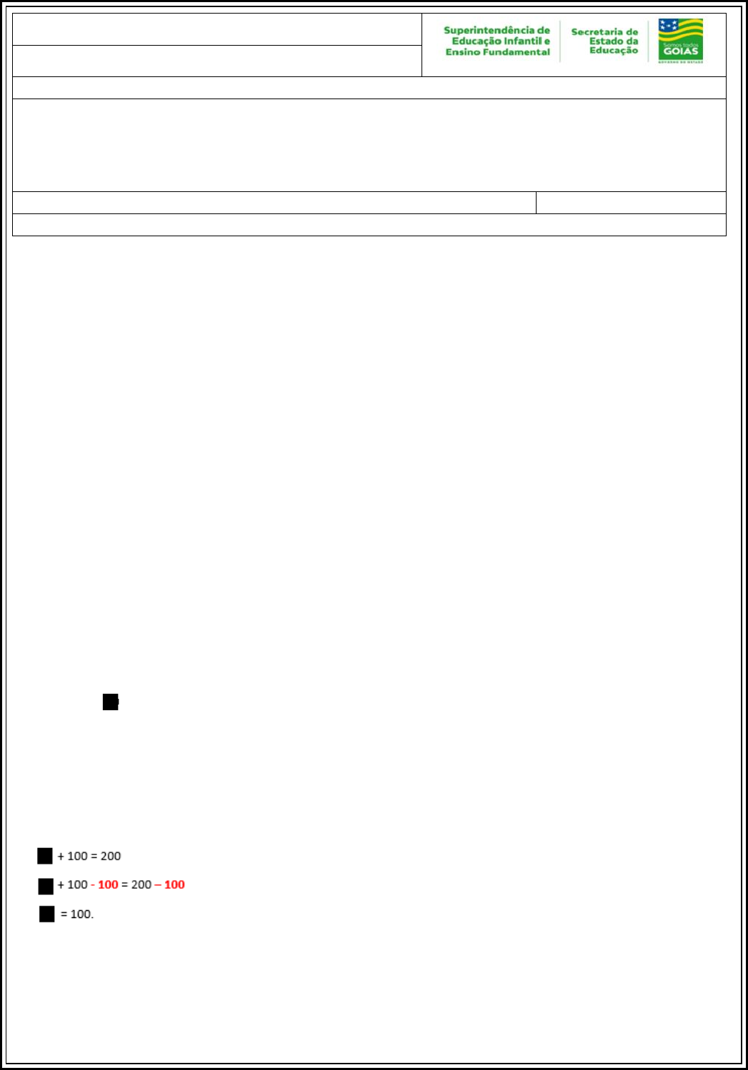<p>1</p><p>Operações inversas a partir de igualdades.</p><p>Em toda igualdade, podemos fazer interpretações usando operações inversas, mantendo</p><p>verdadeira a igualdade.</p><p>Por exemplo, 5 + 4 = 9, nos faz concluir também que</p><p>a) 5 = 9 – 4.</p><p>b) 4 = 9 – 5.</p><p>Isso ocorre por causa das propriedades da igualdade, a saber:</p><p>1) Toda igualdade se mantém, ao adicionarmos ou subtrairmos uma mesma quantidade de</p><p>ambos os lados da igualdade.</p><p>2) Toda igualdade se mantém, ao multiplicarmos ou dividirmos uma mesma quantidade de</p><p>ambos os lados da igualdade. Exceto para o número zero, pois não existe divisão por zero.</p><p>Em nosso exemplo, a partir da igualdade 5 + 4 = 9,</p><p>a) se subtrairmos 4 dos dois lados obtemos 5 = 9 – 4;</p><p>b) se subtrairmos 5 dos dois lados obtemos 4 = 9 – 5.</p><p>Propriedades da Igualdade.</p><p>Seja um valor numérico desconhecido em uma igualdade. Este valor numérico</p><p>desconhecido recebe o nome de incógnita.</p><p>Exemplo 1. Em uma igualdade, se queremos eliminar um número que está sendo adicionado,</p><p>devemos subtrair esse número dos dois lados para que a igualdade permaneça.</p><p>Veja que para descobrir o valor da incógnita, será preciso eliminar o número 100 que está</p><p>sendo adicionado a ele. Assim, para que a igualdade permaneça, deve-se subtrair 100 dos dois</p><p>lados, como segue:</p><p>Exemplo 2. Em uma igualdade, se queremos eliminar um número que está multiplicando,</p><p>devemos dividir os dois lados por esse número para que a igualdade permaneça.</p><p>MATEMÁTICA – 5º ANO</p><p>2ª QUINZENA - 2º CORTE</p><p>Tema/ Conhecimento: Álgebra/Propriedades da igualdade e noções de equivalência</p><p>Habilidades: (EF05MA10) Concluir, por meio de investigações, que a relação de igualdade existente entre</p><p>dois membros permanece ao adicionar, subtrair, multiplicar ou dividir cada um desses membros por um</p><p>mesmo número, para construir a noção de equivalência; (EF05MA11) Ler, interpretar, resolver e elaborar</p><p>problemas cuja conversão em sentença matemática seja uma igualdade com uma operação em que um dos</p><p>termos é desconhecido.</p><p>NOME: DATA:</p><p>UNIDADE ESCOLAR:</p><p>2</p><p>Veja que para descobrir o valor da incógnita, será preciso eliminar o número 4 que está</p><p>multiplicando-o. Assim, para que a igualdade permaneça, deve-se dividir os dois lados por 4,</p><p>como segue:</p><p>Noção de equivalência em igualdades.</p><p>Em todas as igualdades podemos somar ou subtrair a mesma quantidade em ambos os lados,</p><p>como também multiplicar ou dividir pela mesma quantidade os dois membros, desde que seja</p><p>uma quantidade diferente de zero. Essas propriedades das igualdades permitem estabelecer</p><p>equivalências nos cálculos, facilitando a compreensão mesmo em problemas desafiadores,</p><p>como os famosos desafios matemáticos figurados do WhatsApp.</p><p>Observe o desafio figurado a seguir:</p><p>Qual seria o valor da maçã?</p><p>Nesta igualdade ao retirarmos uma pêra, uma maçã e 7 de cada lado, obtemos uma</p><p>igualdade equivalente mais fácil de analisar.</p><p>Veja:</p><p>De um lado da igualdade teremos o 9, e do outro lado, três maçãs. Assim, dividindo-se</p><p>ambos os lados por 3, temos que cada maçã equivale a 3. Logo, se cada maça equivale a 3,</p><p>então:</p><p>3 + 3 + 3 = 9</p><p>3</p><p>Agora é sua vez! Responda as atividades a seguir.</p><p>01. Complete os quadros A, B, C, D, E no circuito a seguir, com os números que satisfazem as</p><p>operações indicadas pelas setas:</p><p>02. Uma pirâmide é numérica se o valor de um quadradinho for igual à soma dos dois</p><p>quadradinhos logo abaixo. Sabendo que as pirâmides a seguir são numéricas, calcule o</p><p>valor dos quadradinhos abaixo.</p><p>a)</p><p>b)</p><p>c)</p><p>03. Calcule o valor da incógnita em cada caso:</p><p>__________________________________________________________________________</p><p>__________________________________________________________________________</p><p>__________________________________________________________________________</p><p>__________________________________________________________________________</p><p>39</p><p>22</p><p>15</p><p>38 42</p><p>13 20</p><p>12 13</p><p>4</p><p>04. Observe a imagem a seguir:</p><p>Qual é o valor de cada laranja?</p><p>(A) 2</p><p>(B) 3</p><p>(C) 5</p><p>(D) 6</p><p>05. Observe a tabela a seguir:</p><p>Sabendo que o total de alunos inscritos é 324, responda:</p><p>a) Qual é o número de inscrições para Natação?</p><p>__________________________________________________________________________</p><p>__________________________________________________________________________</p><p>b) Quais atividades esportivas têm mesma quantidade de equipes, ao dividir o número de</p><p>inscrições pela quantidade de alunos por equipe?</p><p>__________________________________________________________________________</p><p>__________________________________________________________________________</p><p>__________________________________________________________________________</p><p>06. Eu tenho 10 anos. Minha irmã tem metade da minha idade. Meu pai tem</p><p>o triplo da soma da minha idade com a idade da minha irmã. Minha mãe</p><p>é 10 anos mais jovem que meu pai. Então, a idade da minha mãe é</p><p>(A) 25 anos.</p><p>(B) 30 anos.</p><p>(C) 35 anos.</p><p>(D) 40 anos.</p><p>5</p><p>07. Observe a imagem a seguir:</p><p>Qual das balanças está com marcação errada?</p><p>(A) Balança 1</p><p>(B) Balança 2</p><p>(C) Balança 3</p><p>(D) Balança 4</p><p>08. O sucessor do número 8 é triplo de um número. Esse número é __________.</p><p>09. O dobro de um número é o antecessor de 15. Esse número é ____________.</p>