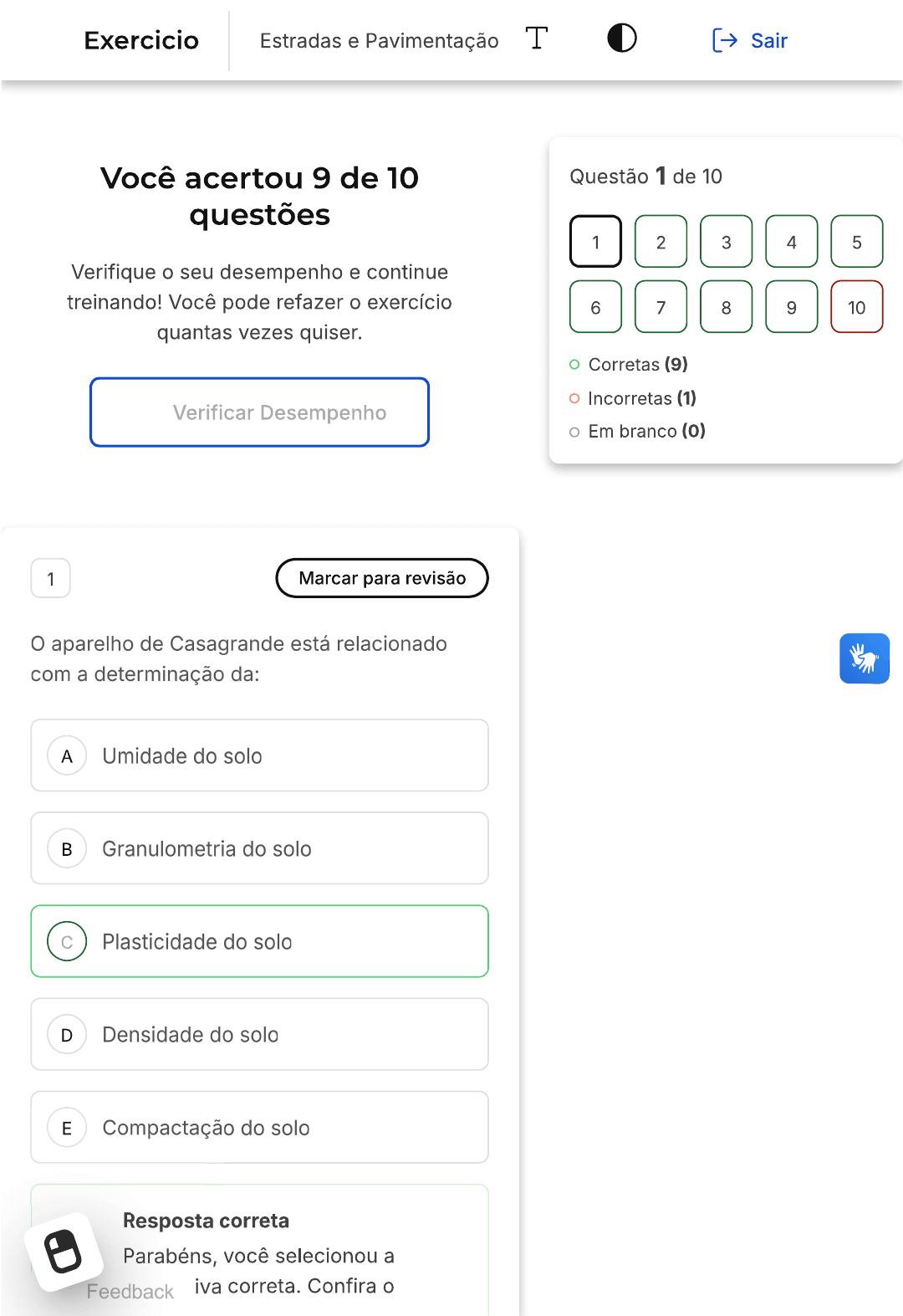 <p>Exercicio Estradas e Pavimentação T Sair Você acertou 9 de 10 Questão 1 de 10 questões 1 2 3 4 5 Verifique o seu desempenho e continue treinando! Você pode refazer o exercício 6 7 8 9 10 quantas vezes quiser. Corretas (9) Incorretas (1) Verificar Desempenho Em branco (0) 1 Marcar para revisão aparelho de Casagrande está relacionado com a determinação da: A Umidade do solo B Granulometria do solo C Plasticidade do solo D Densidade do solo E Compactação do solo Resposta correta Parabéns, você selecionou a Feedback iva correta. Confira o</p><p>gabarito comentado! Gabarito Comentado aparelho de Casagrande é um instrumento utilizado em geotecnia para determinar a plasticidade do solo. A plasticidade é uma propriedade que indica a capacidade do solo de se deformar sem se romper, quando submetido a uma força. Portanto, a alternativa correta é a "C", que afirma que o aparelho de Casagrande está relacionado com a determinação da plasticidade do solo. 2 Marcar para revisão Após 7 dias da execução de uma sub-base estabilizada com cimento (solo-cimento), um corpo de prova é compactado em um equipamento de resistência à compressão simples. Se uma carga de ruptura de 1000kg é aplicada sobre um corpo de prova com diâmetro de 100mm, então a decisão do fiscal com relação a essa sub-base é que: A camada deve ser aceita, não A obedece à faixa de resistência necessária entre 3,5 e 5,0MPa A camada não deve ser aceita, porque B não obedece à faixa de resistência necessária entre 5,0 e 7,0 MPa</p><p>A camada não deve ser aceita, porque C não obedece à faixa de resistência necessária entre 3,5 e 5,0MPa A camada deve ser aceita, porque D obedece à faixa de resistência necessária entre 1,4 e 2,1MPa A camada não deve ser aceita, porque E não obedece à faixa de resistência necessária entre 1,4 e 2,1MPa Resposta correta Parabéns, você selecionou a alternativa correta. Confira o gabarito comentado! Gabarito Comentado A alternativa correta é a letra E. A questão aborda a resistência à compressão de uma sub-base estabilizada com cimento. A carga de ruptura aplicada sobre o corpo de prova é de 1000kg e o diâmetro do corpo de prova é de 100mm. A resistência à compressão é um indicador importante para determinar se a camada de sub-base é adequada ou não. No caso apresentado, a resistência à compressão não está dentro da faixa necessária de 1,4 a 2,1MPa, portanto, a camada não deve ser aceita. Isso significa que a sub-base não possui a resistência necessária para suportar as cargas aplicadas, o que pode levar a falhas estruturais no futuro.</p><p>3 Marcar para revisão Um solo siltoso possui LL = 35% e LP= 15%. A umidade com que esse solo passa do estado líquido para o estado plástico é: A 30% B 50% C 10% D 15% E 20% Resposta correta Parabéns, você selecionou a alternativa correta. Confira o gabarito comentado! Gabarito Comentado solo siltoso em questão possui um Limite de Liquidez (LL) de 35% e um Limite de Plasticidade (LP) de 15%. A umidade com que esse solo passa do estado líquido para o estado plástico é a diferença entre o LL e o LP, ou seja, 35% 15% = Portanto, a alternativa correta é a letra E, que indica</p><p>4 Marcar para revisão conceito cujo estudo é utilizado para dimensionar pavimentos rígidos é: A Erosão B Número estrutural C Umidade ótima D Granulometria E Eixo simples padrão Resposta correta Parabéns, você selecionou a alternativa correta. Confira o gabarito comentado! Gabarito Comentado conceito utilizado para dimensionar pavimentos rígidos é o "Número estrutural". Este conceito é fundamental na engenharia de pavimentos, pois permite determinar a capacidade de carga de um pavimento e, consequentemente, seu dimensionamento adequado. Portanto, a alternativa correta é a B: "Número estrutural".</p><p>5 Marcar para revisão Uma estabilização granulométrica de solo com brita 0 apresentou um CBR de 30%. Ela é então adequada para ser aplicada em: A Pavimentação asfáltica B Base de pavimento asfáltico C Sub-base de pavimento de concreto D Sub-base de pavimento asfáltico E Pavimento flexível Resposta correta Parabéns, você selecionou a alternativa correta. Confira o gabarito comentado! Gabarito Comentado A estabilização granulométrica de solo com brita 0, que apresentou um CBR de 30%, é adequada para ser aplicada como sub- base de pavimento asfáltico. CBR (California Bearing Ratio) é um índice que indica a resistência do solo e é utilizado para classificar o solo quanto à sua adequação para uso em camadas de pavimentação. Neste caso, um CBR de indica que o solo é adequado para como sub-base em pavimentos que é a camada que fica logo</p><p>abaixo da base e acima do subleito, servindo para distribuir os esforços aplicados ao pavimento. 6 Marcar para revisão Em um ensaio de penetração em uma amostra de solo, compactada na energia normal, pede- se para calcular o CBR do solo, sabendo que para se penetrar 2,54mm foi obtida a carga de 123kg com um diâmetro do pistão de 4,97cm. Dados: Penetração Pressão padrão (kg/cm2) 0,1" = 2,54mm 70,31 0,2" = 5,08mm 105,46 Elaborada por Giuseppe Miceli Junior Com o resultado, assinale a camada de pavimentação que este solo não pode ser utilizado. A Subleito B Corpo de aterro C Reforço do subleito D Sub-base Imprimação</p><p>Resposta correta Parabéns, você selecionou a alternativa correta. Confira o gabarito comentado! Gabarito Comentado solo em questão não pode ser utilizado na camada de sub-base. CBR (California Bearing Ratio) é um índice que indica a capacidade de suporte de um solo quando submetido a uma carga. No caso apresentado, o solo não atende aos requisitos necessários para ser utilizado na camada de sub-base, que exige um CBR maior. Portanto, a alternativa correta é a "Sub-base". 7 Marcar para revisão A um solo é acrescentado emulsão asfáltica. Além da melhoria da capacidade de suporte, que característ