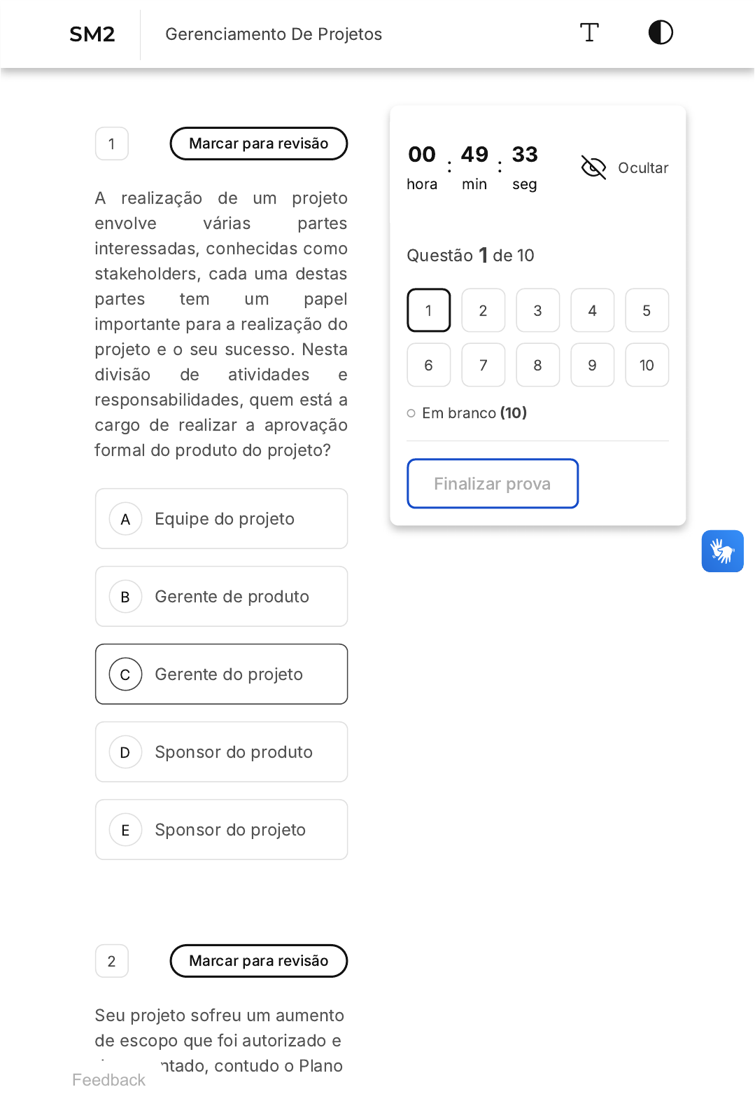 <p>A</p><p>B</p><p>C</p><p>D</p><p>E</p><p>1 Marcar para revisão</p><p>A realização de um projeto</p><p>envolve várias partes</p><p>interessadas, conhecidas como</p><p>stakeholders, cada uma destas</p><p>partes tem um papel</p><p>importante para a realização do</p><p>projeto e o seu sucesso. Nesta</p><p>divisão de atividades e</p><p>responsabilidades, quem está a</p><p>cargo de realizar a aprovação</p><p>formal do produto do projeto?</p><p>Equipe do projeto</p><p>Gerente de produto</p><p>Gerente do projeto</p><p>Sponsor do produto</p><p>Sponsor do projeto</p><p>2 Marcar para revisão</p><p>Seu projeto sofreu um aumento</p><p>de escopo que foi autorizado e</p><p>documentado, contudo o Plano</p><p>00</p><p>hora</p><p>: 49</p><p>min</p><p>: 33</p><p>seg</p><p>Ocultar</p><p>Questão 1 de 10</p><p>Em branco �10�</p><p>Finalizar prova</p><p>1 2 3 4 5</p><p>6 7 8 9 10</p><p>Feedback</p><p>SM2 Gerenciamento De Projetos</p><p>A</p><p>B</p><p>C</p><p>D</p><p>E</p><p>de Gerenciamento do Projeto</p><p>teve que ser atualizado. Para</p><p>quais pessoas esse novo plano</p><p>deverá ser enviado?</p><p>A todas as partes</p><p>envolvidas no projeto.</p><p>À equipe do projeto</p><p>que é responsável</p><p>pela execução do</p><p>projeto.</p><p>O plano de</p><p>gerenciamento do</p><p>projeto atualizado não</p><p>deve ser enviado a</p><p>ninguém.</p><p>Aos executivos da</p><p>empresa que</p><p>autorizaram o</p><p>aumento do escopo.</p><p>A todas as pessoas</p><p>indicadas no Plano de</p><p>Gerenciamento das</p><p>Comunicações.</p><p>3 Marcar para revisão</p><p>Em se tratando de conflitos em</p><p>um projeto, qual a afirmativa</p><p>abaixo está correta?</p><p>A</p><p>B</p><p>C</p><p>D</p><p>E</p><p>O conflito pode ser</p><p>benéfico ao projeto.</p><p>Qualquer conflito na</p><p>equipe do projeto</p><p>deve ser solucionado</p><p>pelo gerente de</p><p>projetos.</p><p>Conflitos em projetos</p><p>devem ser ignorados,</p><p>apenas o objetivo final</p><p>do projeto deve ser</p><p>considerado.</p><p>O conflito só acontece</p><p>por incompetência do</p><p>gerente de projetos.</p><p>Para solução de um</p><p>conflito no projeto</p><p>toda a equipe deve</p><p>ser consultada.</p><p>4 Marcar para revisão</p><p>Quando falamos em Plano de</p><p>Resposta aos Riscos, podemos</p><p>afirmar que:</p><p>A</p><p>B</p><p>C</p><p>D</p><p>E</p><p>Os Riscos que devem</p><p>ser objeto de tratativa</p><p>no Plano limitam-se</p><p>àqueles que podem</p><p>trazer prejuízo ao</p><p>Projeto.</p><p>No Plano de resposta</p><p>aos Riscos devem ser</p><p>incluídos todos os</p><p>Riscos identificados.</p><p>No que se refere às</p><p>estratégias para lidar</p><p>com o Risco, quando</p><p>falamos em Prevenir</p><p>estamos falando em</p><p>diminuir a</p><p>probabilidade de</p><p>ocorrência.</p><p>Quando falamos em</p><p>mitigar um Risco</p><p>estamos falando de</p><p>diminuir a</p><p>probabilidade do</p><p>Risco se materializar.</p><p>Compartilhar um</p><p>Risco significa</p><p>garantir a</p><p>materialização de um</p><p>risco positivo.</p><p>5 Marcar para revisão</p><p>A</p><p>B</p><p>C</p><p>D</p><p>E</p><p>Quando dizemos que Risco é</p><p>uma condição incerta, significa</p><p>que:</p><p>O Risco está sempre</p><p>associado a uma</p><p>Probabilidade. Assim,</p><p>pode ou não se</p><p>materializar.</p><p>Os Riscos, uma vez</p><p>identificados com</p><p>precisão, têm uma</p><p>grande probabilidade</p><p>de se materializar.</p><p>A incerteza quanto à</p><p>ocorrência significa o</p><p>desconhecimento</p><p>quanto à gravidade do</p><p>impacto.</p><p>O Risco pode ter um</p><p>impacto negativo ou</p><p>positivo no Projeto.</p><p>O Risco é muito</p><p>relativo e depende do</p><p>tipo de Contrato feito</p><p>entre as partes.</p><p>6 Marcar para revisão</p><p>Sobre o processo de</p><p>Monitoramento e Controle dos</p><p>A</p><p>B</p><p>C</p><p>Riscos, podemos dizer que:</p><p>Uma vez os Riscos</p><p>identificados,</p><p>priorizados e incluídos</p><p>no Plano de</p><p>Respostas, podemos</p><p>entender que o</p><p>Processo está</p><p>completo.</p><p>Os Riscos devem ser</p><p>identificados o mais</p><p>cedo possível no Ciclo</p><p>do Projeto, pois uma</p><p>vez identificados,</p><p>estes Riscos não</p><p>mudam durante a</p><p>execução.</p><p>Cada Risco</p><p>identificado, em</p><p>algum momento, se</p><p>transformará em uma</p><p>Questão a ser</p><p>resolvida, daí a</p><p>importância do</p><p>Monitoramento e</p><p>Controle.</p><p>D</p><p>E</p><p>A</p><p>B</p><p>C</p><p>É na fase de Proposta</p><p>que todos os Riscos</p><p>são efetivamente</p><p>identificados, pois de</p><p>outra forma não</p><p>haveria como</p><p>considerar no</p><p>Orçamento.</p><p>O Monitoramento e</p><p>Controle dos Riscos</p><p>deve ser contínuo,</p><p>mesmo porque, por se</p><p>tratar de um processo</p><p>dinâmico, Riscos</p><p>novos podem surgir.</p><p>7 Marcar para revisão</p><p>Das opções abaixo, assinale</p><p>qual representa um evento</p><p>Scrum que possui o propósito</p><p>de inspecionar o incremento do</p><p>produto ao fim da sprint:</p><p>Reunião de projeto</p><p>Reunião diária</p><p>Reunião de revisão</p><p>D</p><p>E</p><p>A</p><p>B</p><p>C</p><p>D</p><p>E</p><p>Reunião de</p><p>retrospectiva</p><p>Reunião de</p><p>planejamento</p><p>8 Marcar para revisão</p><p>O SCRUM considera que o</p><p>conhecimento vem através da</p><p>experiência, este método de</p><p>gestão possui valores e pilares.</p><p>São pilares do SCRUM�</p><p>Adaptação,</p><p>comprometimento e</p><p>coragem.</p><p>Inspeção,</p><p>transparência e foco.</p><p>Adaptação,</p><p>transparência e</p><p>inspeção.</p><p>Inspeção, adaptação</p><p>e respeito.</p><p>Agilidade,</p><p>transparência e foco.</p><p>A</p><p>B</p><p>9 Marcar para revisão</p><p>O gerenciamento de custos é</p><p>uma atividade chave para o</p><p>sucesso de um projeto, uma</p><p>vez que um gerenciamento de</p><p>custos bem feito pode garantir</p><p>o suc