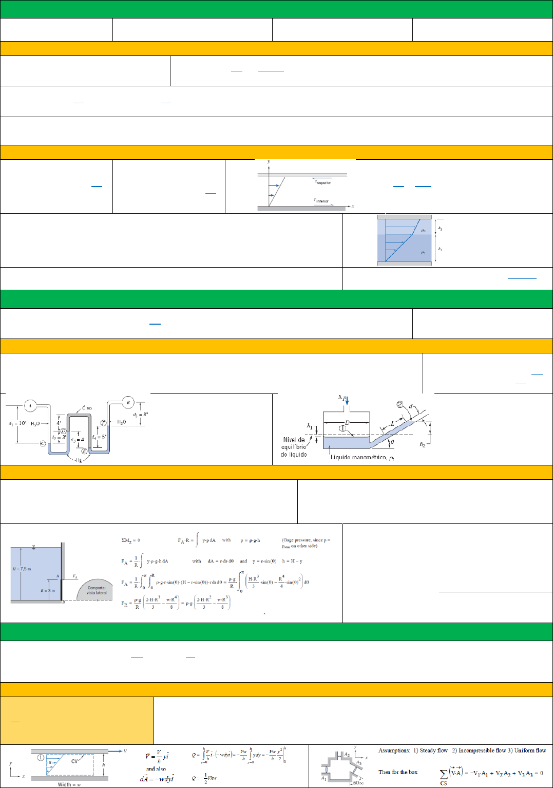 <p>CAPÍTULO 2 – CONCEITOS FUNDAMENTAIS</p><p>Densidade</p><p>Absoluta ρ = m/Ɐ</p><p>Densidade</p><p>Relativa SGx = ρx/ρH2O</p><p>Peso</p><p>Específico γ = ρg</p><p>Regime</p><p>Permane ∂n/∂t = 0 ‘n’ é qlq</p><p>propr.</p><p>- LINHAS DE CORRENTE, TRAJETÓRIAS E LINHAS DE EMISSÃO</p><p>Campos de</p><p>Veloc. �⃗� = 𝑢𝑖̂ + 𝑣𝑗̂ + 𝑤�̂�</p><p>Linhas de</p><p>Corrente</p><p>𝑑𝑦</p><p>𝑑𝑥</p><p>=</p><p>𝑣(𝑥,𝑦)</p><p>𝑢(𝑥,𝑦)</p><p>1) Separar as variáveis da edo</p><p>2) Integrar indefinidamente e obter função y(x)</p><p>3) Substituir o ponto (x,y) pedido na formula p obter a cte C</p><p>Trajetórias</p><p>𝑑𝑥</p><p>𝑑𝑡</p><p>= 𝑢(𝑥, 𝑦, 𝑡)</p><p>𝑑𝑦</p><p>𝑑𝑡</p><p>= 𝑣(𝑥, 𝑦, 𝑡)</p><p>1) separar as variáveis x,y e t da edo</p><p>2) integrar indefinidamente (caso só trajetória), ou de xo a x e to a t, e obtenha x(t) e y(t)</p><p>3) substitua os valores de (x,y) para to dado e obtenha as ctes ‘C’ de cada eq.</p><p>Linhas de</p><p>Emissão</p><p>Xle(to) = xp(t,xo,yo,to)</p><p>yle(to) = yp(t,xo,yo,to)</p><p>1) Pegar as eq. da trajetória obtidas por integração definida de xo/yo a x/y e to a t</p><p>2) Substituir (x,y) em t=? dado no exercício obtendo assim as eq xle e yle</p><p>- VISCOSIDADE E TENSÃO DE CISALHEMENTO</p><p>Fluido</p><p>De</p><p>Newton</p><p>τxy = μ</p><p>𝑑𝑢</p><p>𝑑𝑦</p><p>Fluido Não</p><p>Newtoniano</p><p>τxy =</p><p>η</p><p>𝑑𝑢</p><p>𝑑𝑦</p><p>𝑑𝑢</p><p>𝑑𝑦</p><p>=</p><p>𝑉−0</p><p>ℎ−0</p><p>*Se for dado a equação do</p><p>perfil de velocidades é só</p><p>deriva-la em função da coord.</p><p>apropriada relacionada à</p><p>altura do canal.</p><p>Força Cisalhante</p><p>Devido ao fluido</p><p>F = τxy As</p><p>As é a área superficial que está</p><p>diretamente em contato com o fluido</p><p>A tensão cisalhante</p><p>na interface dos</p><p>fluidos é a mesma</p><p>p/ ambos e a veloc</p><p>também.</p><p>Tensão Superficial σ [N/m]</p><p>A força devido a tensão sup. é vezes</p><p>uma grandeza de comprimento Ascensão Capilar h =</p><p>2𝜎𝑐𝑜𝑠𝜃</p><p>𝜌𝑔𝑅</p><p>CAPÍTULO 3 – ESTÁTICA DOS FLUIDOS</p><p>Eq. Básica da Estática</p><p>dos Fluidos</p><p>𝑑𝑝</p><p>𝑑𝑧</p><p>= -ρg</p><p>1) Fluido estático</p><p>2) Gravidade como única força de campo</p><p>3) Eixo z vertical e positivo p/ cima</p><p>Pmanométrica = pabsoluta - patm</p><p>- VARIAÇÃO DE PRESSÃO EM FLUIDO ESTÁTICO</p><p>Líquidos</p><p>Incompressíveis</p><p>Δp = ρgh</p><p>Δp = g∑ρihi</p><p>1) Quaisquer 2 pontos a mesma altura em um volume contínuo do</p><p>mesmo liq. têm a mesma pressão</p><p>2) A pressão cresce à medida que desce na coluna de líquido</p><p>Gases</p><p>p = ρRT</p><p>p = p0(</p><p>𝑇</p><p>𝑇𝑜</p><p>)</p><p>𝑔</p><p>𝑚𝑅</p><p>Diferença de pressão PA – PB :</p><p>pC = pA + ρH2Ogd1</p><p>pD = pC - ρHggd2</p><p>pE = pD + ρoilgd3</p><p>pF = pE - ρHggd4</p><p>pB = pF - ρH2Ogd5</p><p>só substituir e isolar pA - pB</p><p>Expressão para L:</p><p>p1 – p2 = Δp = ρg(h1 + h2)</p><p>Mesmo volume do liq.:</p><p>πD²h1/4 = πd²L/4 h1 =</p><p>L(d/D)²</p><p>Δp = ρgL [senθ + (d/D)²]</p><p>- FORÇAS HIDROSTATICAS SOBRE SUPERFICIES SUBMERSAS</p><p>Forças Hidrostática</p><p>sobre Sup. Plana</p><p>FR = ∫ pdA</p><p>FR = pcA</p><p>pc = pressão no centroide</p><p>A = área da sup. submersa</p><p>Localização</p><p>da</p><p>Força</p><p>y’ = yc + ρgsenθ Ixx/FR</p><p>Caso patm aja dos 2 lados</p><p>y’ = yc + Ixx/Ayc</p><p>y’FR = ∫ ypdA</p><p>x’ = xc + ρgsenθ Ixy/FR</p><p>Caso patm aja dos 2 lados</p><p>x’ = xc + Ixy/Ayc</p><p>x’FR = ∫ xpdA</p><p>Forças</p><p>Hidrostaticas</p><p>sobre Sup. Curvas</p><p>FV = ∫ ρgdⱯ</p><p>FV = ρgⱯ</p><p>Qdo patm atua dos dois lados, Fv</p><p>é igual ao peso do fluido</p><p>diretamente acima da</p><p>superfície.</p><p>FH = pcA</p><p>FH e sua localização são = p/</p><p>uma sup plana vertical</p><p>imaginaria de mesma área</p><p>CAPITULO 4 – EQUAÇÕES INTEGRAIS BASICAS PARA UM VOLUME DE CONTROLE</p><p>Equação de</p><p>Transporte</p><p>de Reynolds</p><p>𝑑𝑁</p><p>𝑑𝑡</p><p>)sistema =</p><p>𝜕</p><p>𝜕𝑡</p><p>∫ 𝜂𝜌𝑑Ɐ + ∫ 𝜂𝜌�⃗� ∙ 𝑑𝐴</p><p>.</p><p>𝑆𝐶</p><p>.</p><p>𝑉𝐶</p><p>① ② ③</p><p>① taxa de variação da prop. N do sistema</p><p>② taxa de variação da qtde da prop. N dentro do VC</p><p>③ taxa na qual a prop. N está saindo da sup. do VC</p><p>- CONSERVAÇÃO DE MASSA (CONTINUIDADE)</p><p>𝜕</p><p>𝜕𝑡</p><p>∫ 𝜌𝑑Ɐ + ∫ 𝜌�⃗� ∙ 𝑑𝐴</p><p>.</p><p>𝑆𝐶</p><p>.</p><p>𝑉𝐶</p><p>= 0</p><p>Casos</p><p>Especiais</p><p>1) Fluidos Incompressível e VC</p><p>não deformável (Ɐ=cte)</p><p>∫ �⃗� ∙ 𝑑𝐴</p><p>.</p><p>𝑆𝐶</p><p>= 0</p><p>Caso veloc</p><p>uniforme</p><p>∑ �⃗� ∙ 𝑑𝐴 𝑆𝐶 = 0</p><p>2) Fluidos</p><p>Compressíveis e</p><p>regime permanente</p><p>∫ 𝜌𝑉⃗⃗⃗⃗ ⃗ ∙ 𝑑𝐴</p><p>.</p><p>𝑆𝐶</p><p>= 0</p><p>Se veloc uniform</p><p>∑ 𝜌𝑉⃗⃗⃗⃗ ⃗ ∙ 𝑑𝐴 𝑆𝐶 = 0</p><p>- EQUAÇÃO DA QUANTIDADE DE MOVIMENTO P/ VOLUME DE CONTROLE INERCIAL (ESTÁCIONARIO)</p><p>Fx = FSx + FBx =</p><p>𝜕</p><p>𝜕𝑡</p><p>∫ 𝑢 𝜌𝑑Ɐ + ∫ 𝑢 𝜌(�⃗� ∙ 𝑑𝐴 )</p><p>.</p><p>𝑆𝐶</p><p>.</p><p>𝑉𝐶</p><p>Fy = FSy + FBy =</p><p>𝜕</p><p>𝜕𝑡</p><p>∫ 𝑣 𝜌𝑑Ɐ + ∫ 𝑣 𝜌(�⃗� ∙ 𝑑𝐴 )</p><p>.</p><p>𝑆𝐶</p><p>.</p><p>𝑉𝐶</p><p>‘FS’: forças de superfície – pode ser devido à</p><p>pressão, reações e atrito (cisalhamento/arrasto):</p><p>Fp = ∫𝑝𝑑𝐴 sempre atua SOBRE o VC.</p><p>‘FB’: forças de campo – em</p><p>geral é a gravidade (peso).</p><p>Fp = ∫𝑝𝑔 𝑑∀⃗⃗ atua em -y</p><p>Passo</p><p>a Passo</p><p>Análise</p><